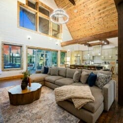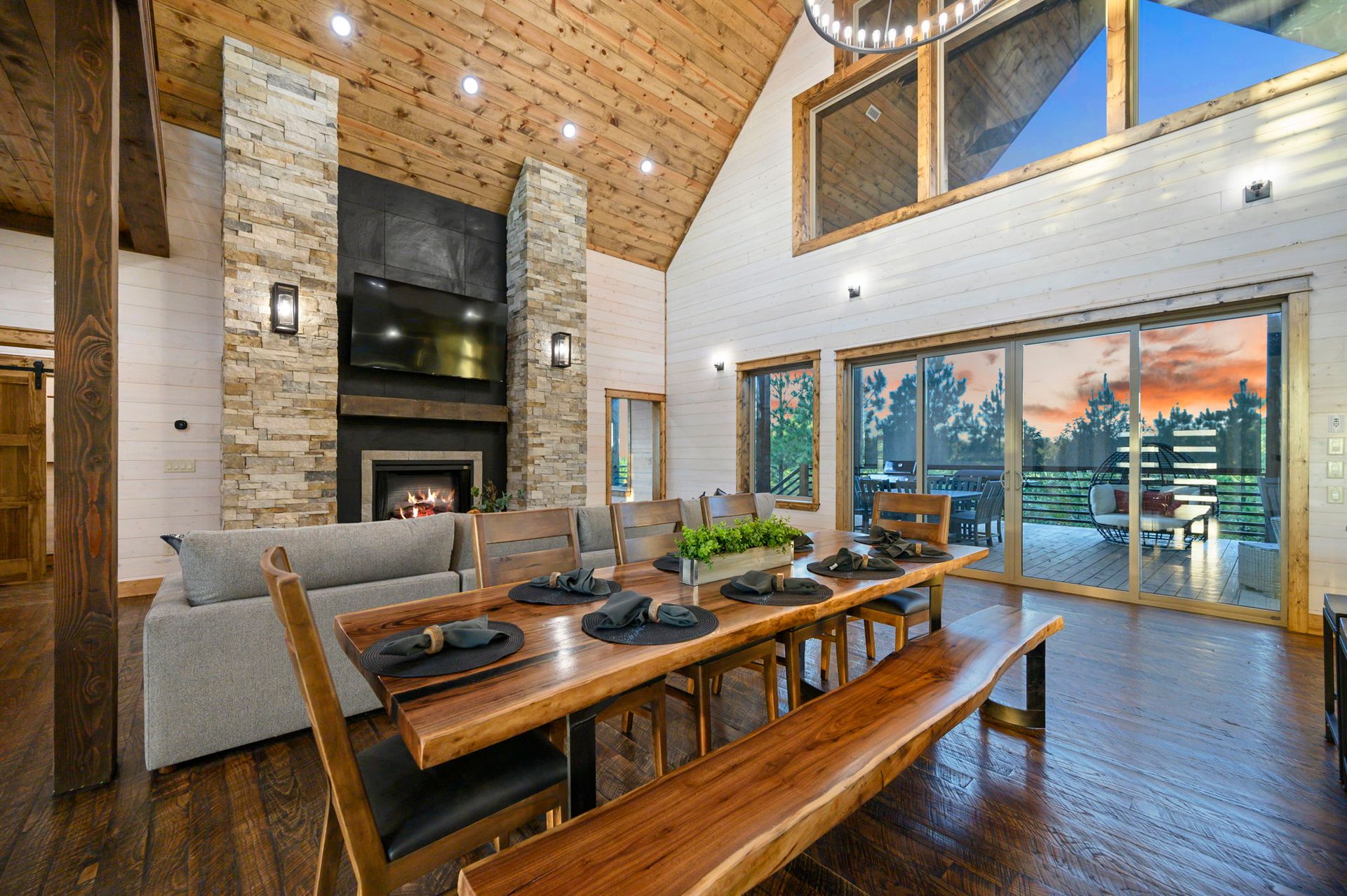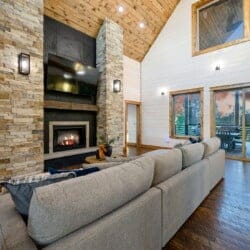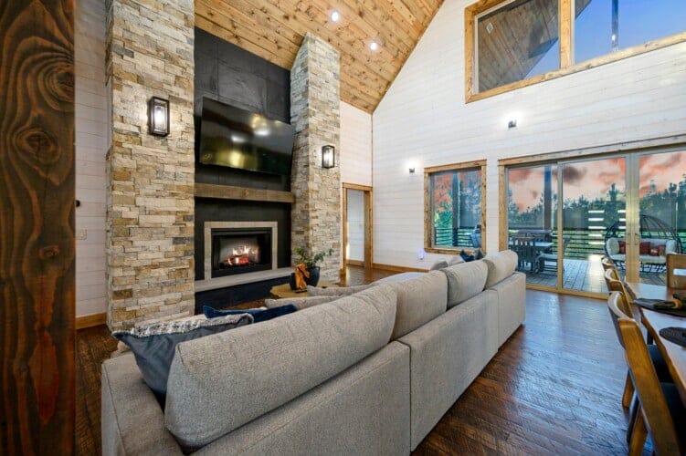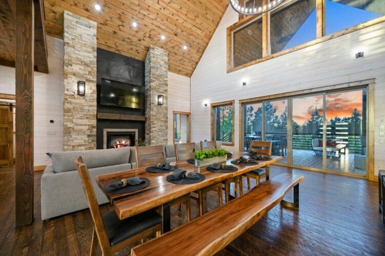 The main living area sets the tone with its inviting atmosphere. A massive sectional sofa offers plenty of room for everyone to unwind, while a large-screen TV promises easy movie nights or cheering on your favorite team during game days. The gas fireplace adds the perfect mountain lodge feel, casting a soft glow across the room as you look out through the wall of windows toward the patio and the sweeping forested hills beyond. It’s the kind of view that stops conversations mid-sentence—quiet, peaceful, and endlessly beautiful.