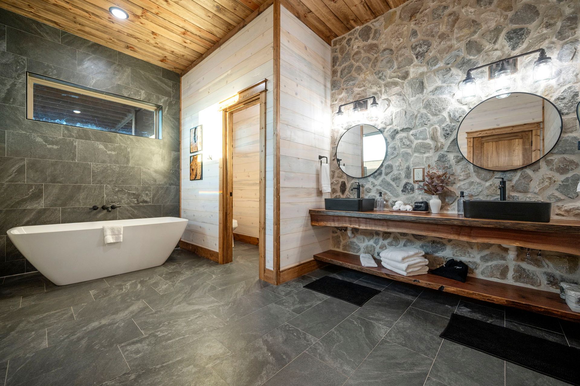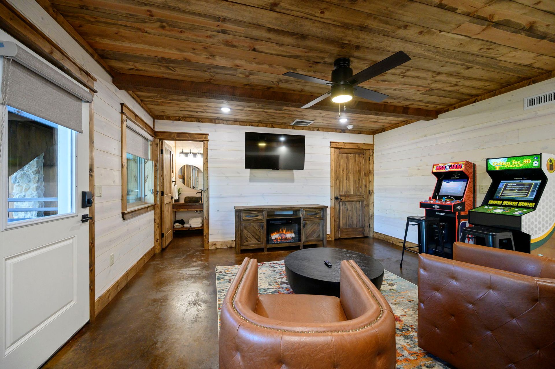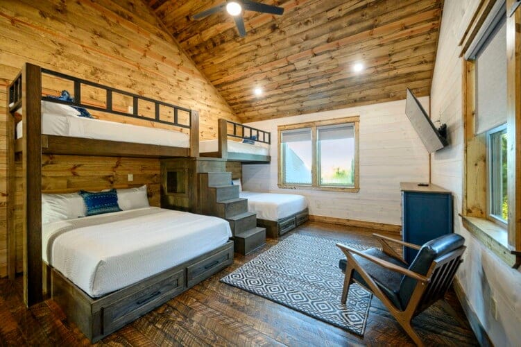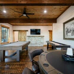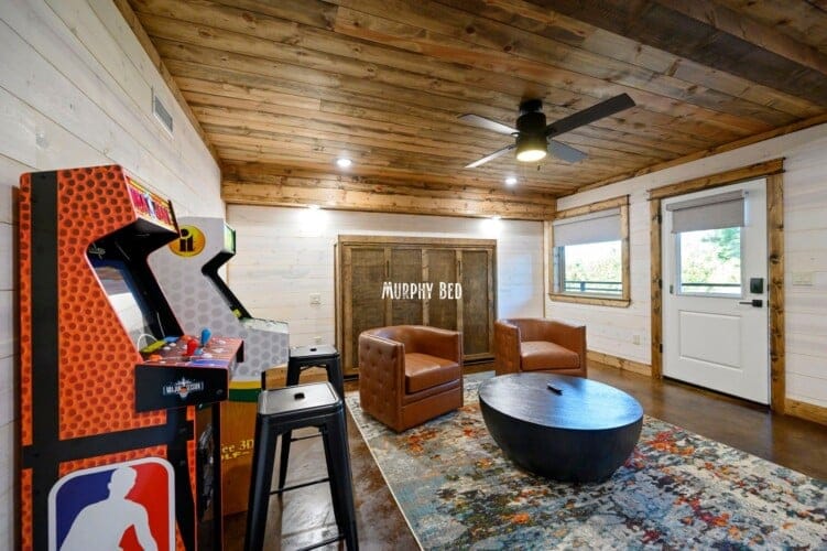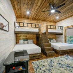 Each of the eight bedrooms at Panorama Peak has been designed as a private retreat. The five king suites feature plush bedding, smart TVs, and ensuite bathrooms that feel more like spa sanctuaries, complete with double vanities, walk-in showers, and even soaking tubs in select rooms. The bunk rooms, ideal for kids or teens, provide ample sleeping space and feature arcade games that keep the fun going late into the night. On the lower level, the Murphy suite offers both comfort and versatility with its queen-size Murphy bed, TV, and additional arcade classics, such as NBA Jam and Golden Tee. Every bedroom gives guests the same sense of luxury and relaxation, so no one ever feels like they drew the short straw.