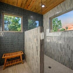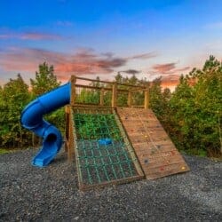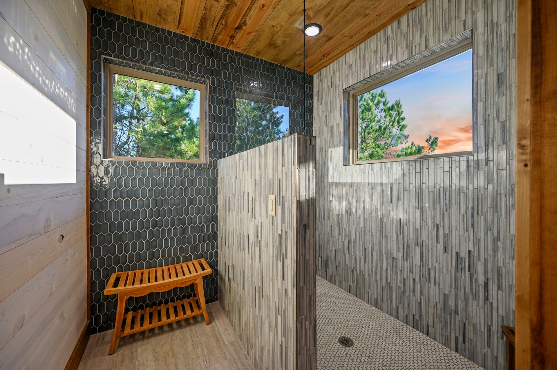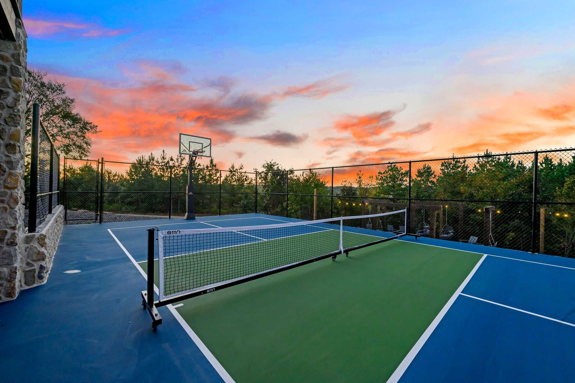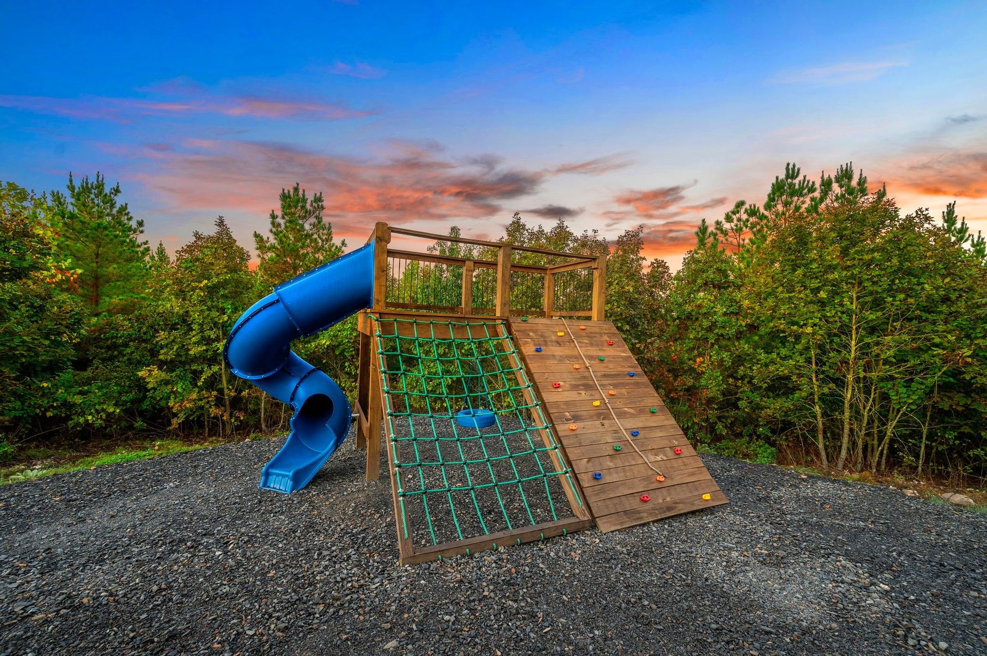 Of course, no visit to Panorama Peak is complete without stepping down to the lower level, where outdoor adventure truly comes alive. The hot tub area offers pure relaxation with loungers and a slide that adds a bit of fun for the younger guests—or the young at heart. Beyond that, there’s a full pickleball court for those who crave a little competition, a children’s play area, and a beautifully designed firepit surrounded by cozy seating. The evenings here are special, whether you’re roasting marshmallows, stargazing, or simply letting the day wind down to the sound of laughter and crackling flames.