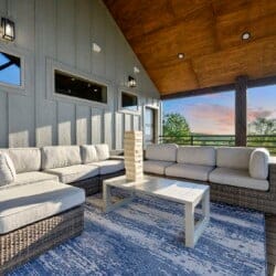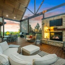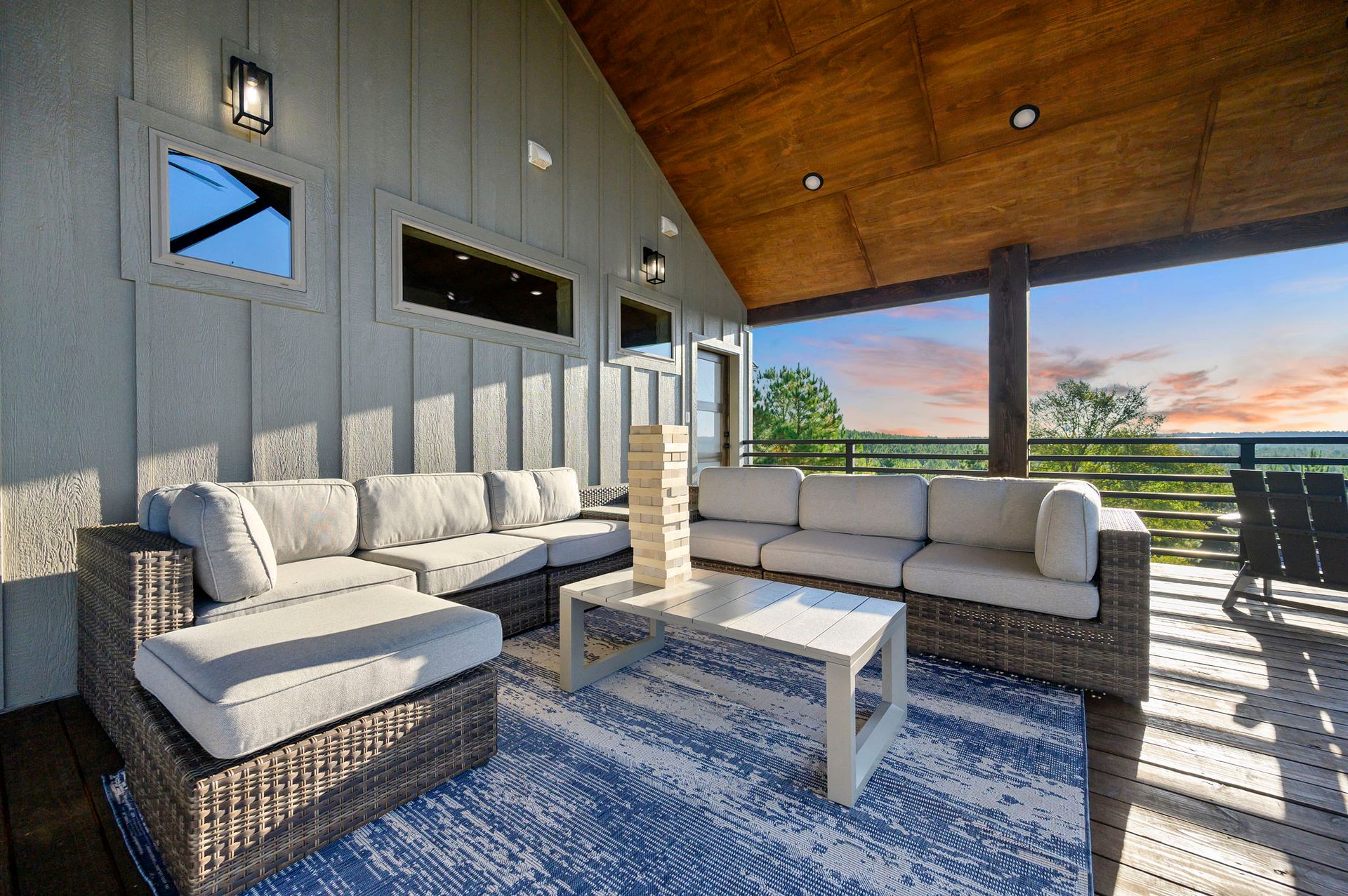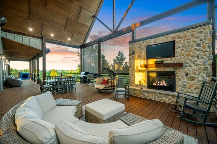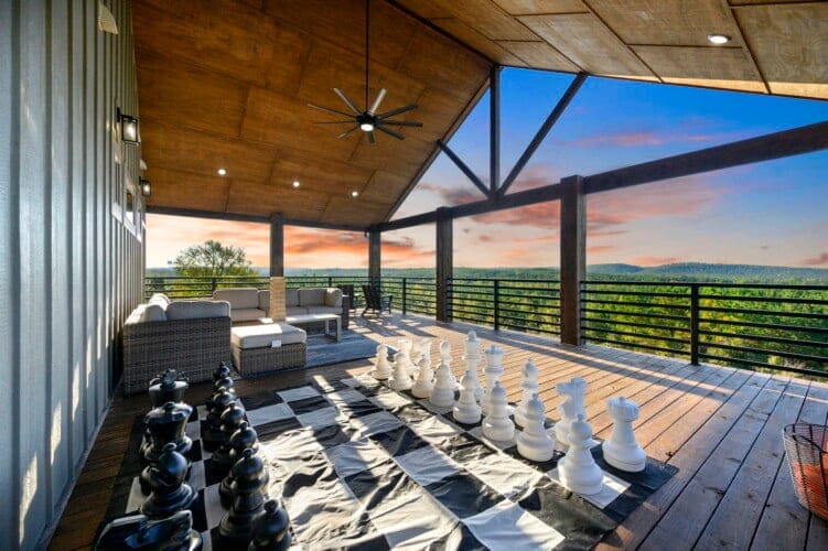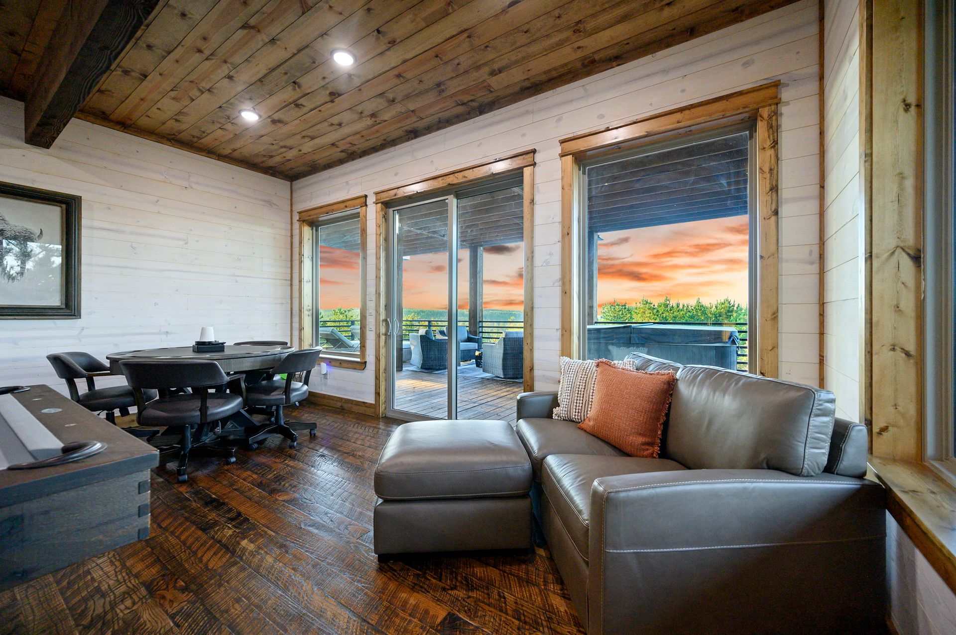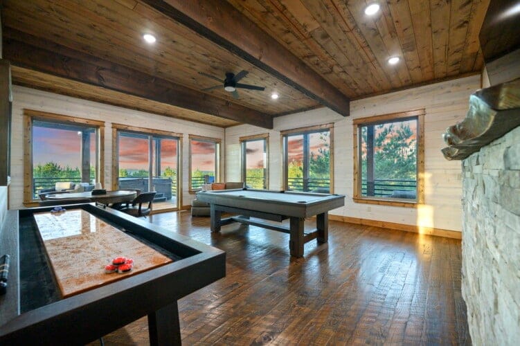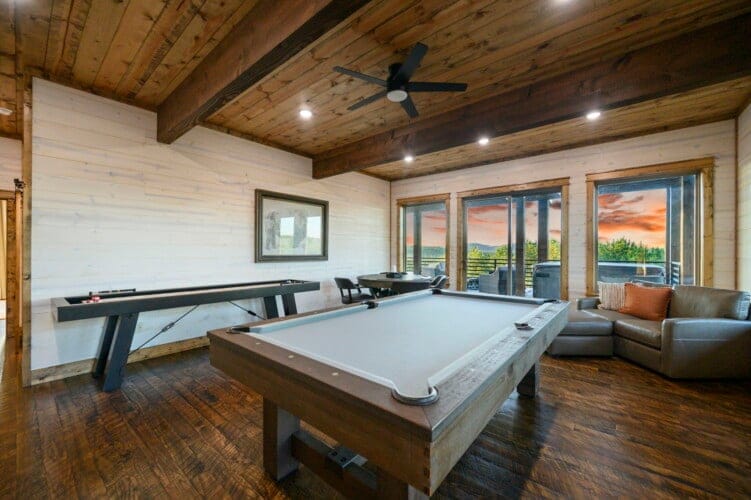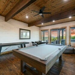 The entertainment continues beyond the bedrooms. Panorama Peak features a fully outfitted game room with a pool table, shuffleboard, poker setup, and a big-screen TV for casual hangouts or friendly competition. It’s easy to lose track of time here as laughter fills the room and the night stretches on. For those who love outdoor living, the main deck is an experience in itself, featuring a gas fireplace, TV, comfortable sectional seating, and a dining setup that allows you to enjoy the mountain air while dining. The upper balcony shared by two of the master suites adds a playful touch with life-sized chess and Jenga, plus two egg swings that sway gently as you watch the sunset.