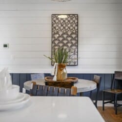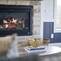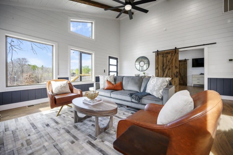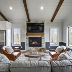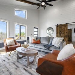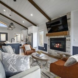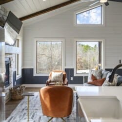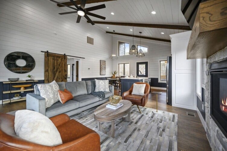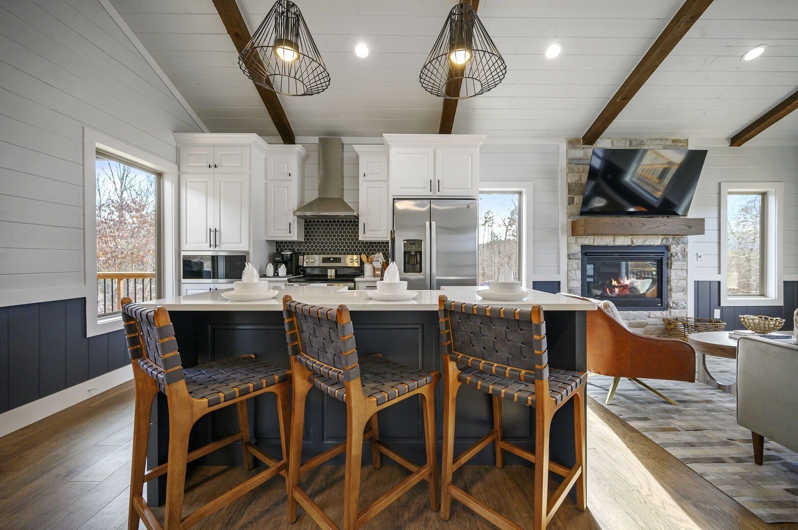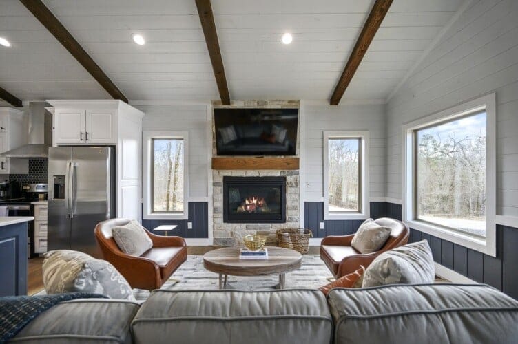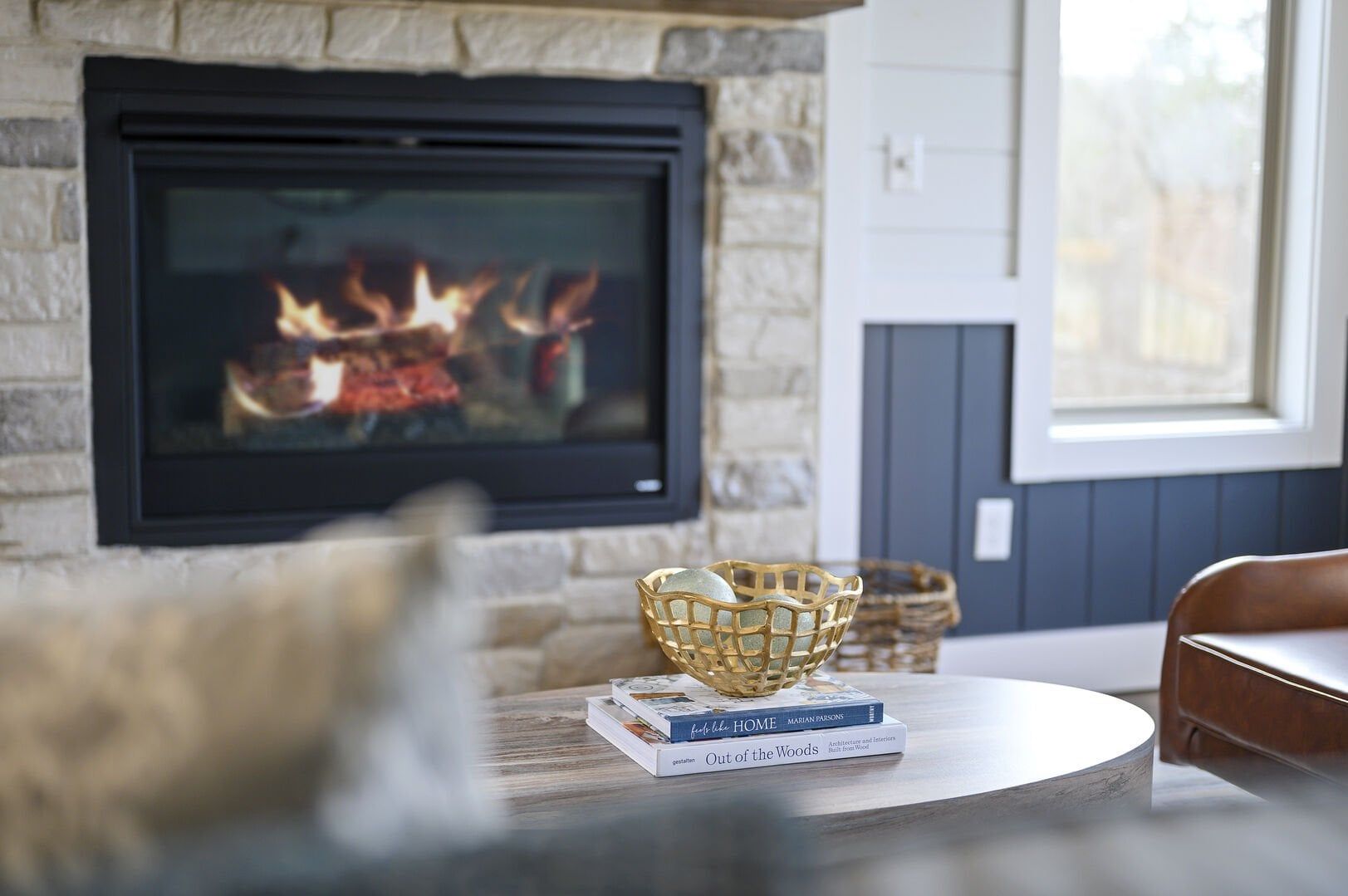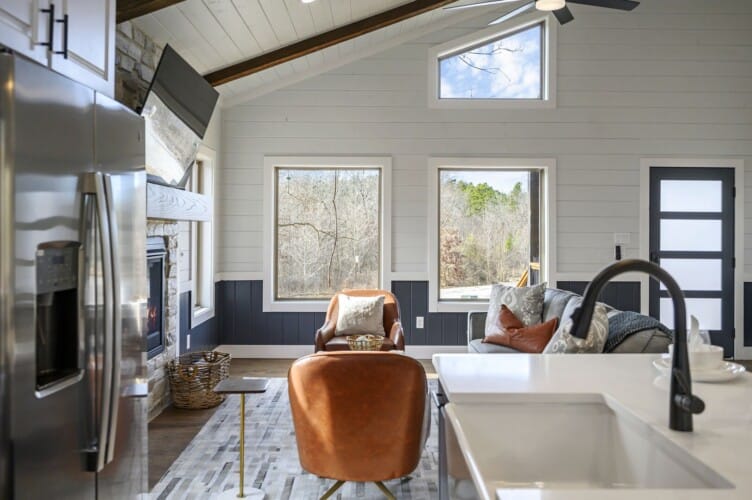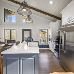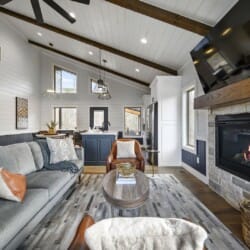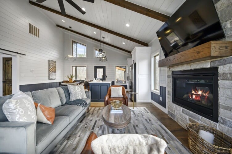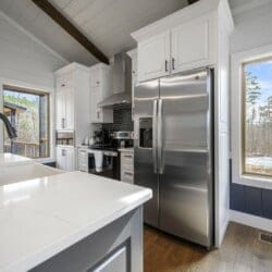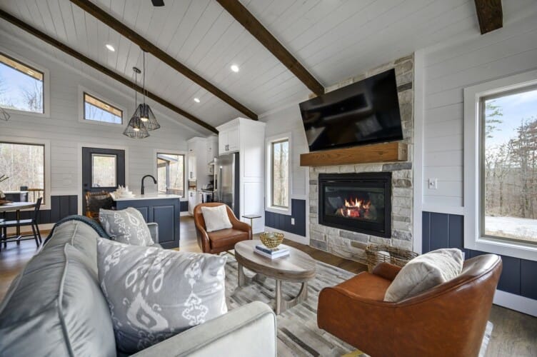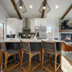 Peace and Quiet opens with a spacious, open-concept living area filled with natural light and inviting seating. The layout is spacious yet warm, giving you room to move while still feeling like you’re at home. The couch in the living room faces a tall stone fireplace, creating a welcoming spot to relax with a good book, a movie, or simply each other’s company. The large windows let you look out into the forest without leaving your seat, which is part of what makes Peace and Quiet so special—you’re never far from nature, even indoors.