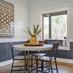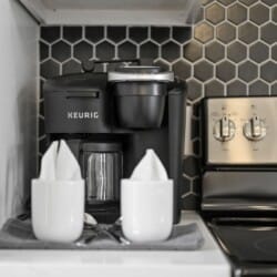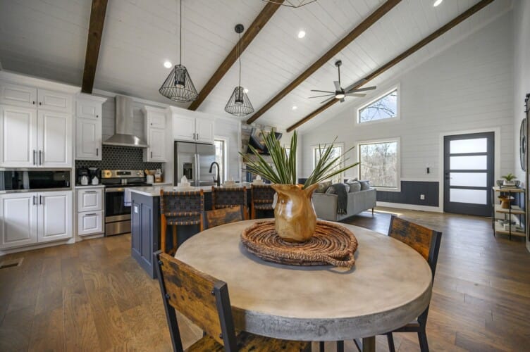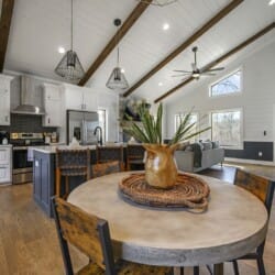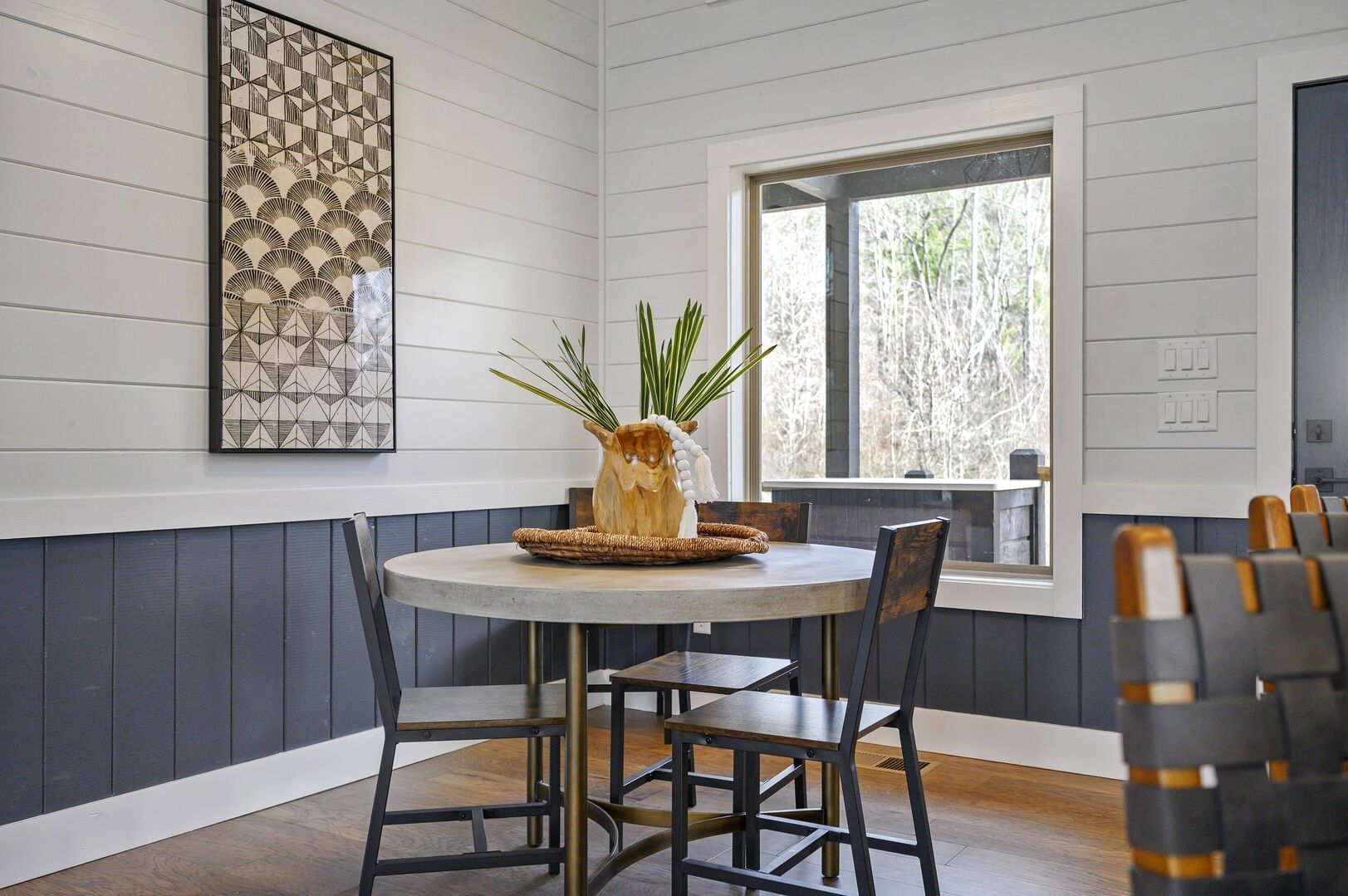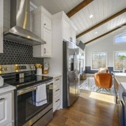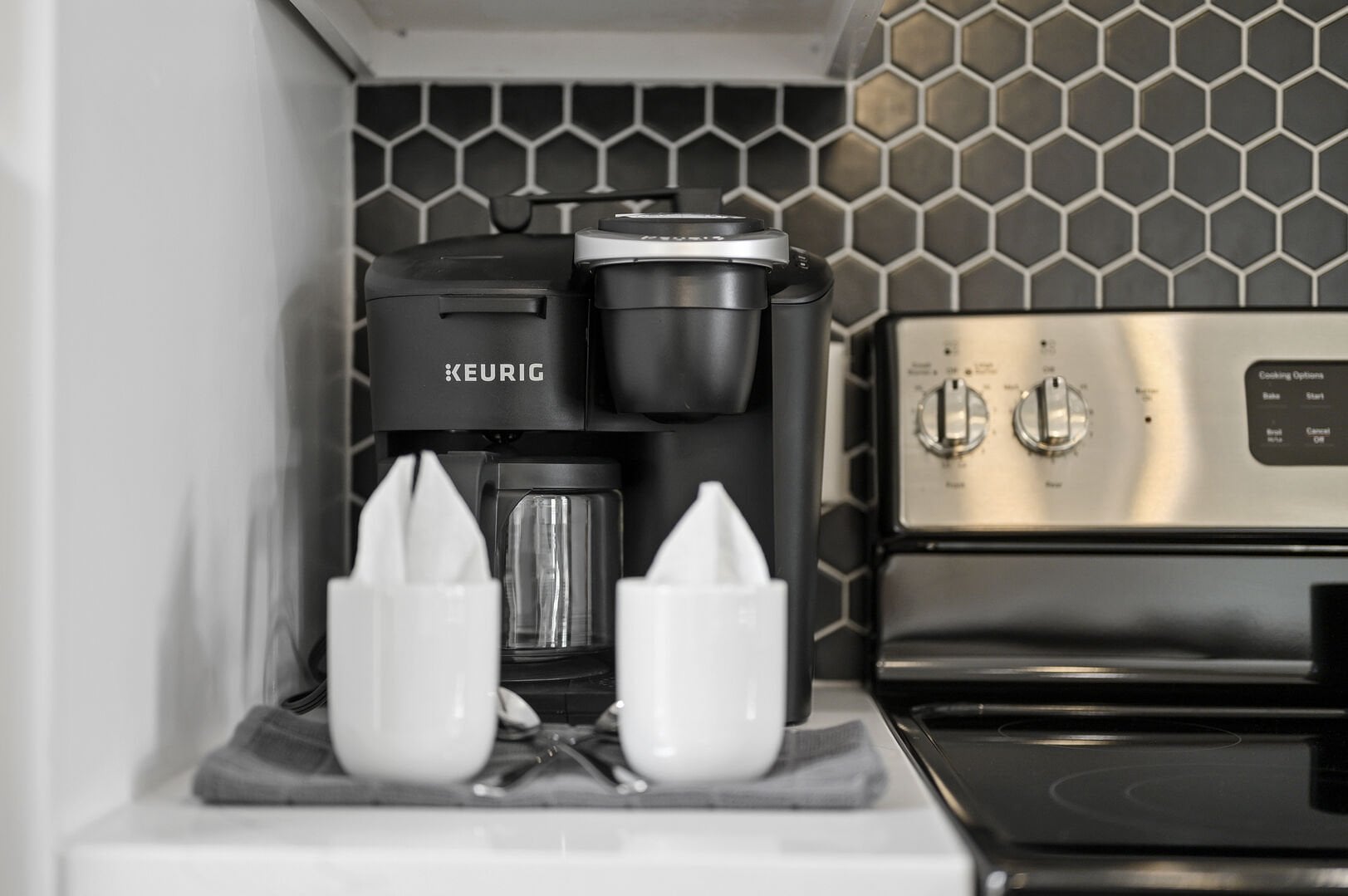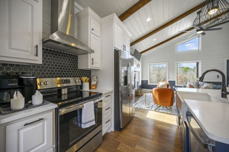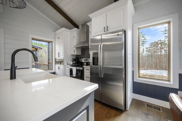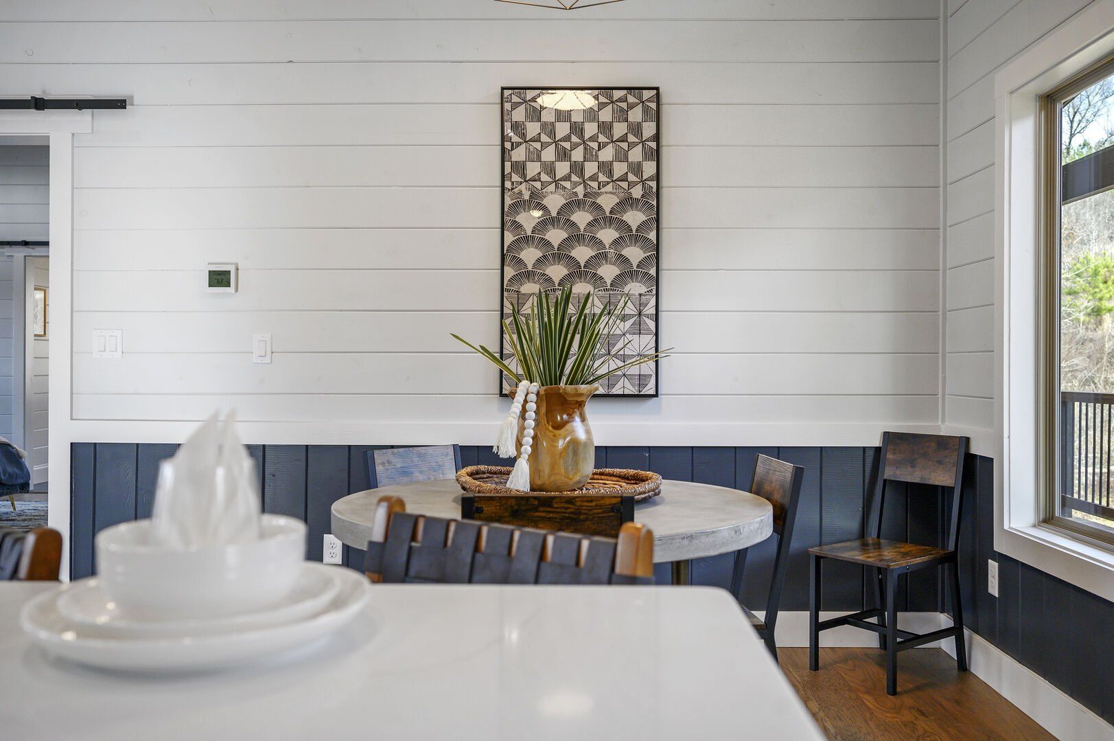 Peace and Quiet also includes a full kitchen that’s ready for whatever meals you want to make. The appliances are modern and easy to use, and the cabinets are stocked with cookware, dishes, and utensils. A Keurig coffee machine is set up on the counter, and there’s enough space to prep and enjoy a full meal indoors or out. The dining table inside is cozy and positioned near the windows, allowing you to enjoy every bite with a view. When the weather is nice, take your food outside to the deck for an even more peaceful dining experience.