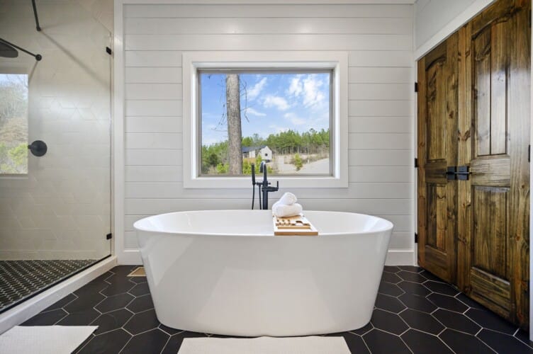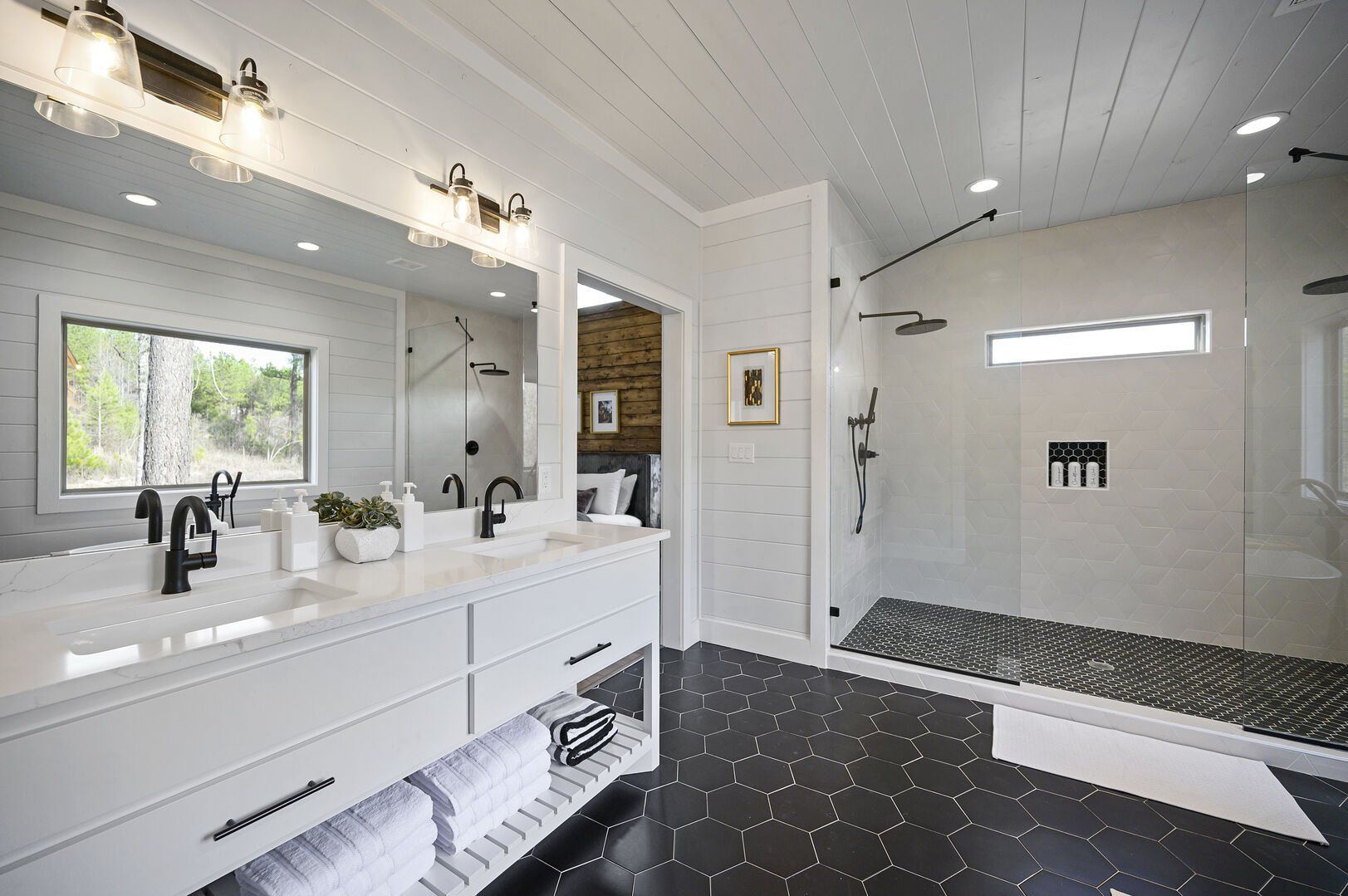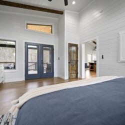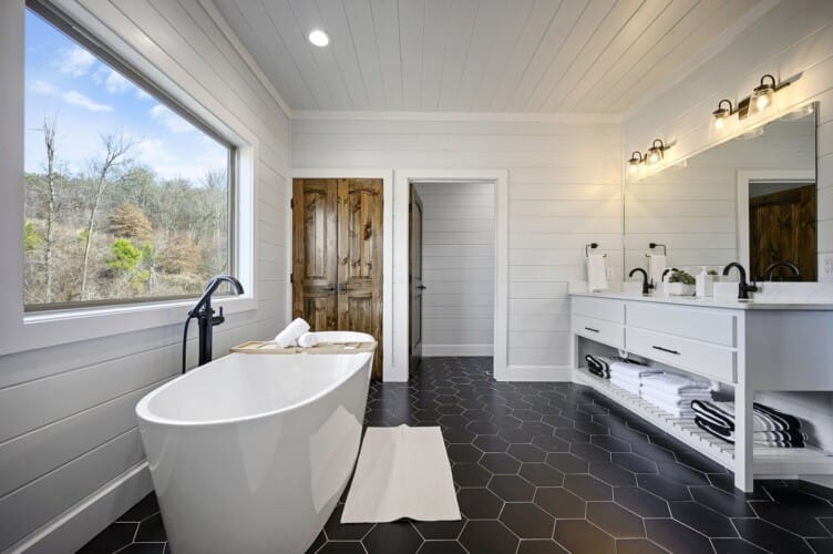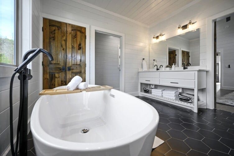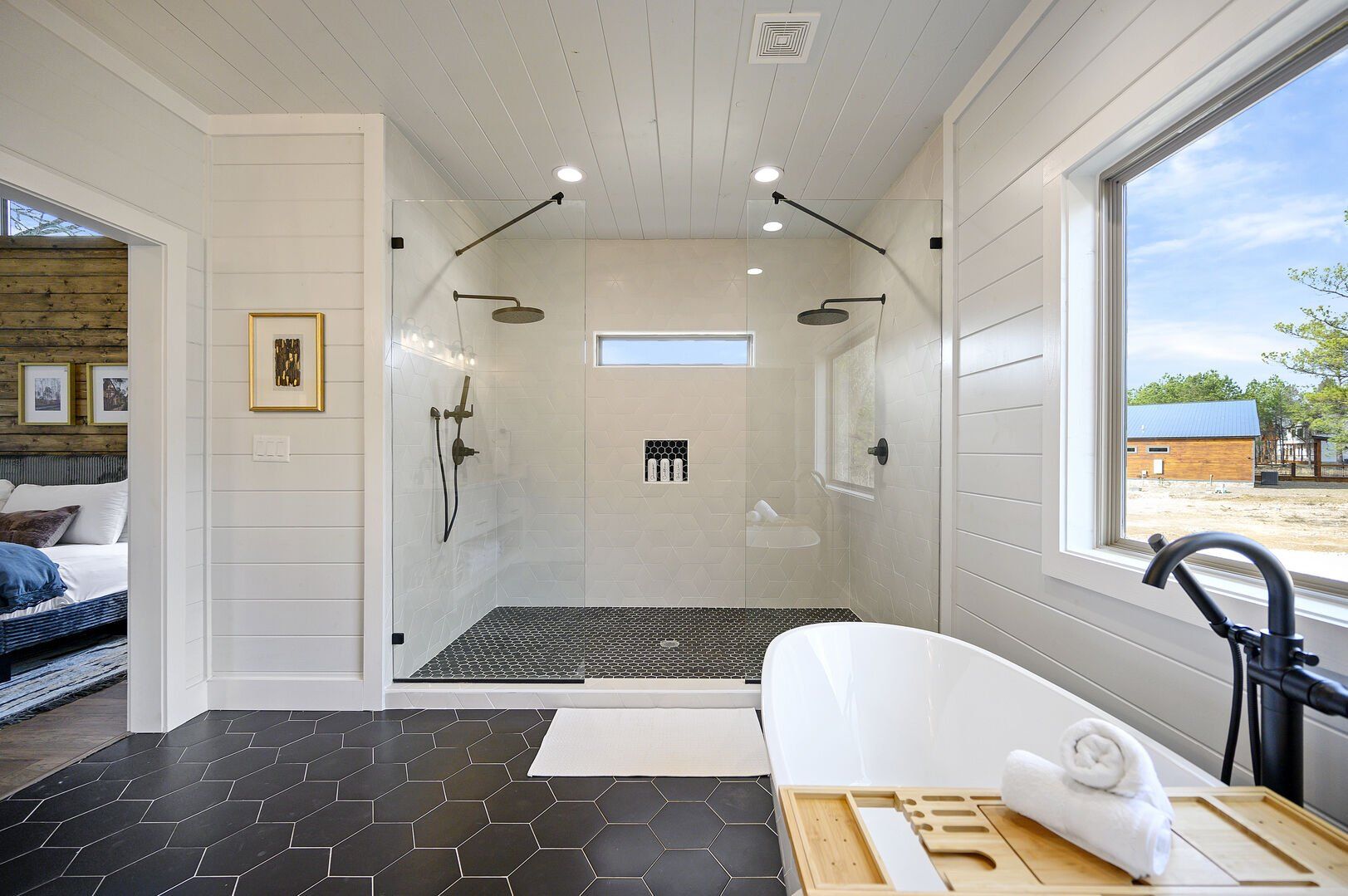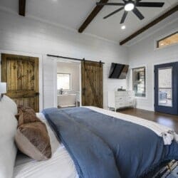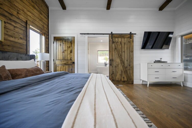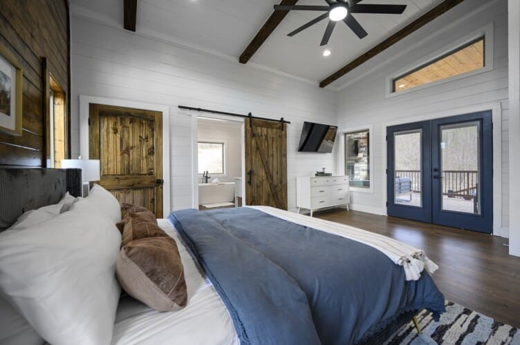 Peace and Quiet offers a private king-size bedroom designed for rest. The bed is large and soft, with high-quality sheets and pillows that invite you to sleep in just a little longer than usual. The soft glow of morning light coming through the trees makes it hard not to feel at peace. The attached bathroom is spacious and clean, featuring a soaking tub for long, quiet baths and a stand-up shower with modern fixtures. The bathroom in Peace and Quiet features a double vanity sink and all the essentials you need, including soft towels, body wash, and shampoo.