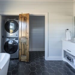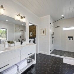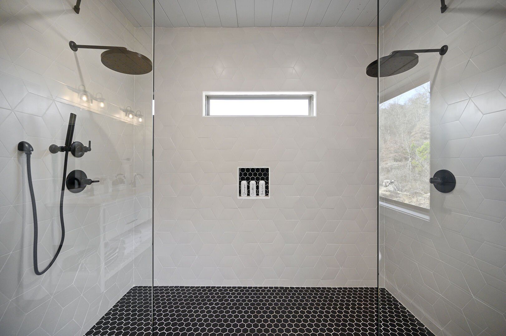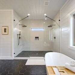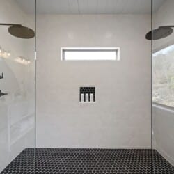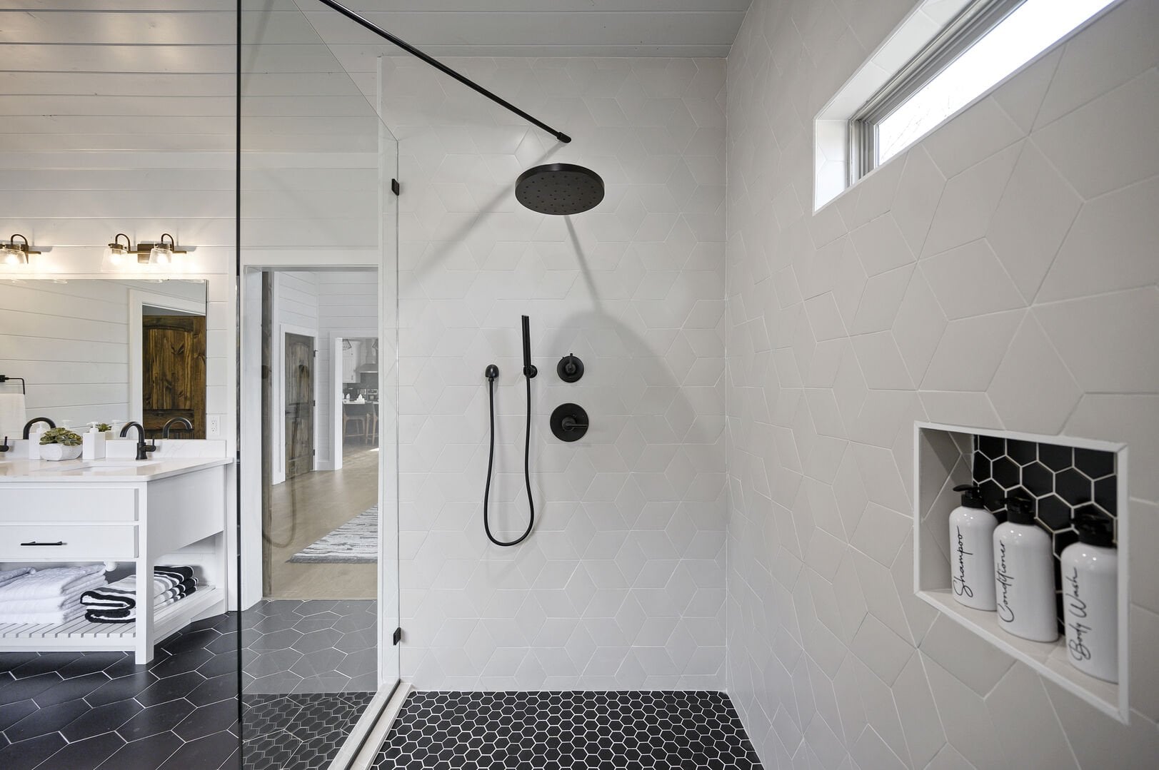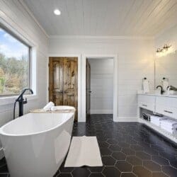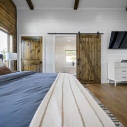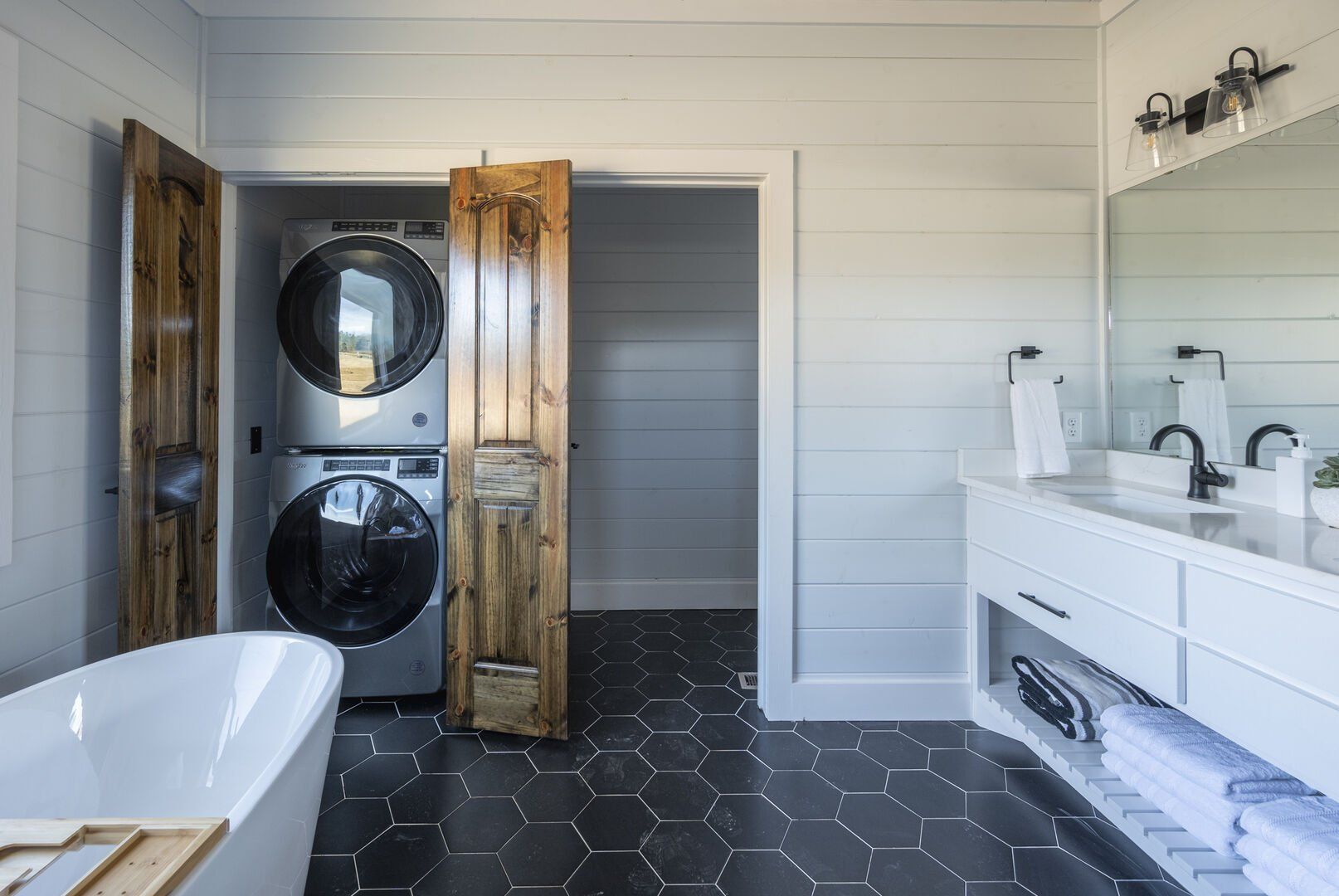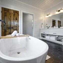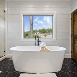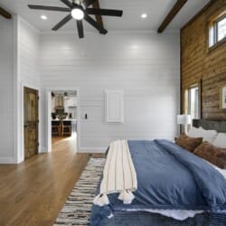 Peace and Quiet offers a private king-size bedroom designed for rest. The bed is large and soft, with high-quality sheets and pillows that invite you to sleep in just a little longer than usual. The soft glow of morning light coming through the trees makes it hard not to feel at peace. The attached bathroom is spacious and clean, featuring a soaking tub for long, quiet baths and a stand-up shower with modern fixtures. The bathroom in Peace and Quiet features a double vanity sink and all the essentials you need, including soft towels, body wash, and shampoo.