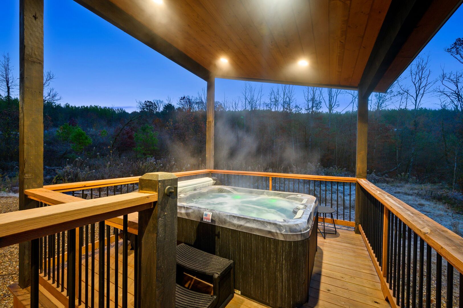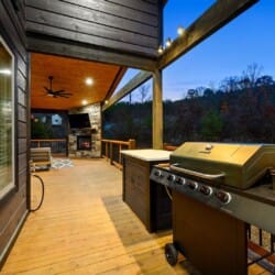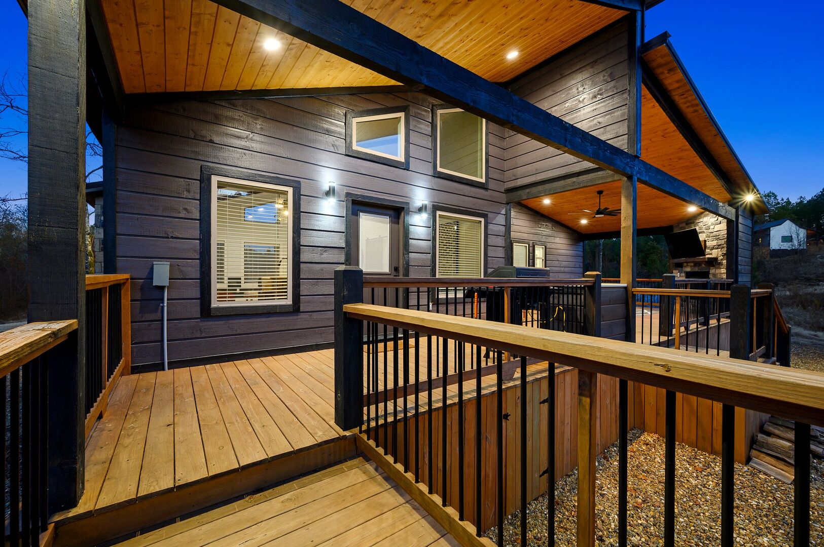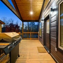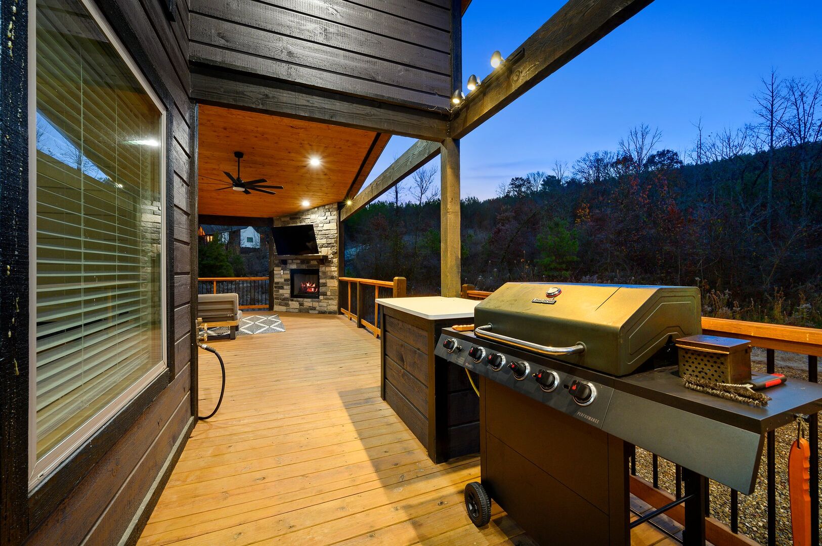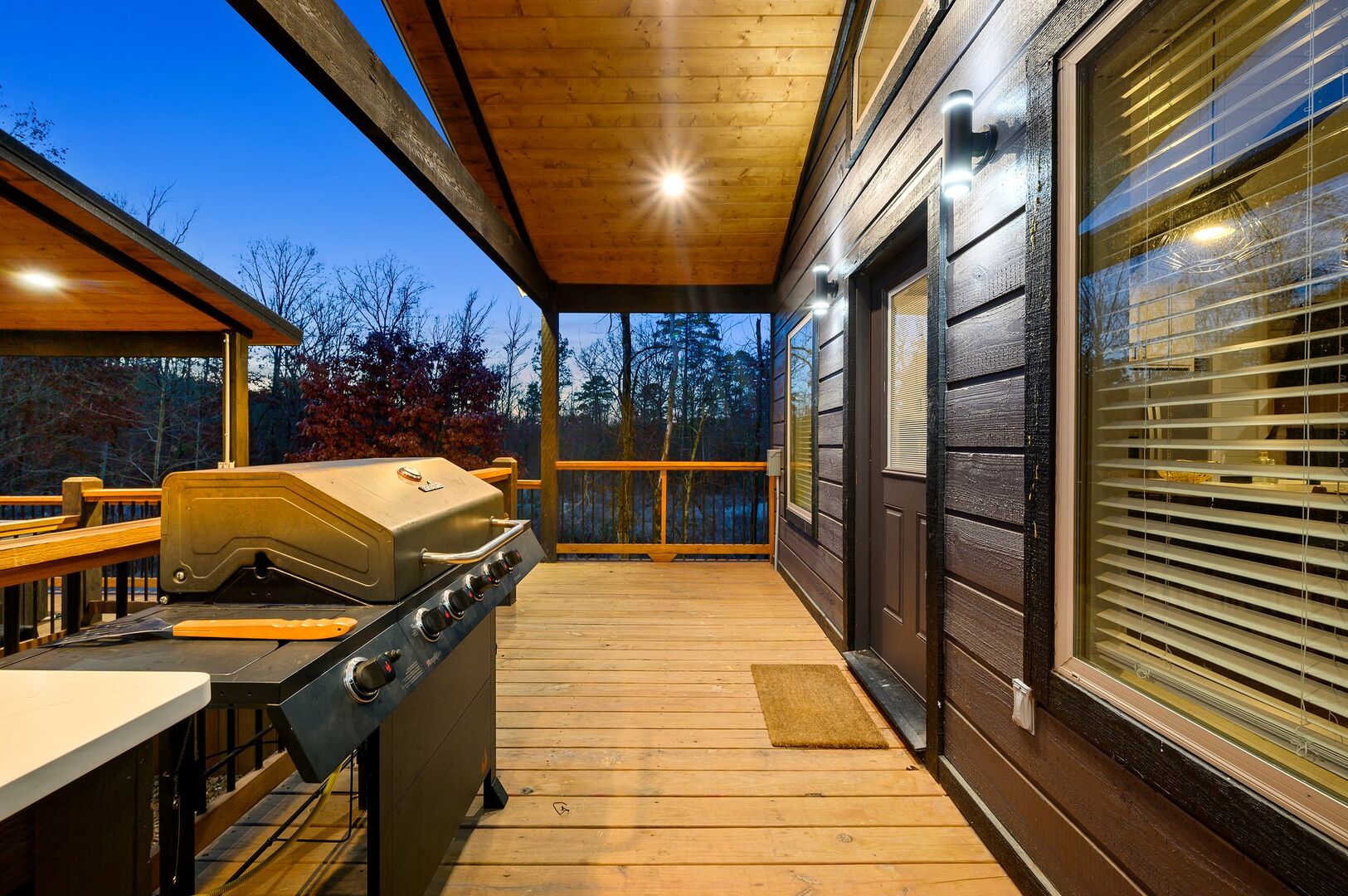 Peace and Quiet really shines when you walk out to the deck. The outdoor space is expansive and inviting, with seating arranged to allow you to take in the view. There’s a covered hot tub set into its quiet corner, perfect for unwinding under the stars. A built-in grill makes it easy to cook outside, and the fire pit is ideal for sharing stories and roasting marshmallows. The peaceful surroundings and thoughtful layout make the outdoors just as comfortable as the inside. Peace and Quiet also offers direct access to a private patio from both the master bedroom and kitchen, providing options to start your morning or end your night outside.