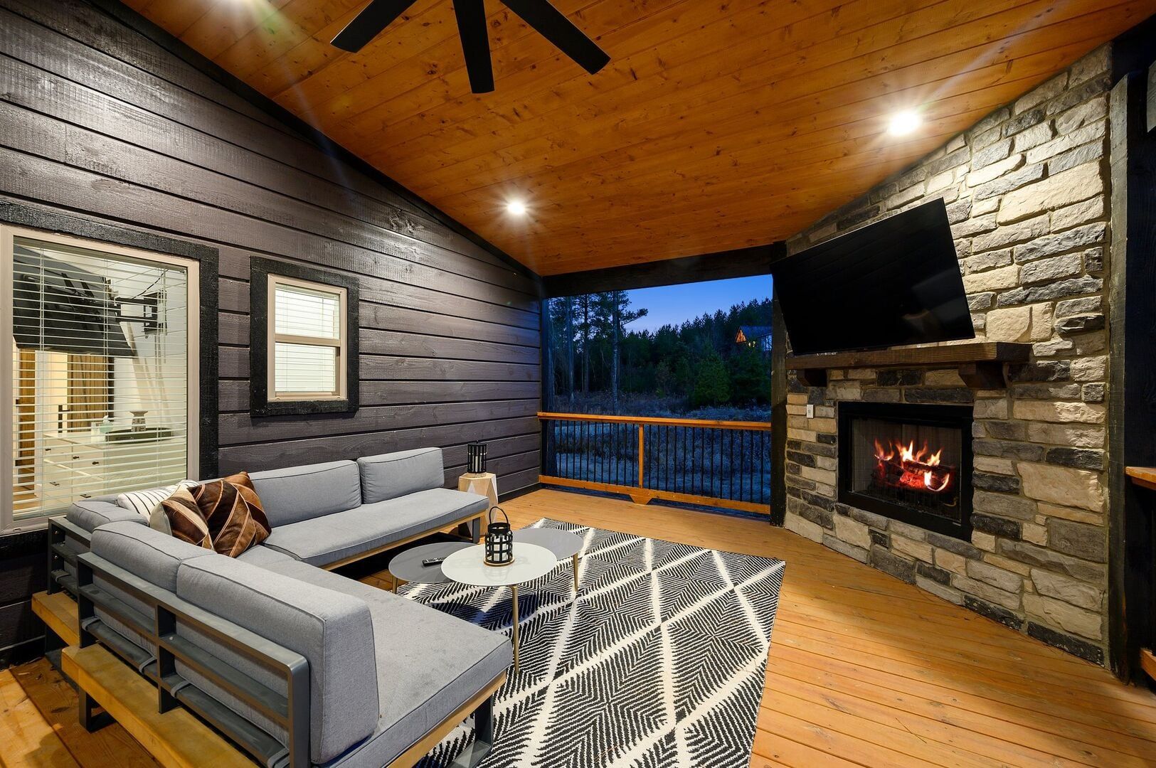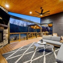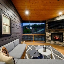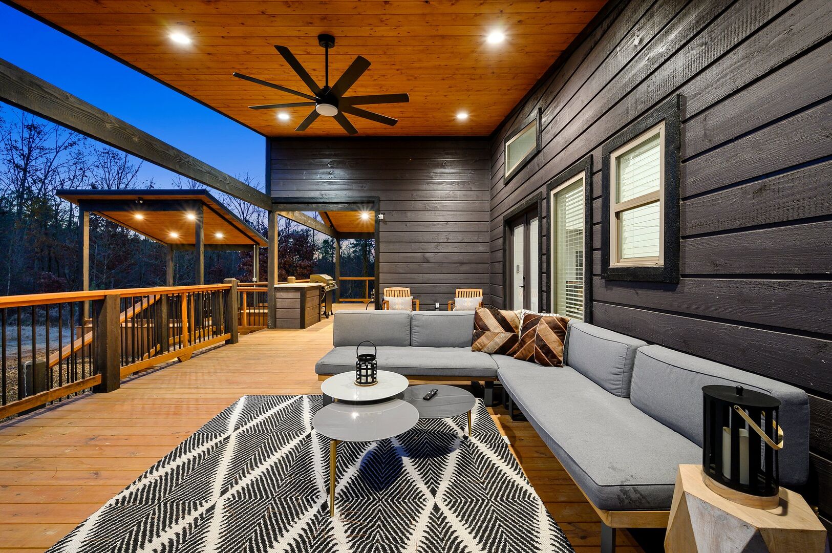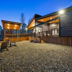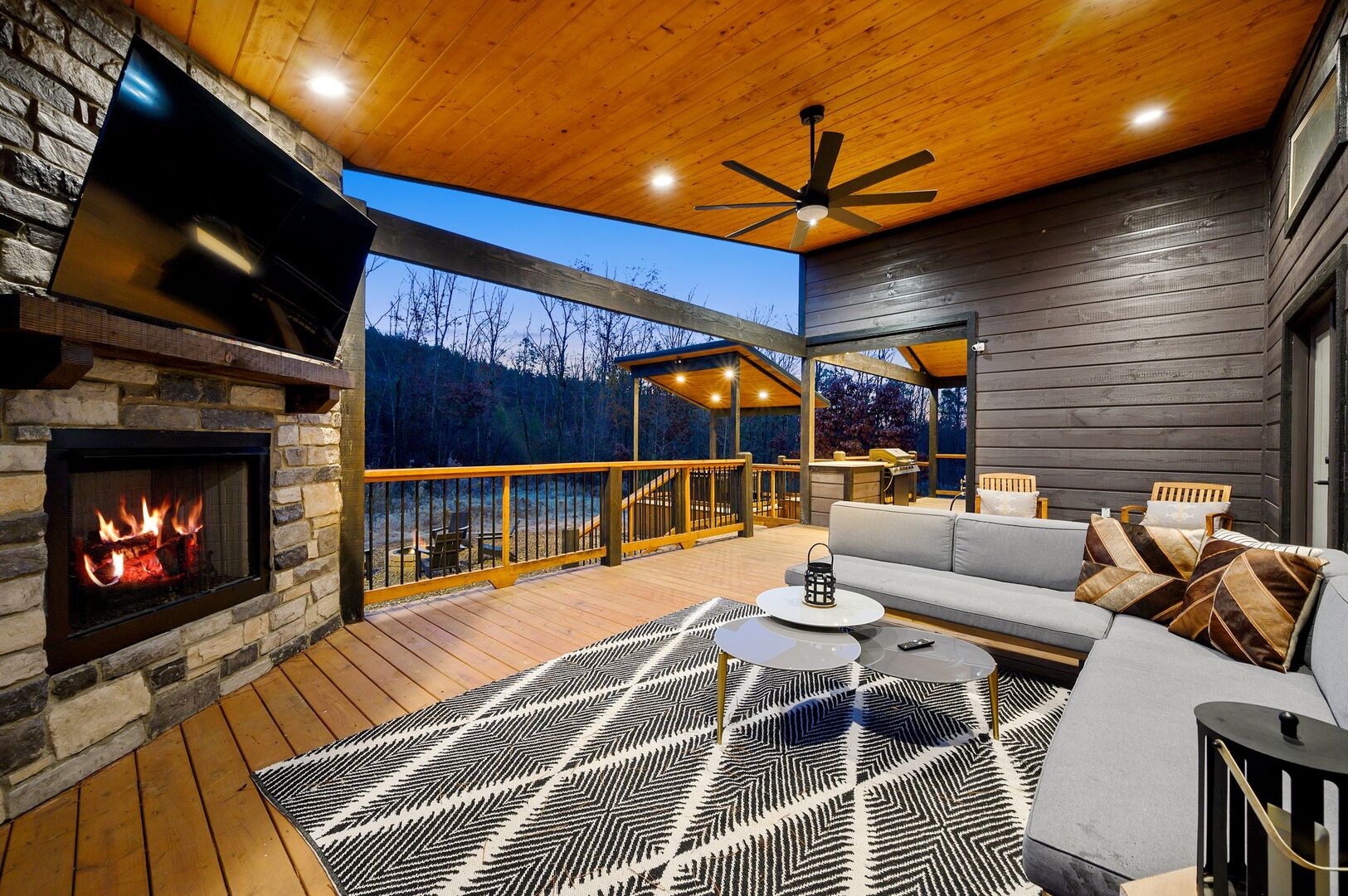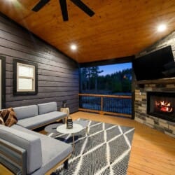Peace and Quiet really shines when you walk out to the deck. The outdoor space is expansive and inviting, with seating arranged to allow you to take in the view. There’s a covered hot tub set into its quiet corner, perfect for unwinding under the stars. A built-in grill makes it easy to cook outside, and the fire pit is ideal for sharing stories and roasting marshmallows. The peaceful surroundings and thoughtful layout make the outdoors just as comfortable as the inside. Peace and Quiet also offers direct access to a private patio from both the master bedroom and kitchen, providing options to start your morning or end your night outside.