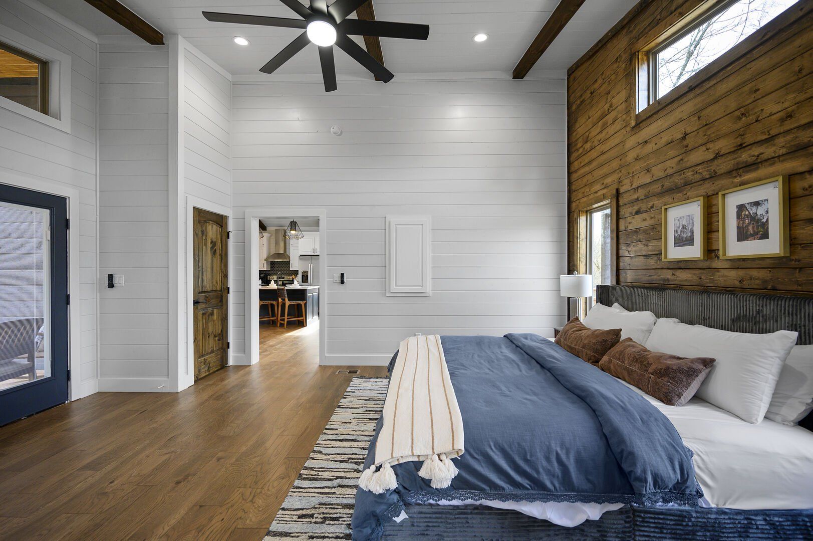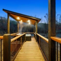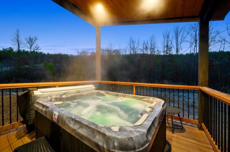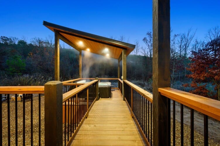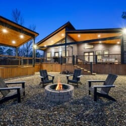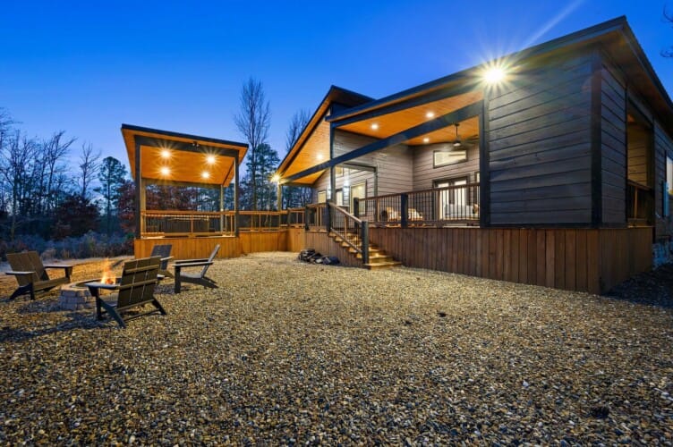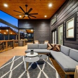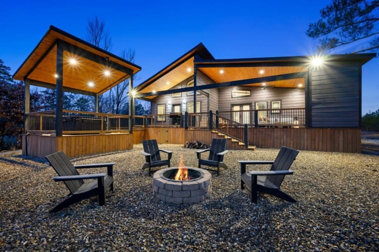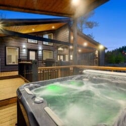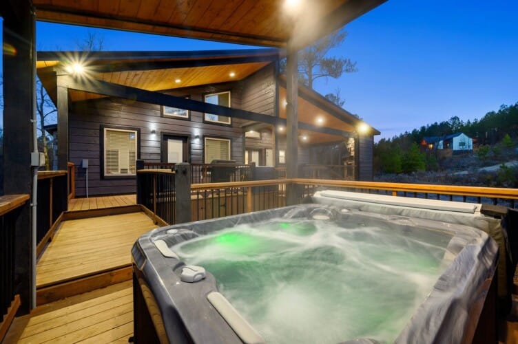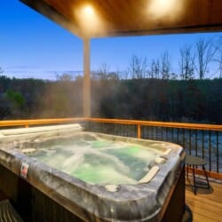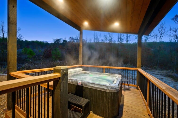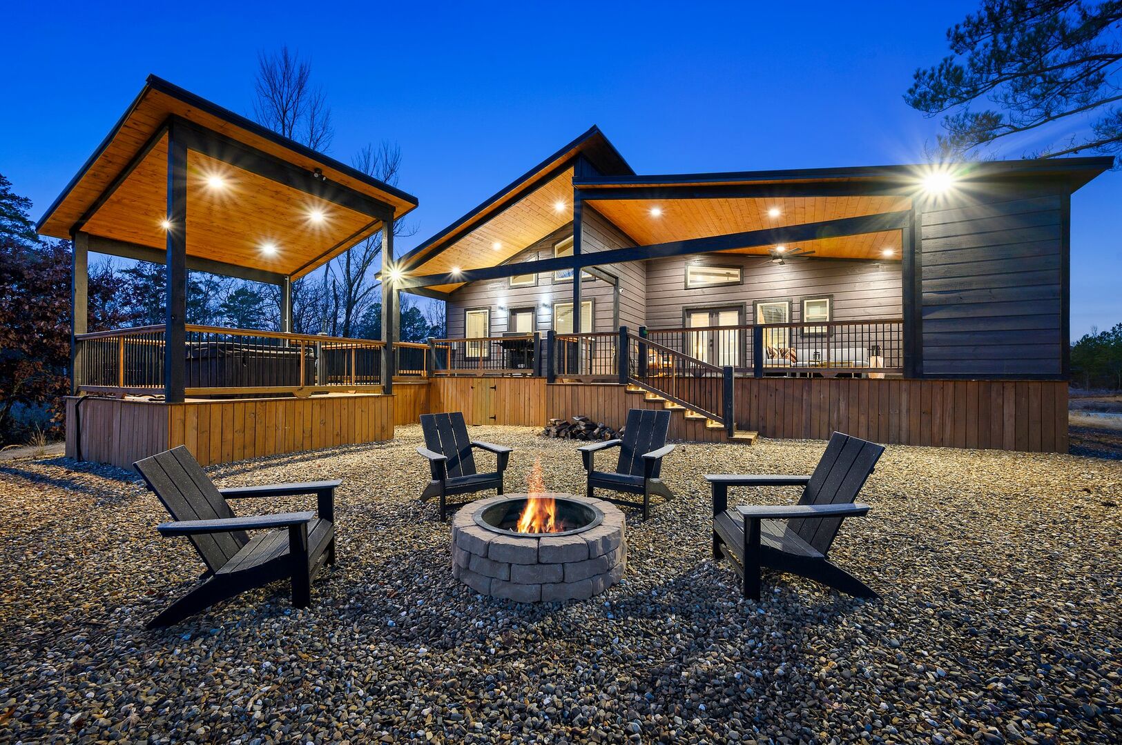 Peace and Quiet really shines when you walk out to the deck. The outdoor space is expansive and inviting, with seating arranged to allow you to take in the view. There’s a covered hot tub set into its quiet corner, perfect for unwinding under the stars. A built-in grill makes it easy to cook outside, and the fire pit is ideal for sharing stories and roasting marshmallows. The peaceful surroundings and thoughtful layout make the outdoors just as comfortable as the inside. Peace and Quiet also offers direct access to a private patio from both the master bedroom and kitchen, providing options to start your morning or end your night outside.