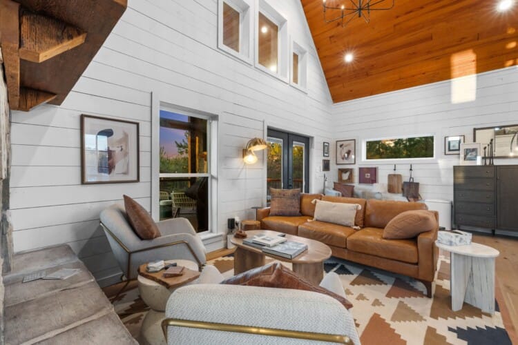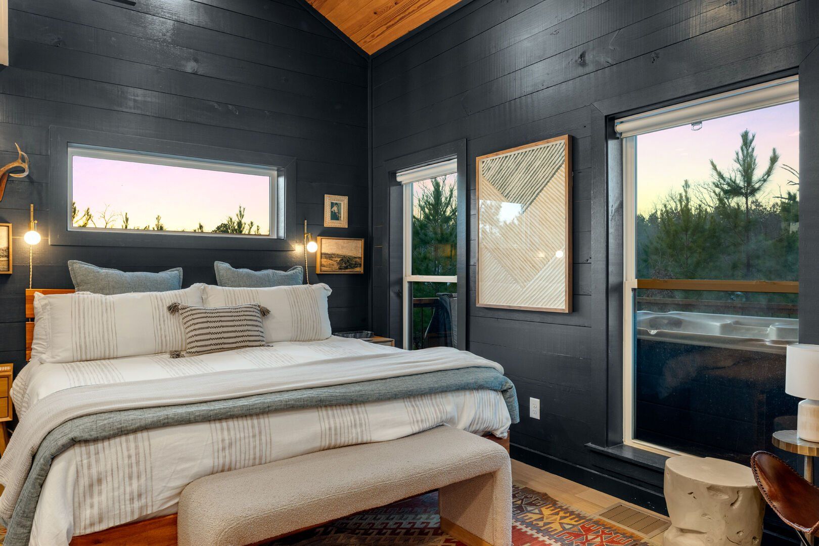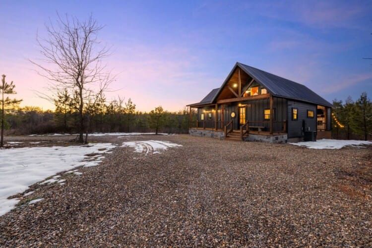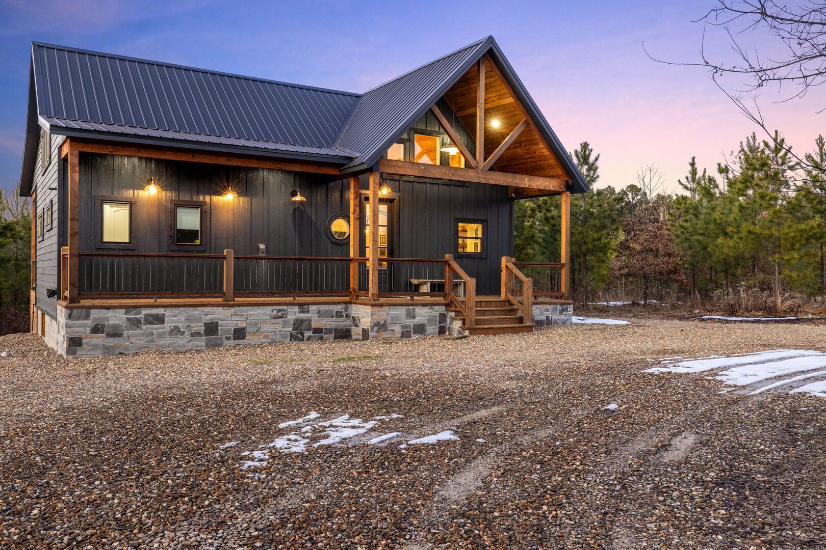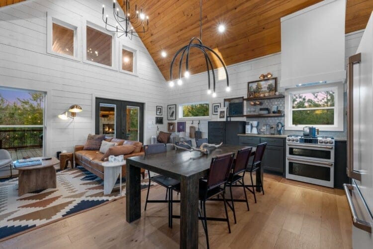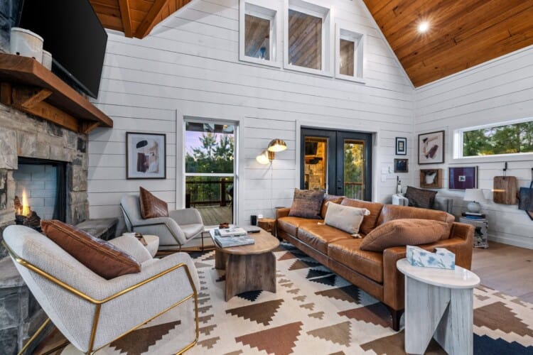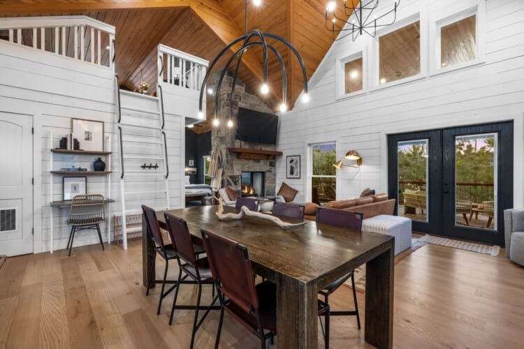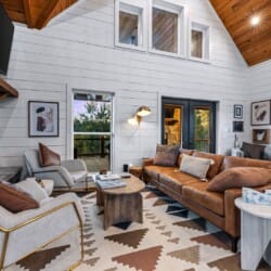 Pine and Bow Lodge is a beautifully designed modern farmhouse cabin that welcomes guests with charm, comfort, and style. From the moment you arrive at this cabin, the peaceful surroundings and thoughtful design create a warm and relaxing atmosphere. The home accommodates up to six guests and features a king suite on the main floor, along with a loft that offers two queen beds upstairs, providing just the right amount of privacy and space for every kind of traveler.