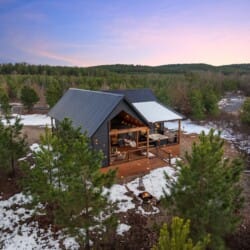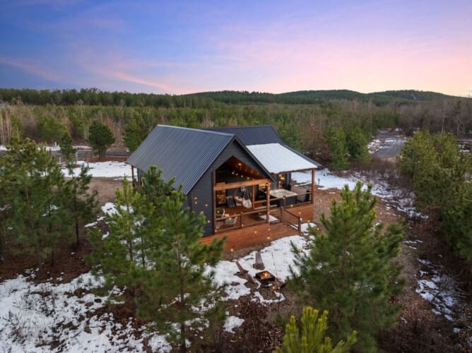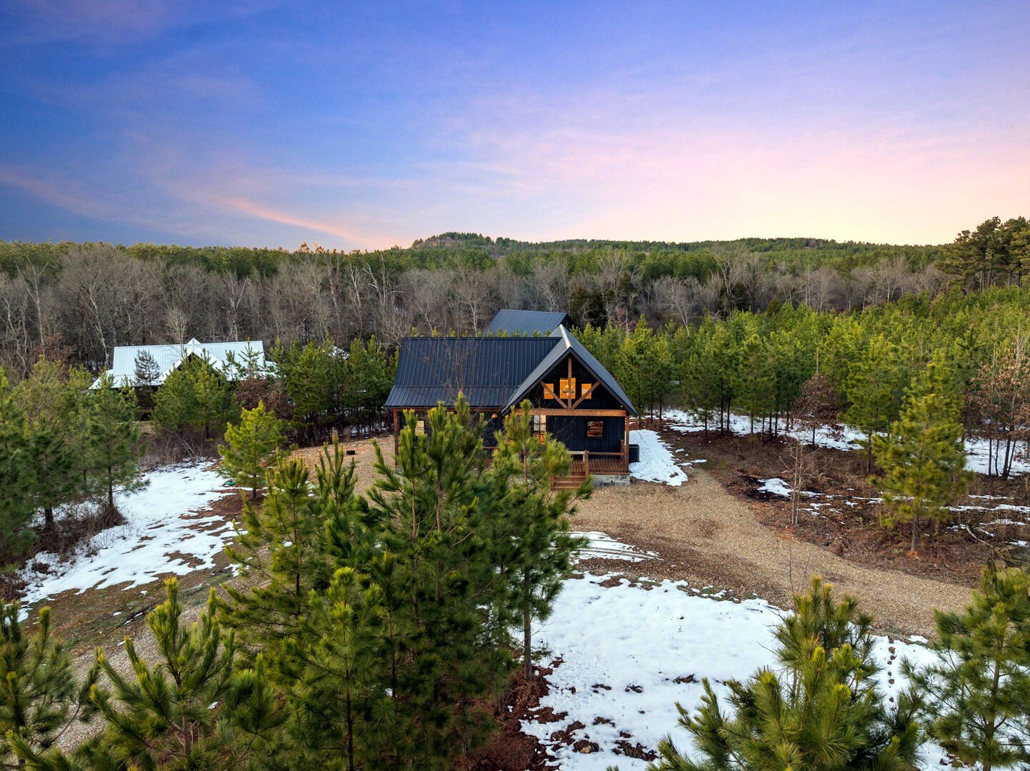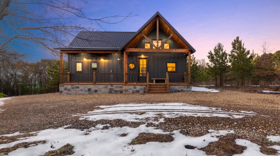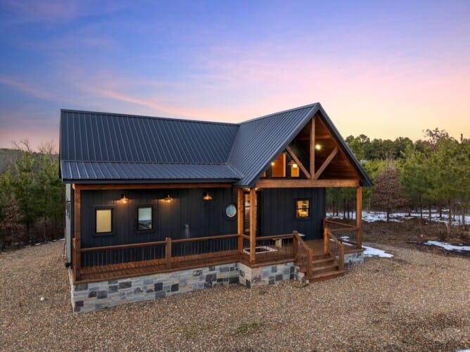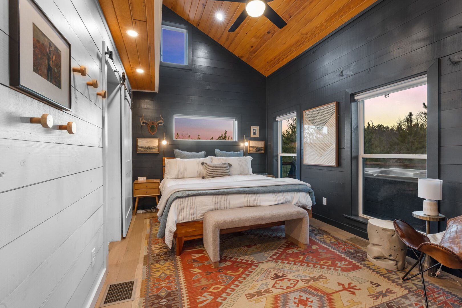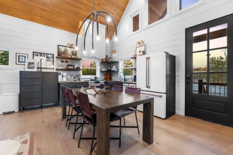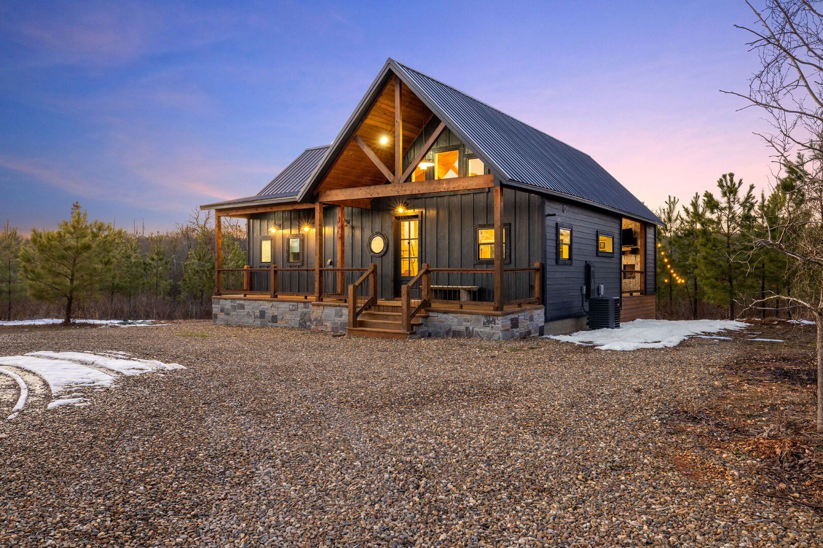 Pine and Bow Lodge is a beautifully designed modern farmhouse cabin that welcomes guests with charm, comfort, and style. From the moment you arrive at this cabin, the peaceful surroundings and thoughtful design create a warm and relaxing atmosphere. The home accommodates up to six guests and features a king suite on the main floor, along with a loft that offers two queen beds upstairs, providing just the right amount of privacy and space for every kind of traveler.