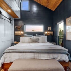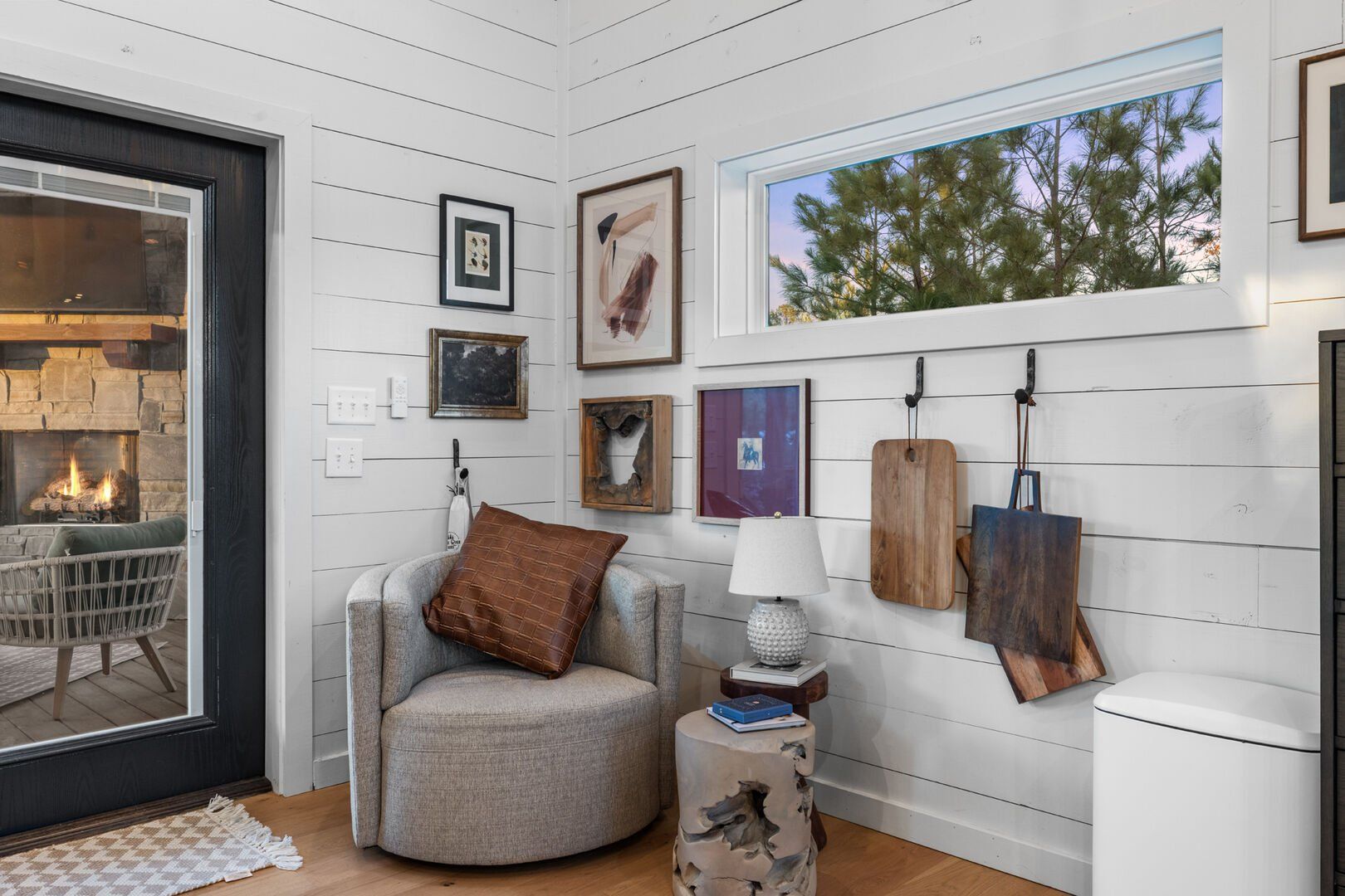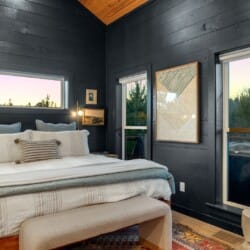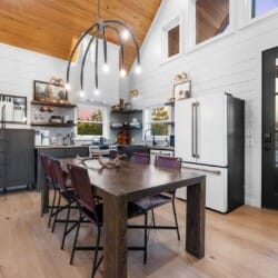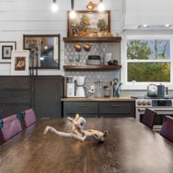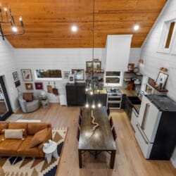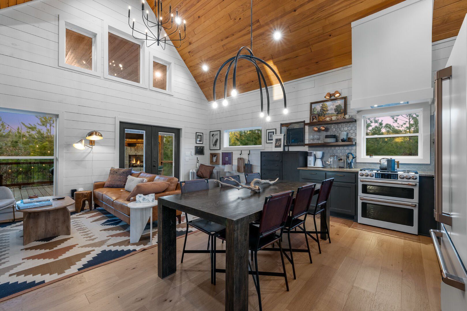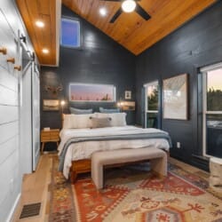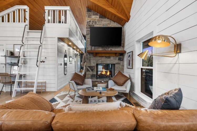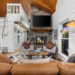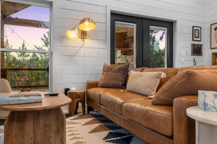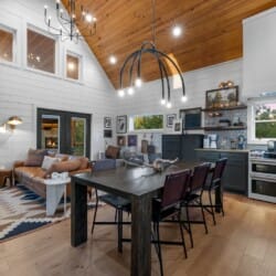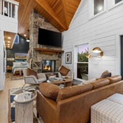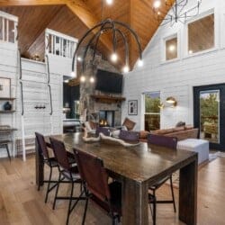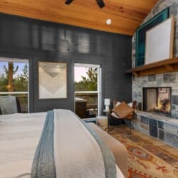 Pine and Bow Lodge blends rustic character with contemporary amenities, creating a unique feel that’s both inviting and elegant. The open living area features a plush couch and chairs, a stunning gas fireplace, and a large smart TV for relaxing evenings. A dedicated desk and chair give guests a quiet spot to catch up on work or browse online using the fast Wi-Fi. Large windows and natural light enhance the space, while modern lighting and textures bring a designer touch. At Pine and Bow Lodge, whether you’re curled up with a book or enjoying a movie with loved ones, every corner invites you to slow down and unwind.