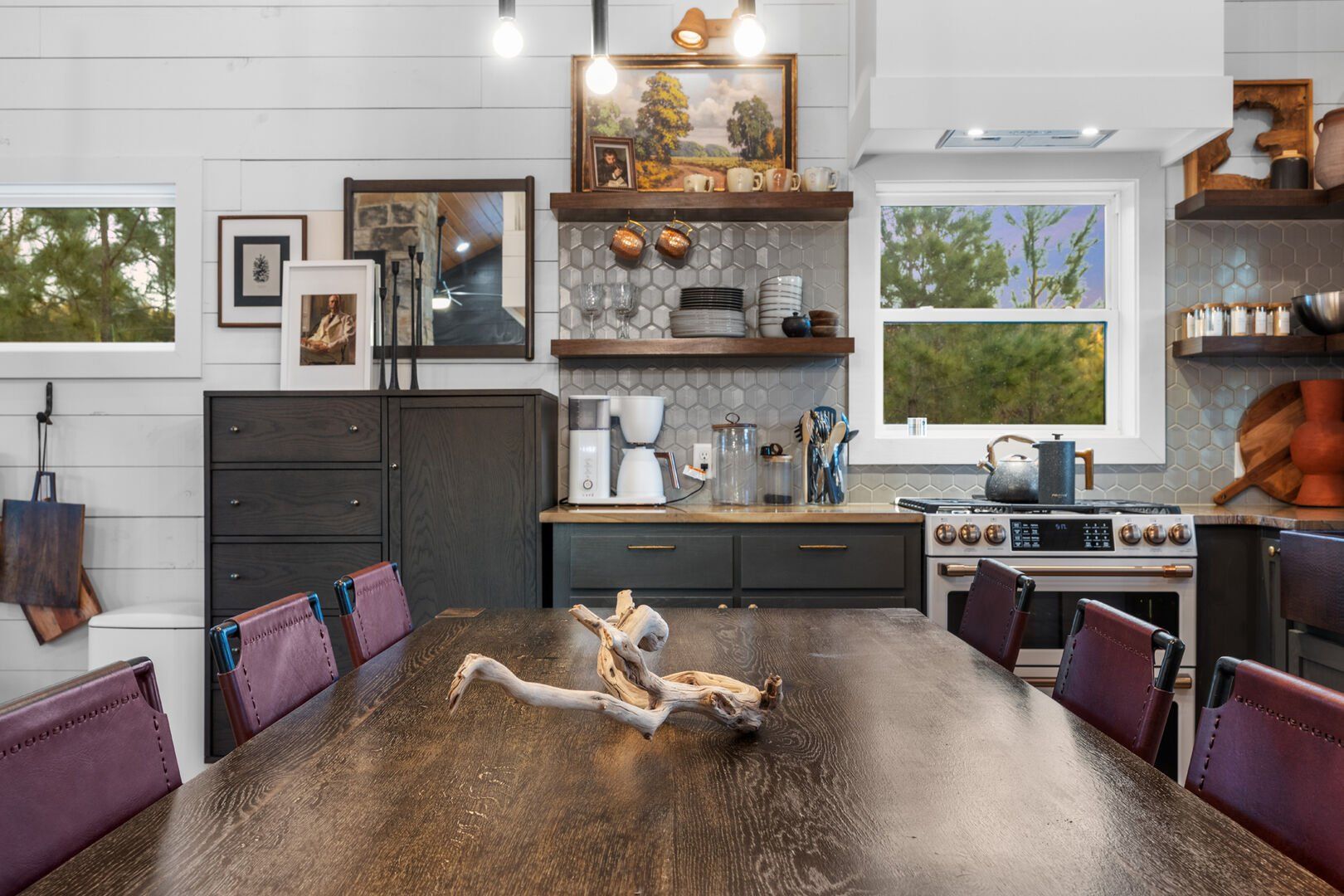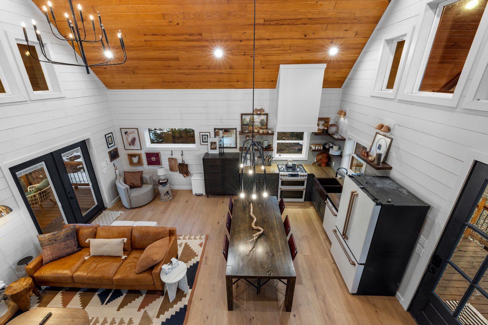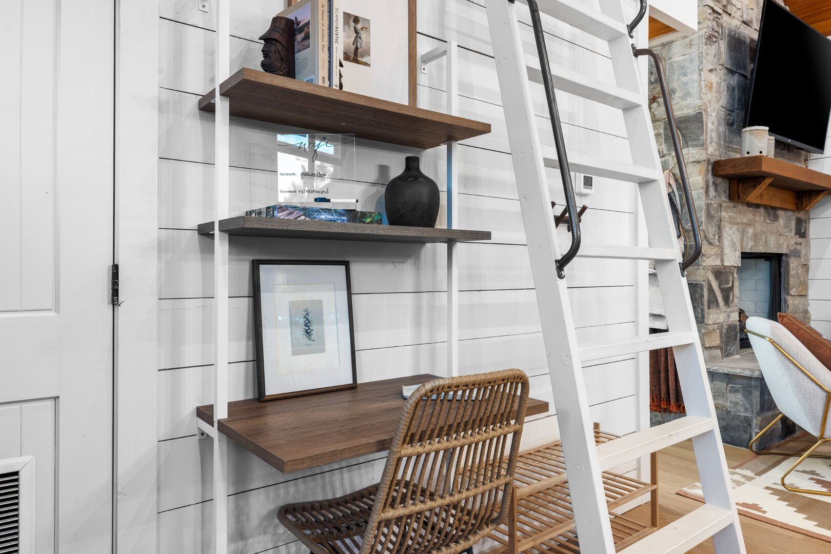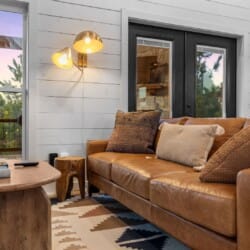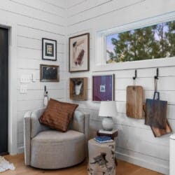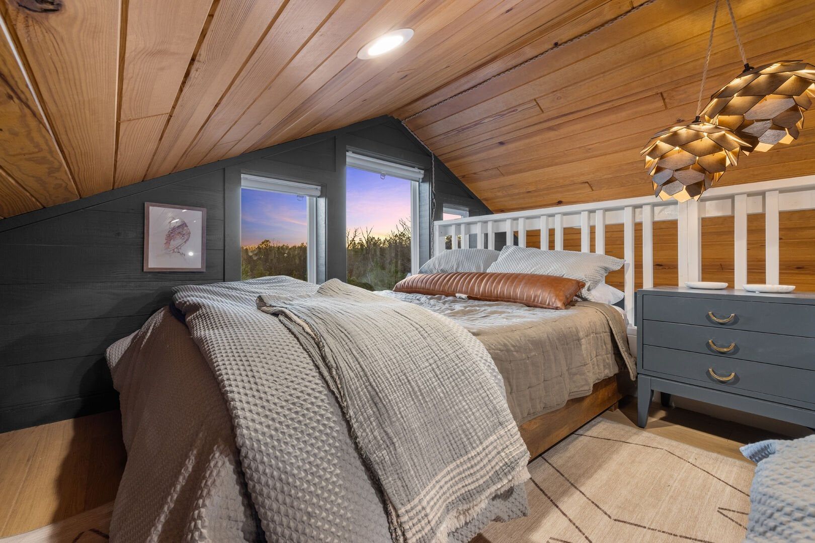 Pine and Bow Lodge blends rustic character with contemporary amenities, creating a unique feel that’s both inviting and elegant. The open living area features a plush couch and chairs, a stunning gas fireplace, and a large smart TV for relaxing evenings. A dedicated desk and chair give guests a quiet spot to catch up on work or browse online using the fast Wi-Fi. Large windows and natural light enhance the space, while modern lighting and textures bring a designer touch. At Pine and Bow Lodge, whether you’re curled up with a book or enjoying a movie with loved ones, every corner invites you to slow down and unwind.