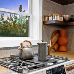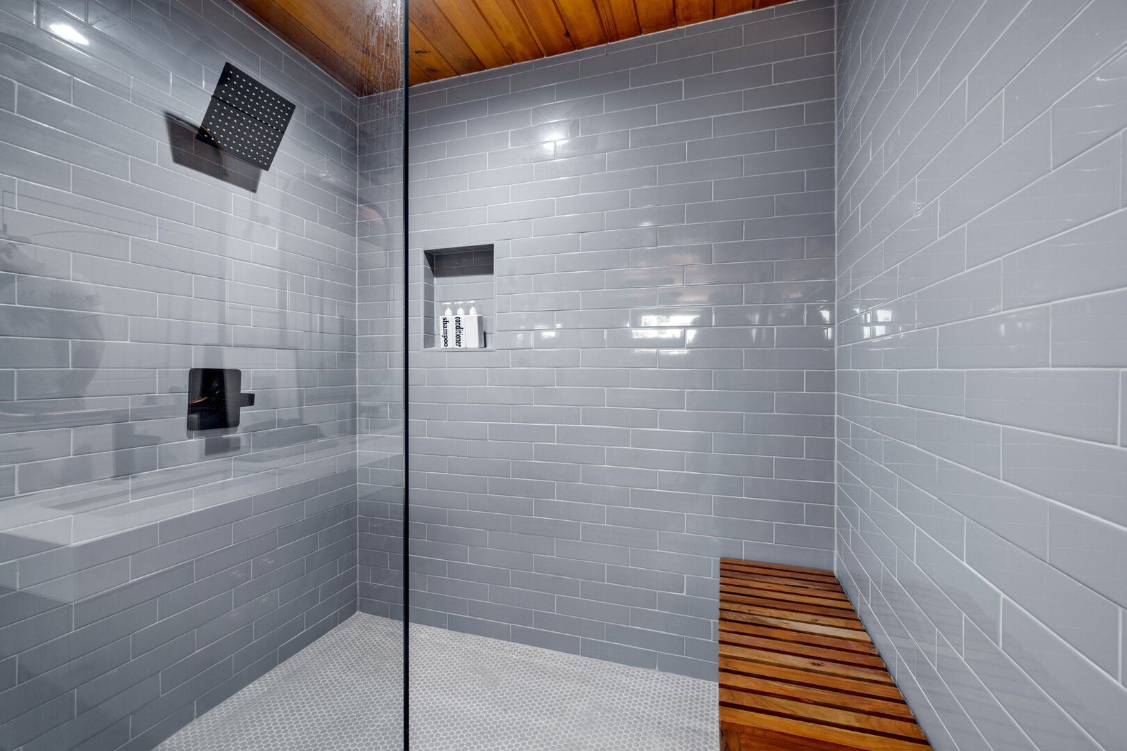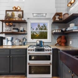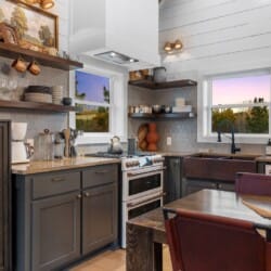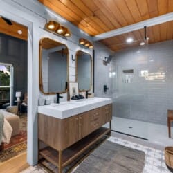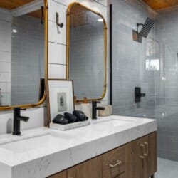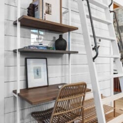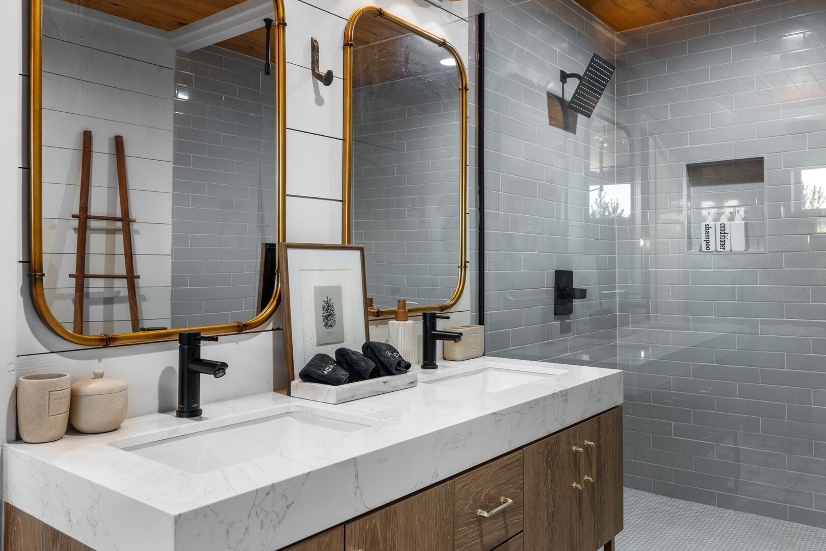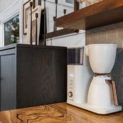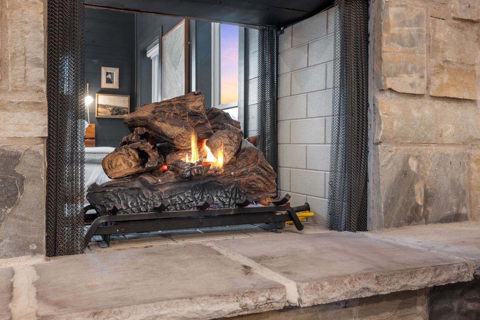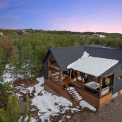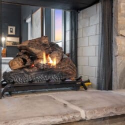 Pine and Bow Lodge blends rustic character with contemporary amenities, creating a unique feel that’s both inviting and elegant. The open living area features a plush couch and chairs, a stunning gas fireplace, and a large smart TV for relaxing evenings. A dedicated desk and chair give guests a quiet spot to catch up on work or browse online using the fast Wi-Fi. Large windows and natural light enhance the space, while modern lighting and textures bring a designer touch. At Pine and Bow Lodge, whether you’re curled up with a book or enjoying a movie with loved ones, every corner invites you to slow down and unwind.