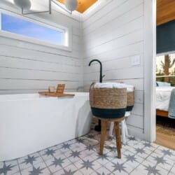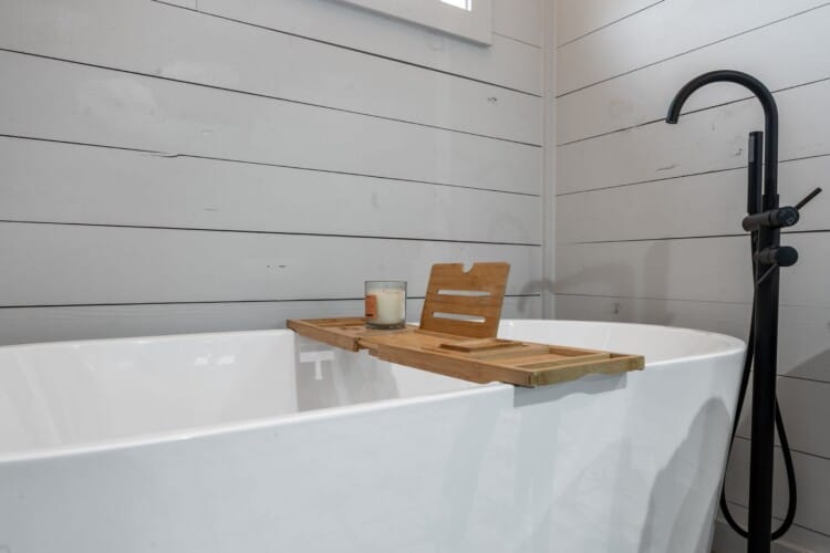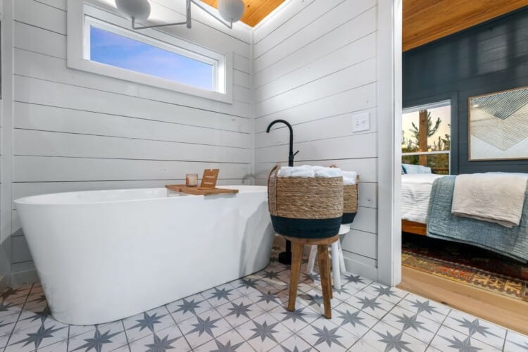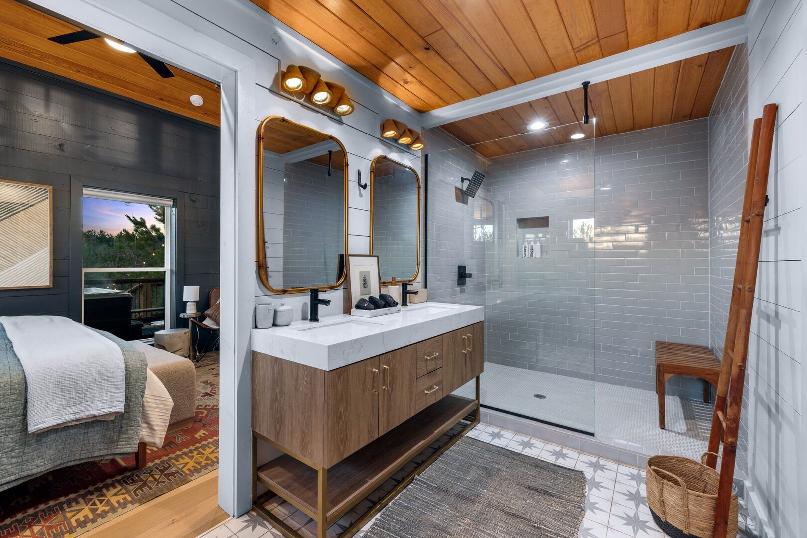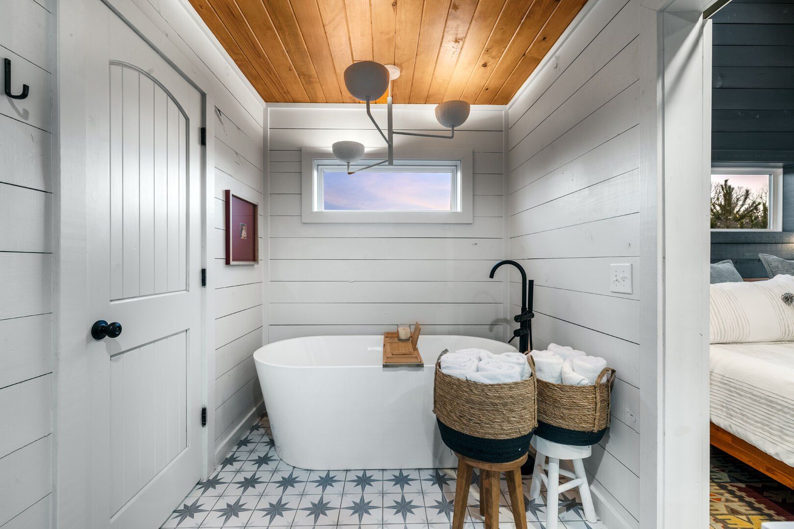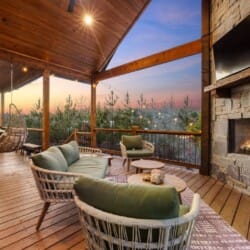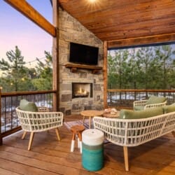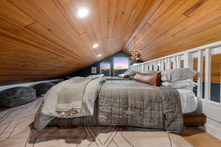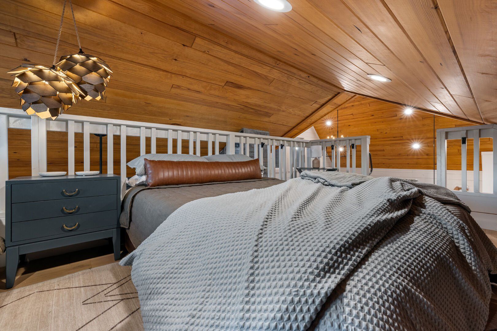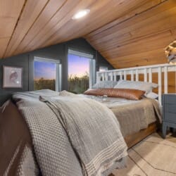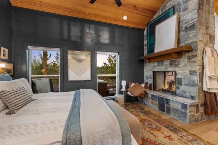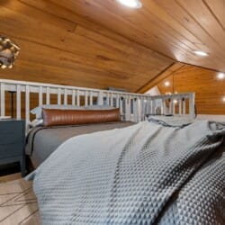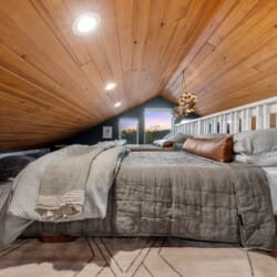 Pine and Bow Lodge features a peaceful king-size bedroom on the first floor, complete with a private door to the back deck. The master bathroom includes a deep soaking tub, a double vanity, and a large walk-in shower. Upstairs, the loft provides two queen beds, offering a great setup for kids, teens, or additional adults. Each bed is thoughtfully styled, and guests will appreciate the thoughtful touches, such as ottomans, nightstands, and luggage racks, that make settling in easy. Pine and Bow Lodge combines comfort with functionality, so you always feel at home.