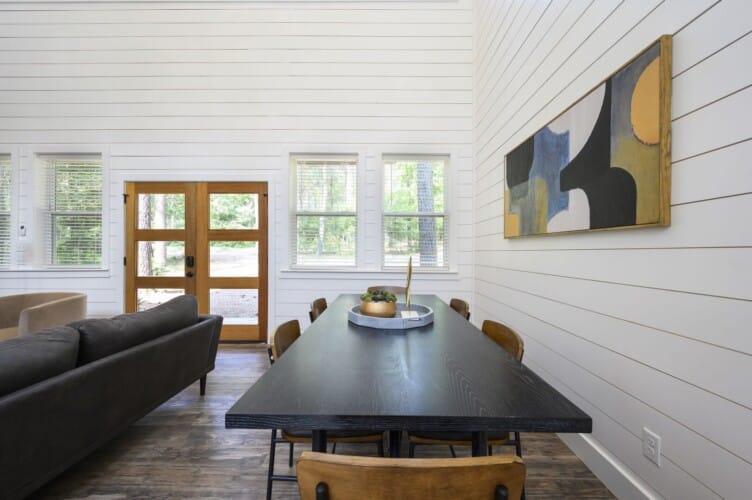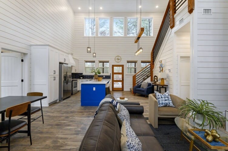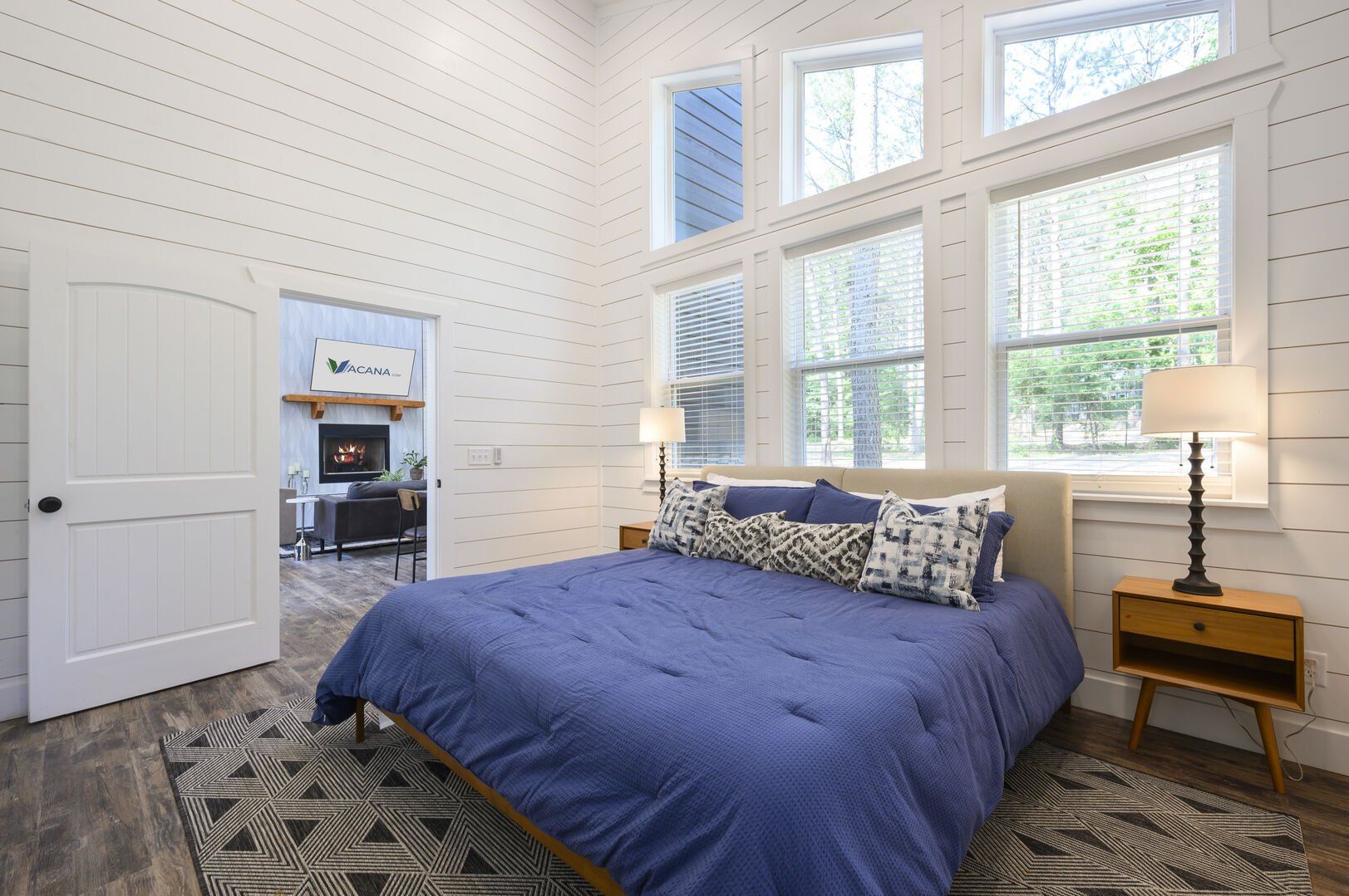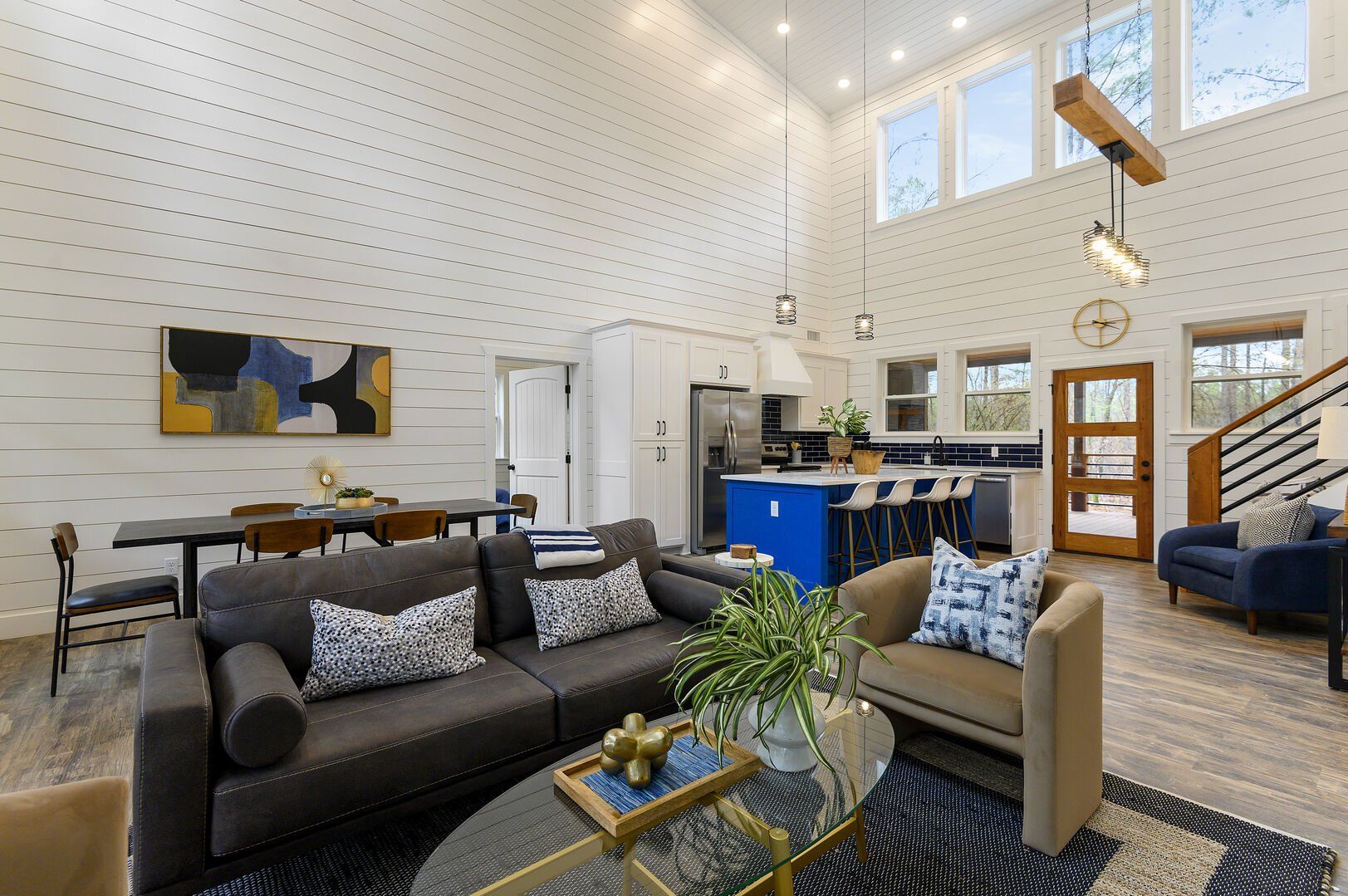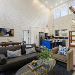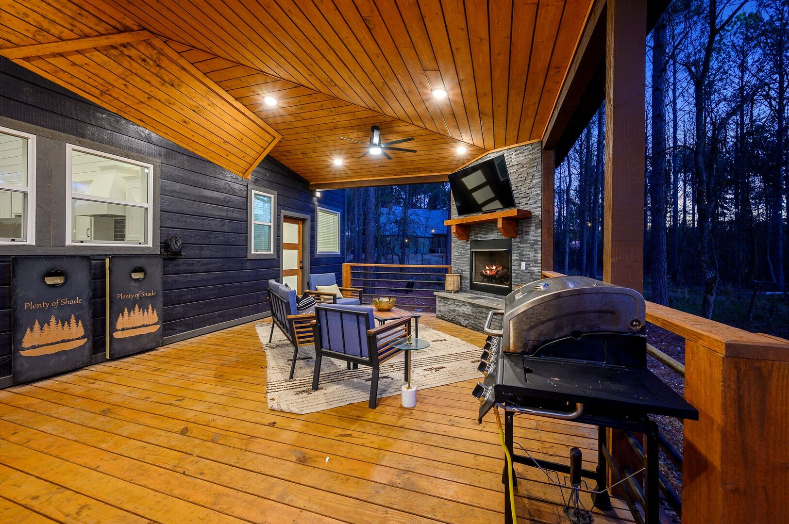 Inside Plenty of Shade, the open-concept living space welcomes everyone with warm wood floors, tall ceilings, and large windows. The living room centers around a soft couch, cozy accent chairs, and a gas fireplace that makes cool evenings extra relaxing. A large flat-screen TV hangs above the mantel, giving guests the perfect setup for movie nights or catching up on their favorite shows after a long day out.