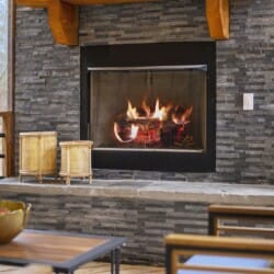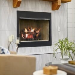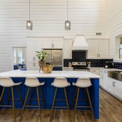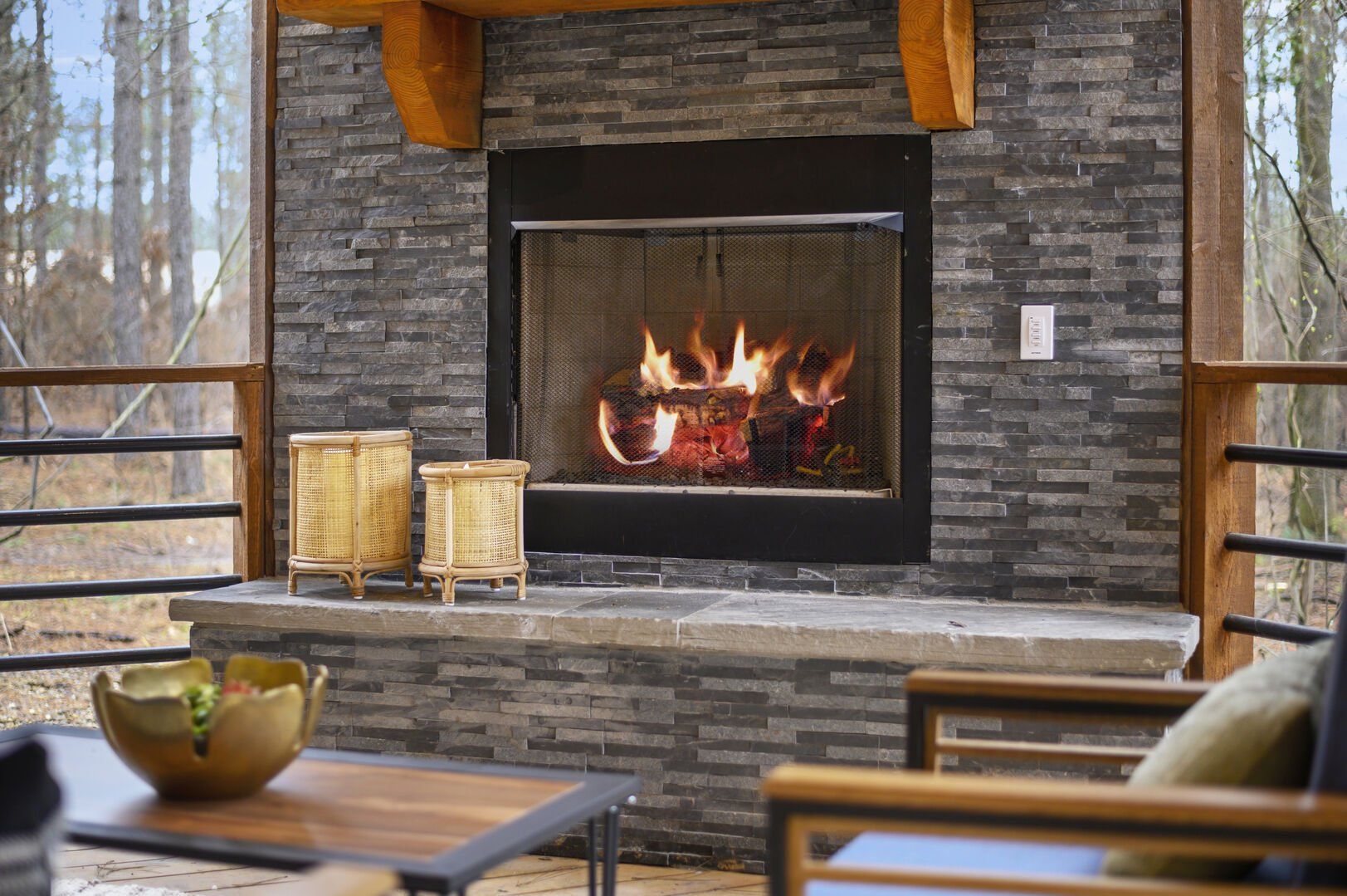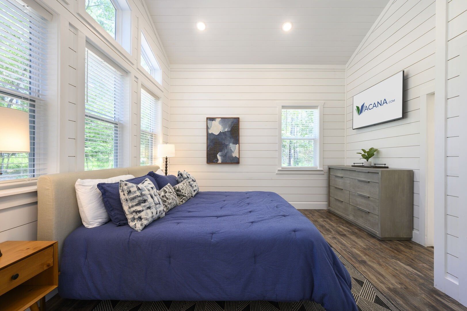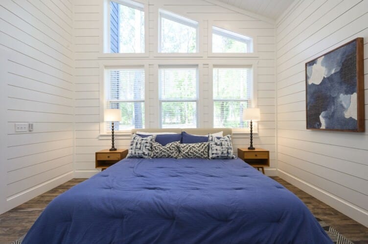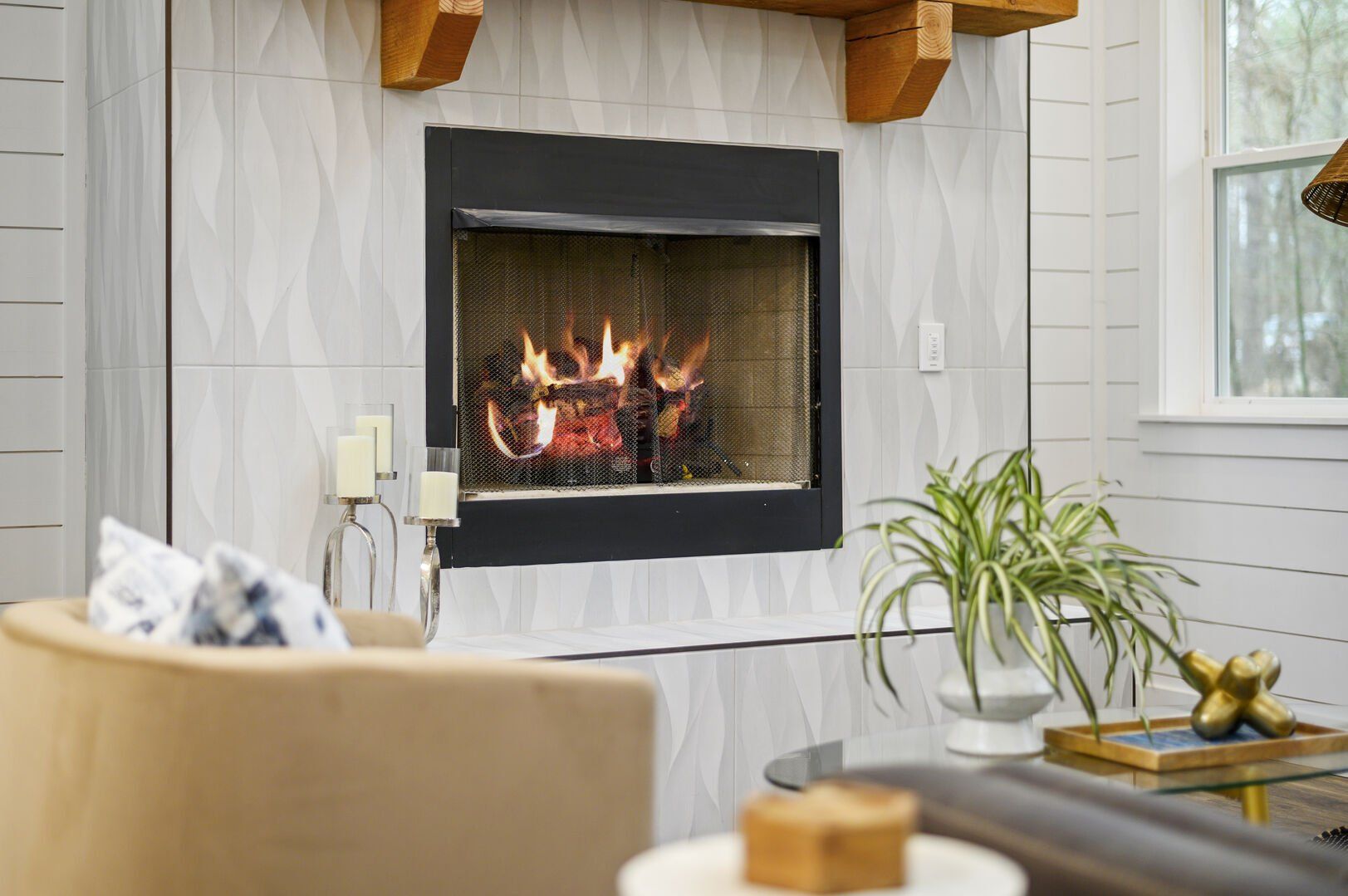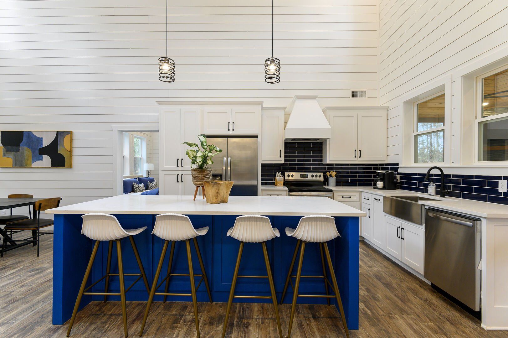 Inside Plenty of Shade, the open-concept living space welcomes everyone with warm wood floors, tall ceilings, and large windows. The living room centers around a soft couch, cozy accent chairs, and a gas fireplace that makes cool evenings extra relaxing. A large flat-screen TV hangs above the mantel, giving guests the perfect setup for movie nights or catching up on their favorite shows after a long day out.