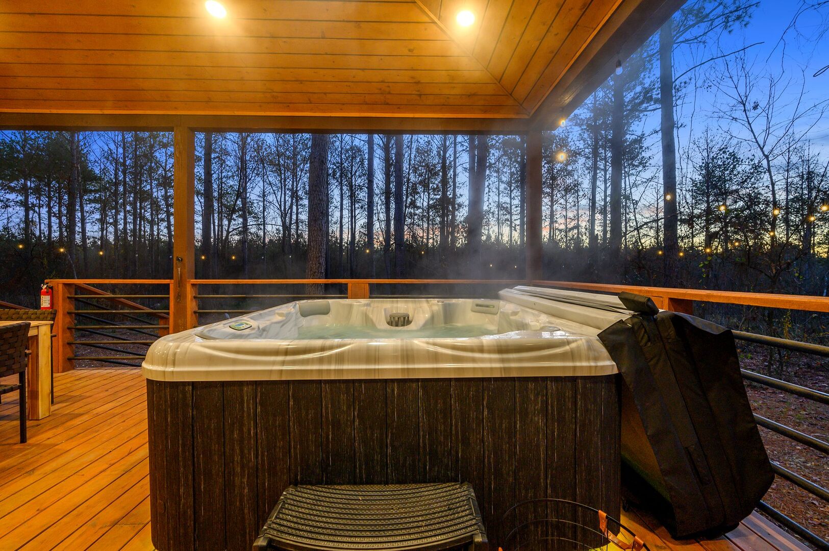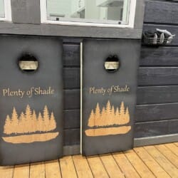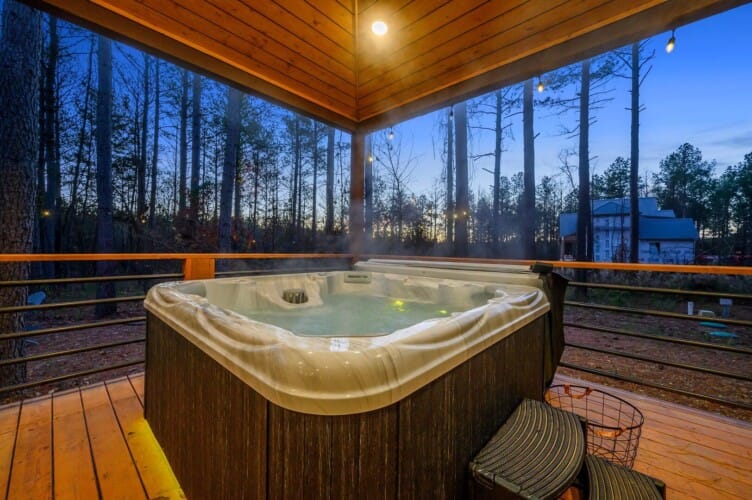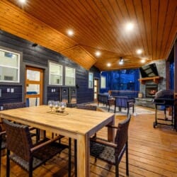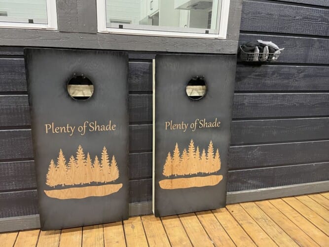 For added fun, Plenty of Shade offers a variety of games and outdoor activities. The backyard features a set of horseshoe pits and cornhole boards, ideal for friendly competition in the open air. A bubbling hot tub sits under a covered gazebo, allowing guests to relax regardless of the weather. In the evening, the fire pit beneath string lights becomes the heart of the outdoor space, with seating for six and plenty of room for stories, laughter, and marshmallows under the stars.