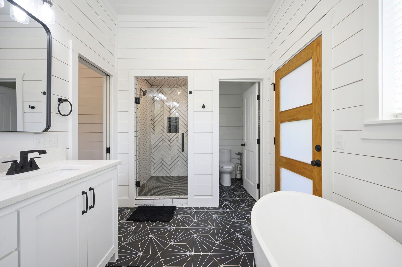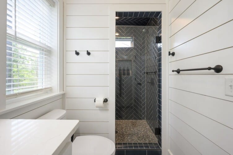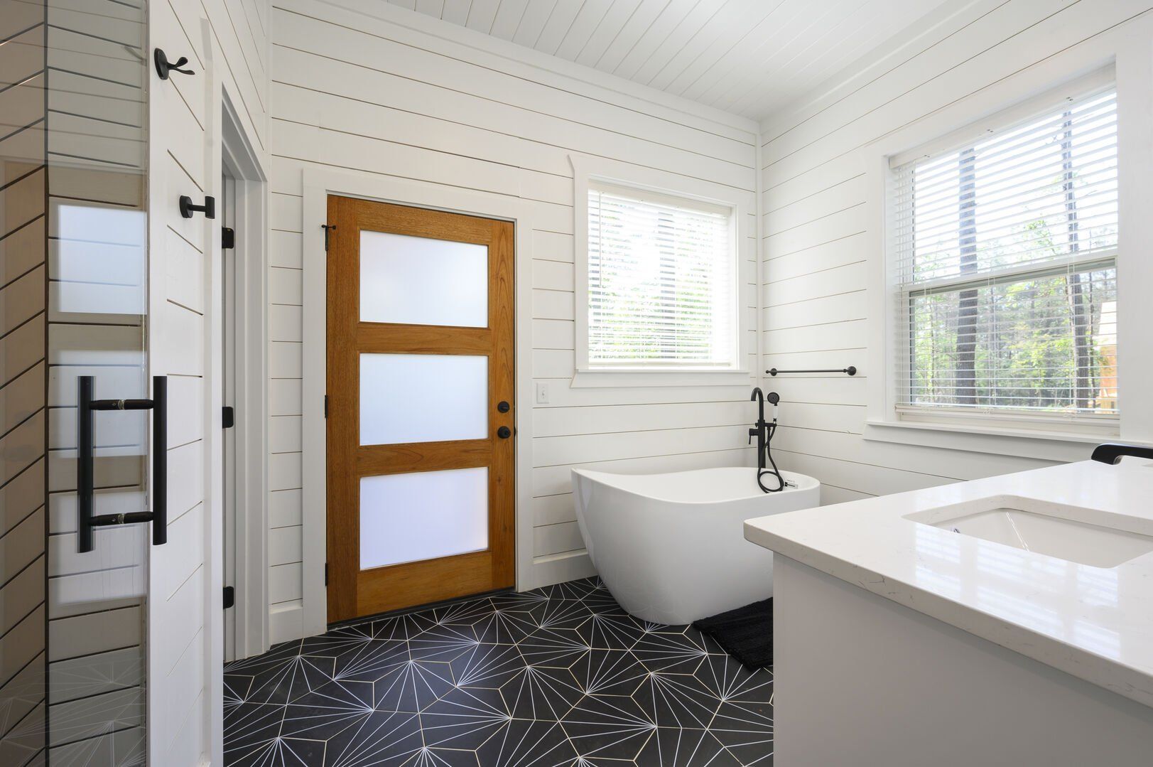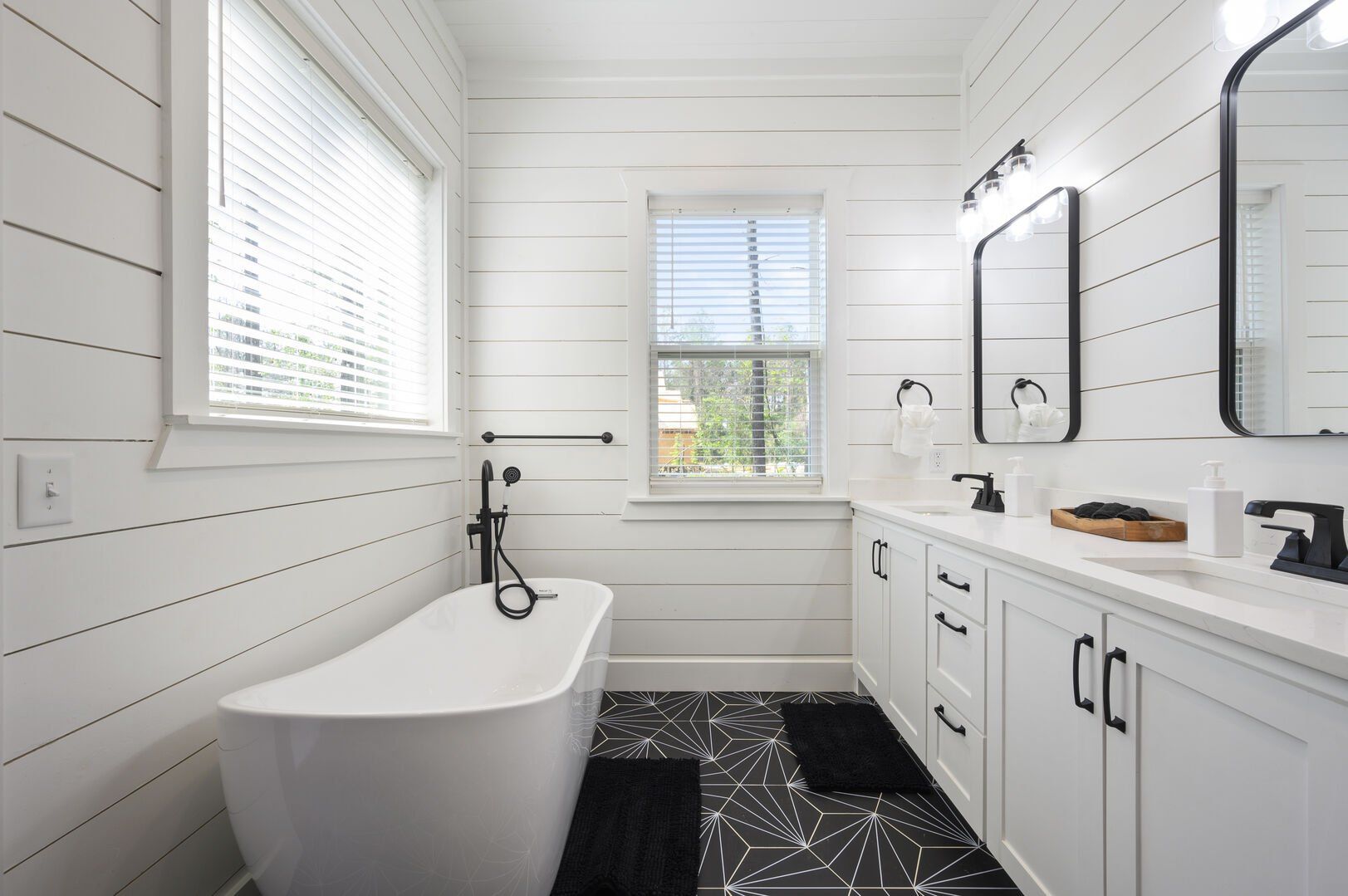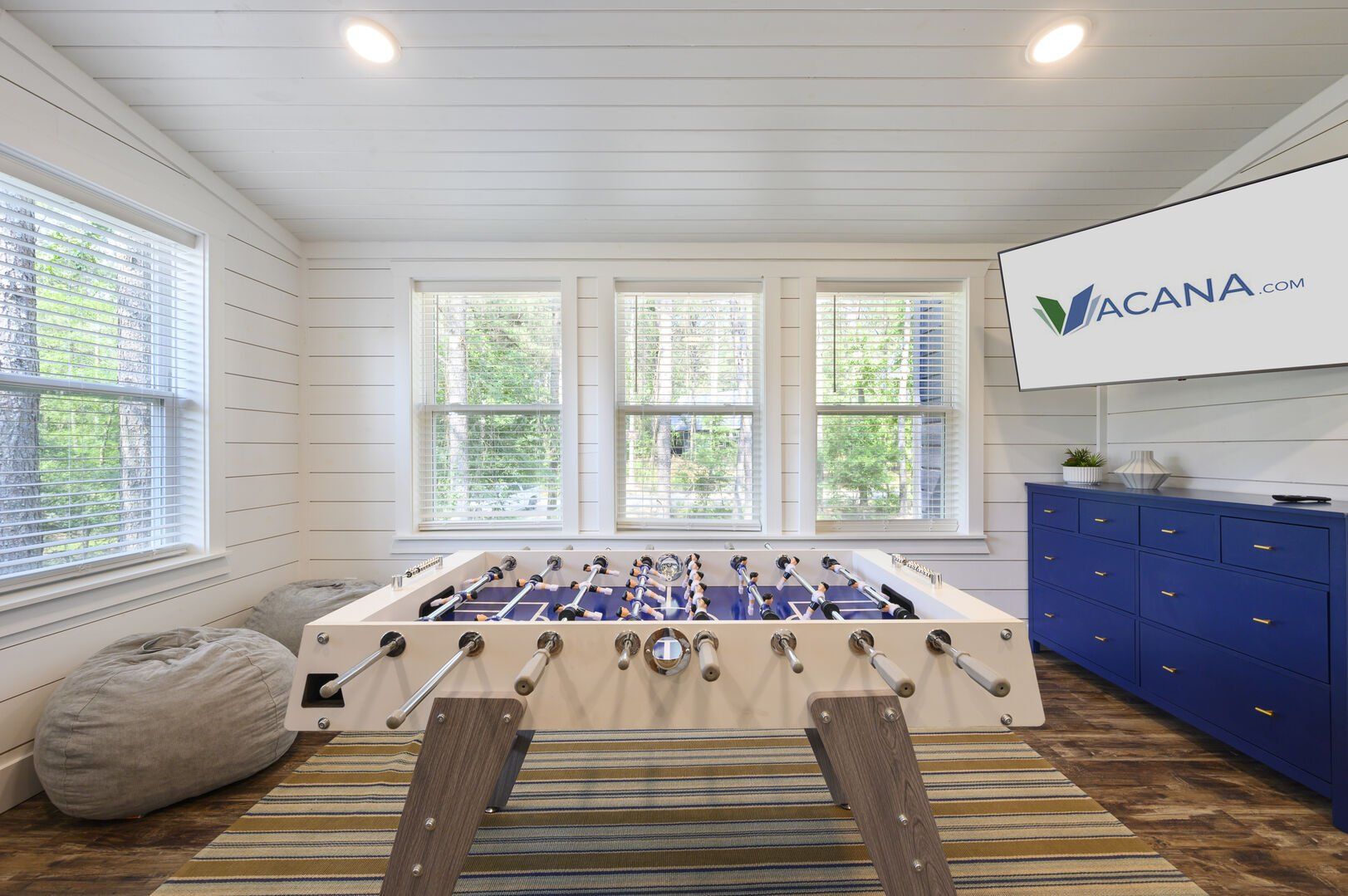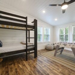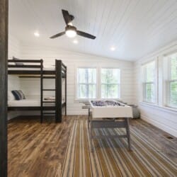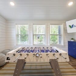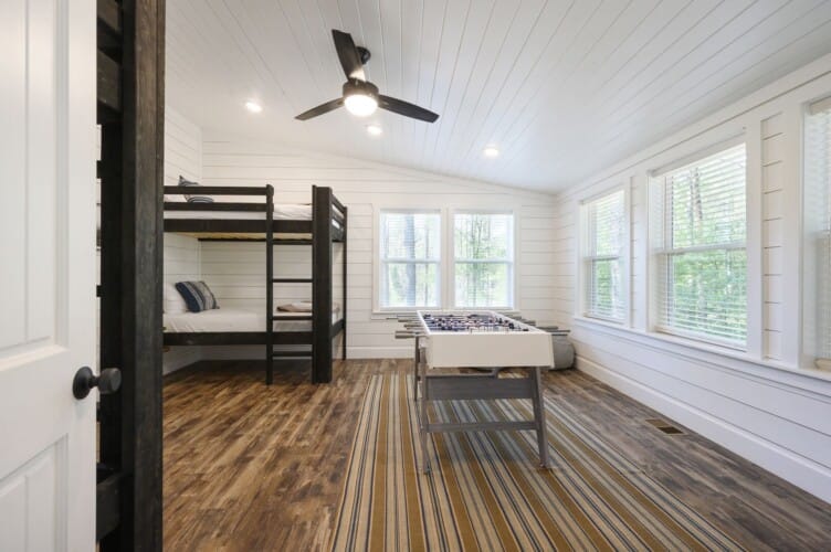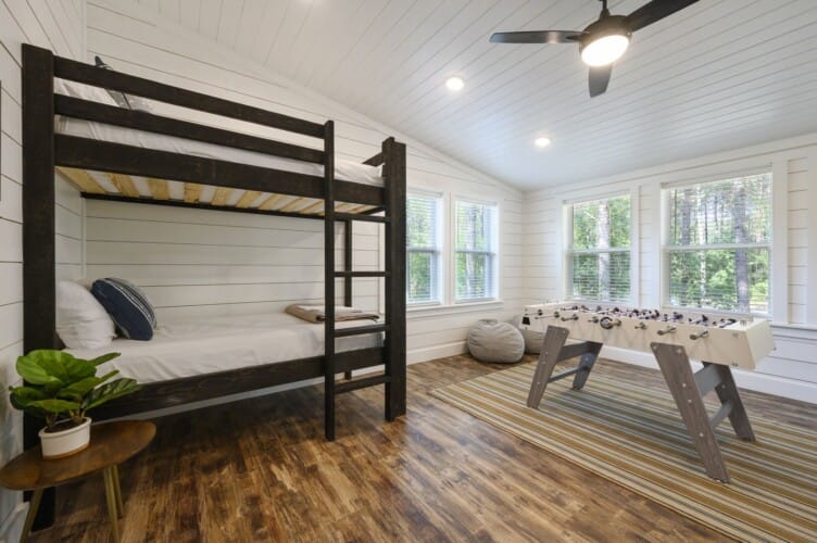 Each bedroom in Plenty of Shade is designed with rest in mind. The two king suites, located on separate levels, both feature comfortable bedding, closet space, and private bathrooms. The en-suite bathrooms include walk-in showers and large soaking tubs, providing guests with a private, spa-like experience. The bunk room, perfect for kids or extra guests, includes four twin beds, a full bathroom, and even a foosball table to keep everyone entertained.