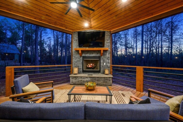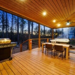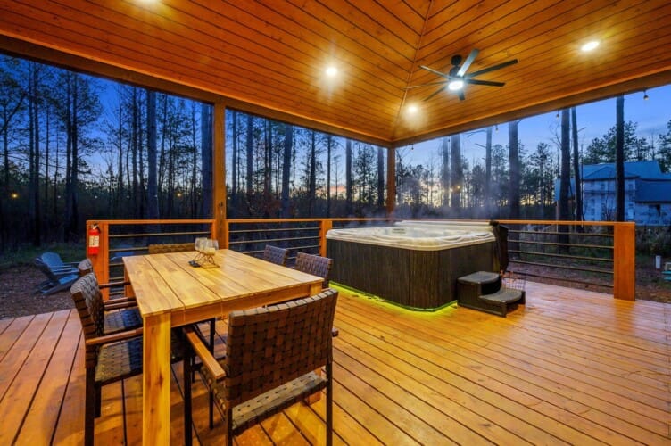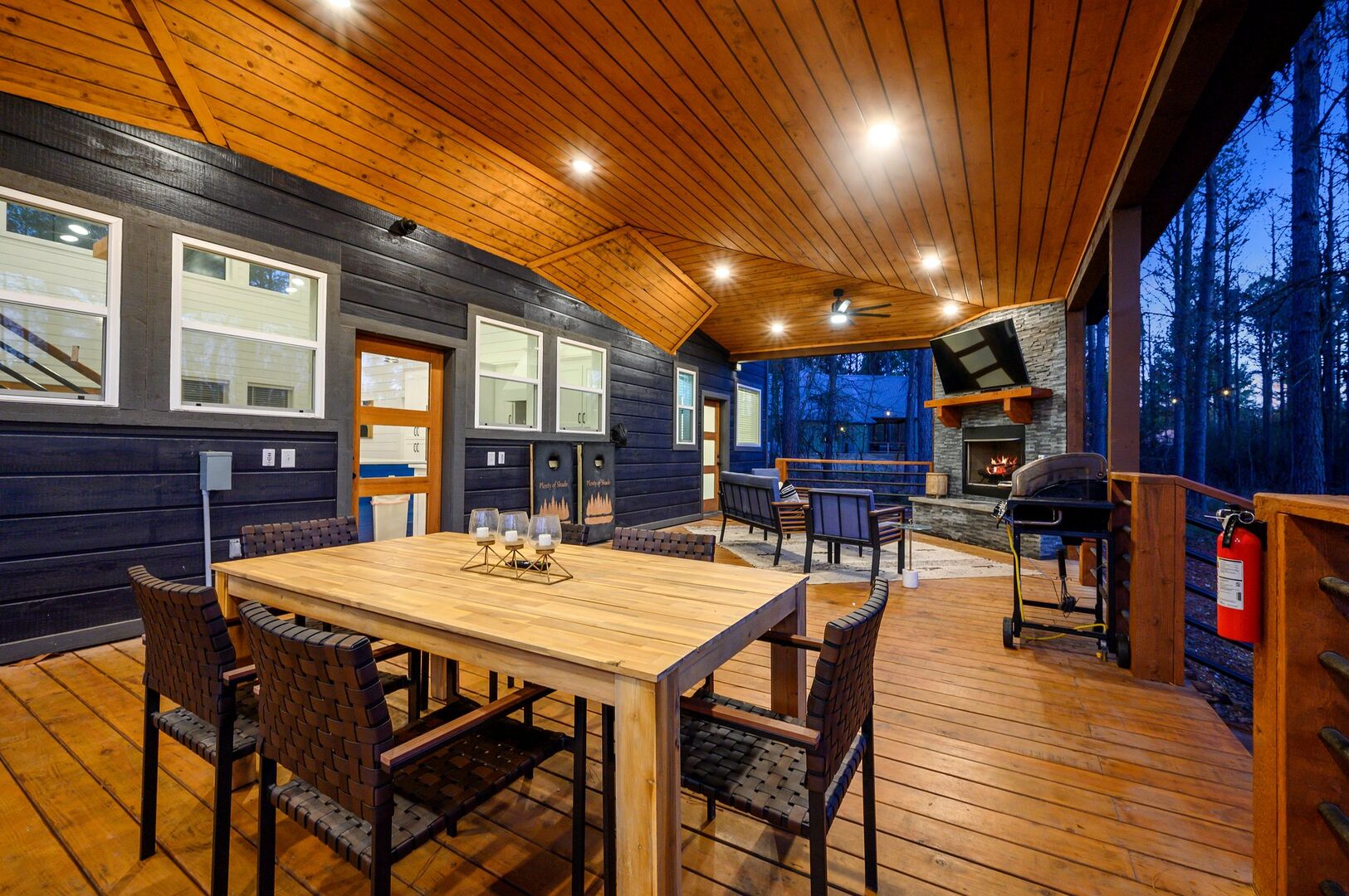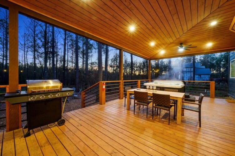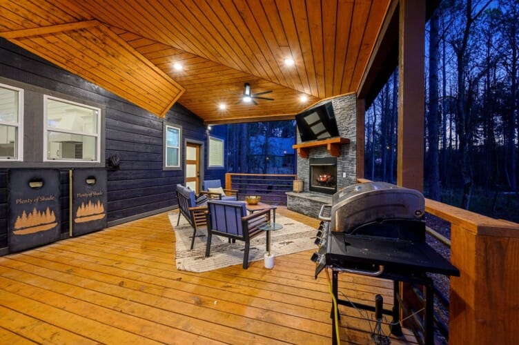 The deck at Plenty of Shade stretches across the back of the cabin and overlooks the peaceful forest. A propane grill and outdoor dining area make it easy to host cookouts or enjoy quiet breakfasts while taking in the view. The cabin also includes a washing machine and dryer, high-speed Wi-Fi, and easy access to local attractions just a short drive away.