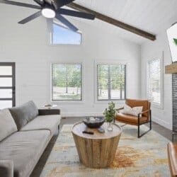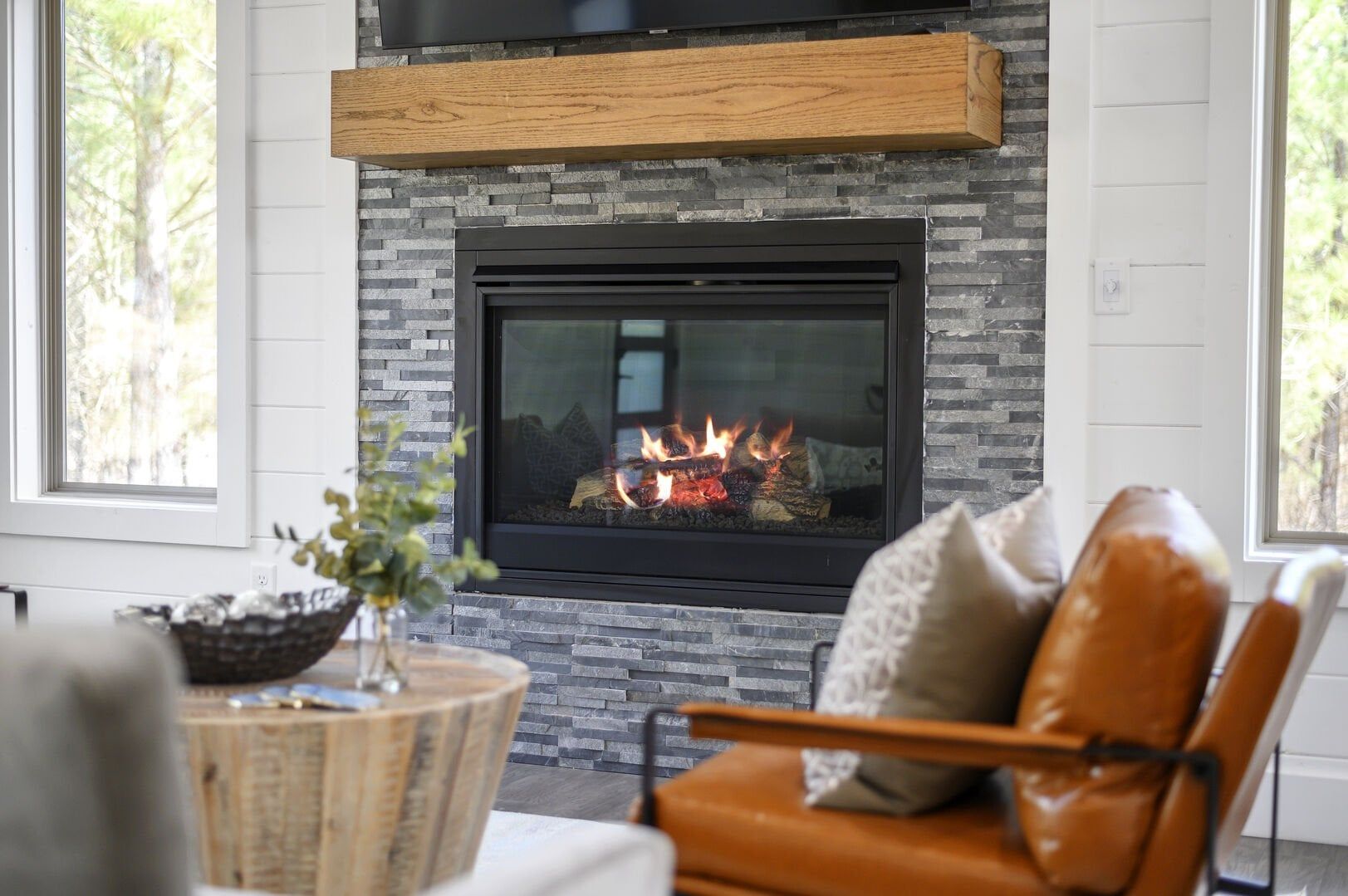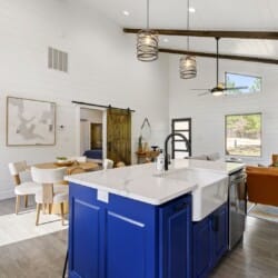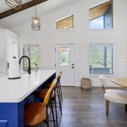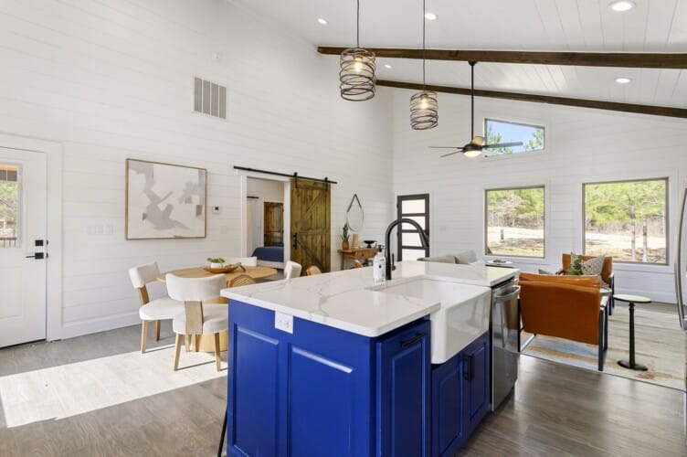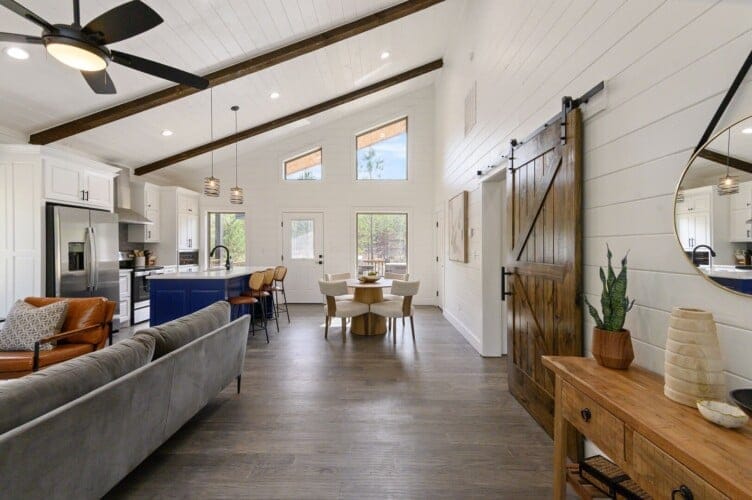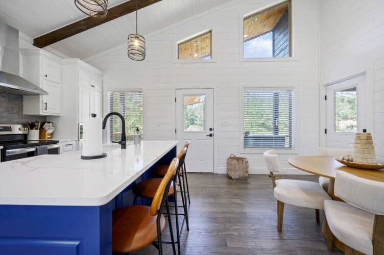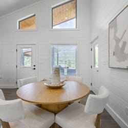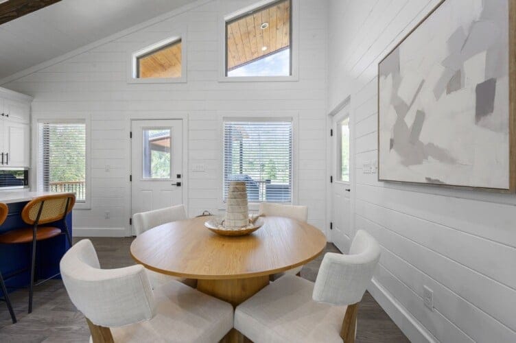 Reflect welcomes you with an open-concept living room that flows into a kitchen and dining space. The floors feature a warm wood finish, and the vaulted ceiling stretches high above, allowing natural light to enter through the tall windows. As you walk into the space, you can settle into the soft couch, light the indoor gas fireplace, and watch your favorites on the flat-screen TV. Whether it’s cool in the evenings or sunny in the afternoon, Reflect has been thoughtfully designed for year-round comfort.