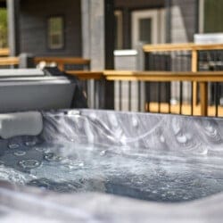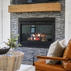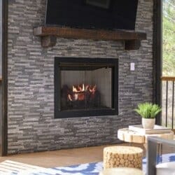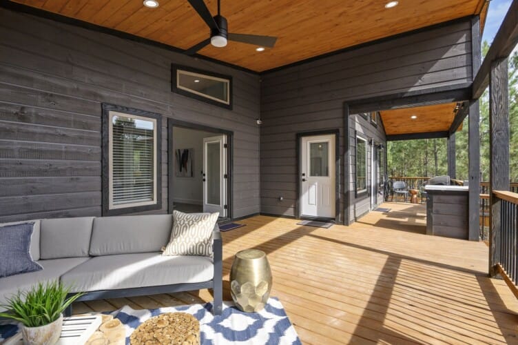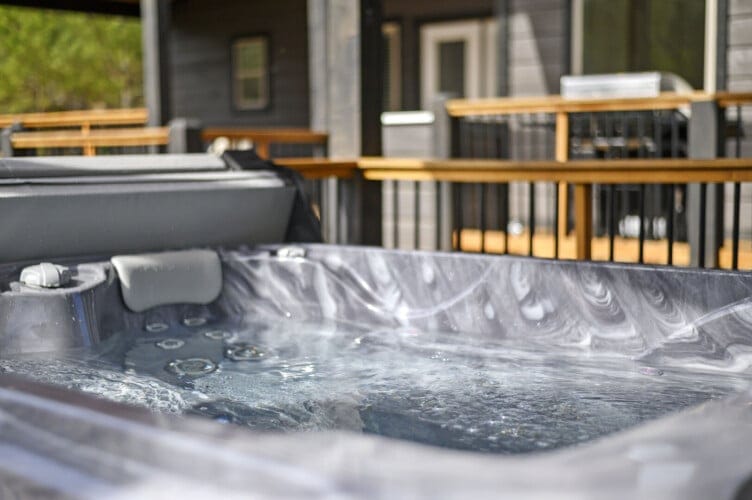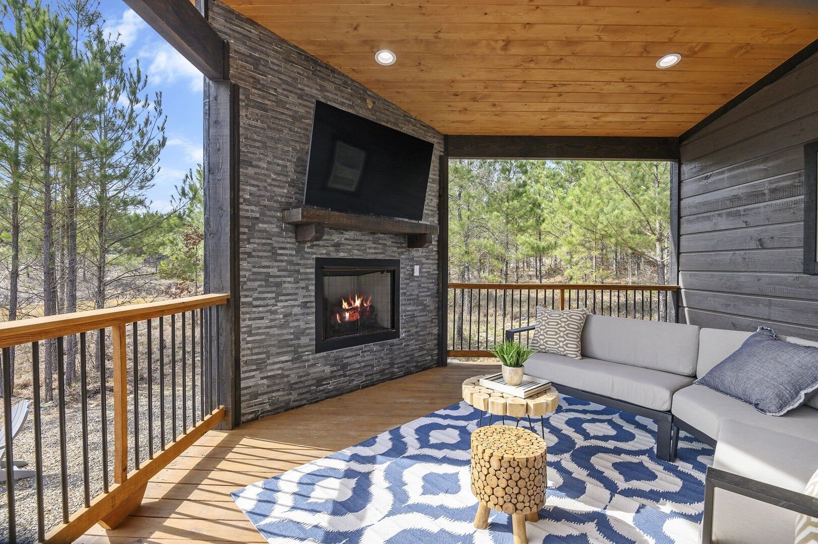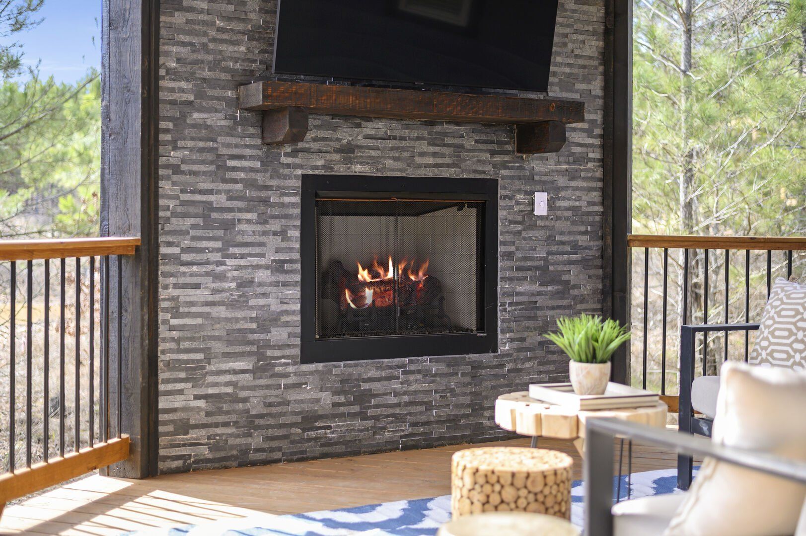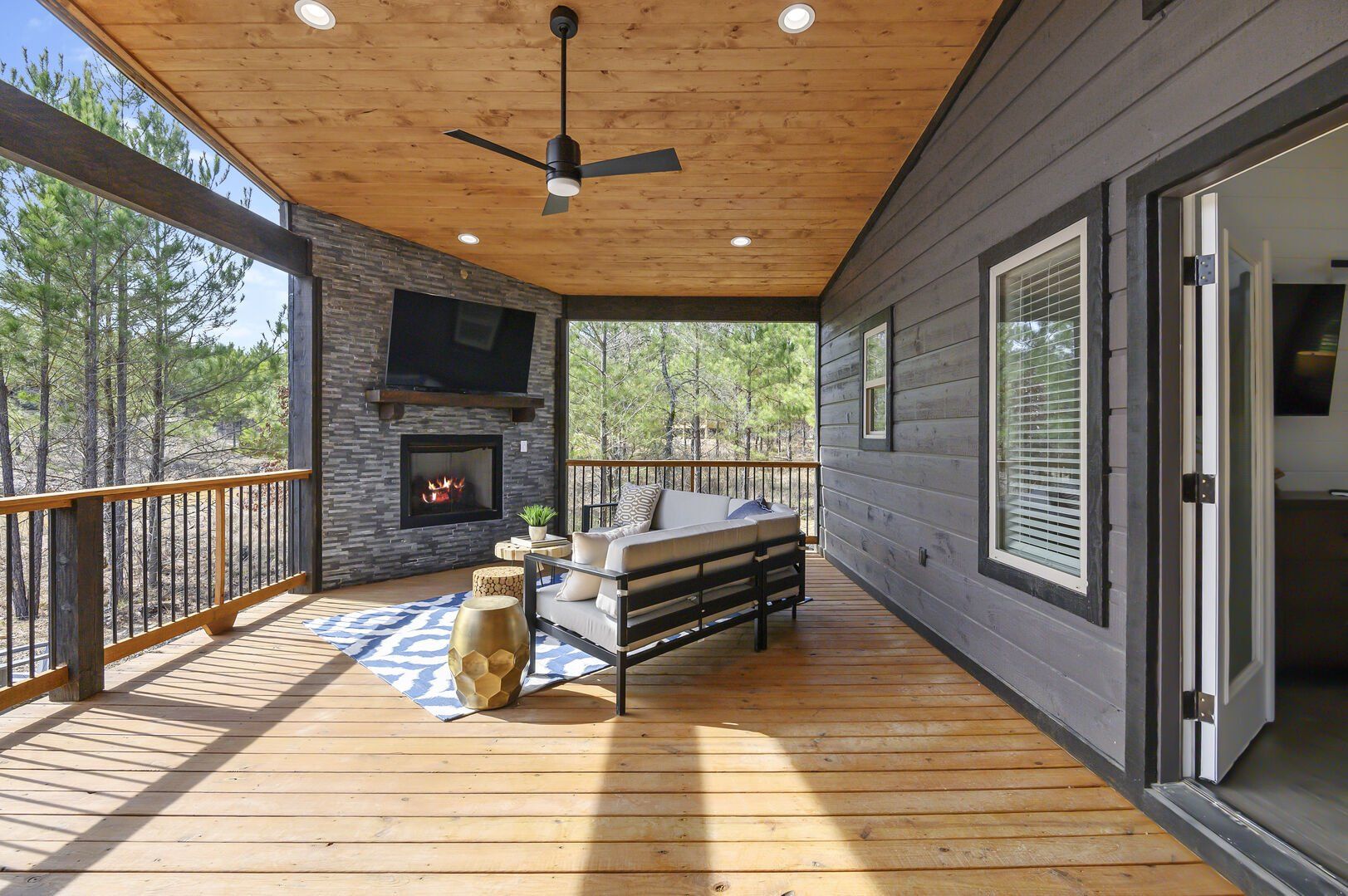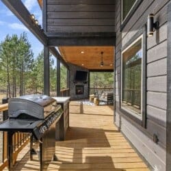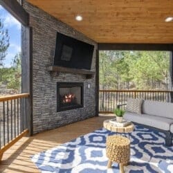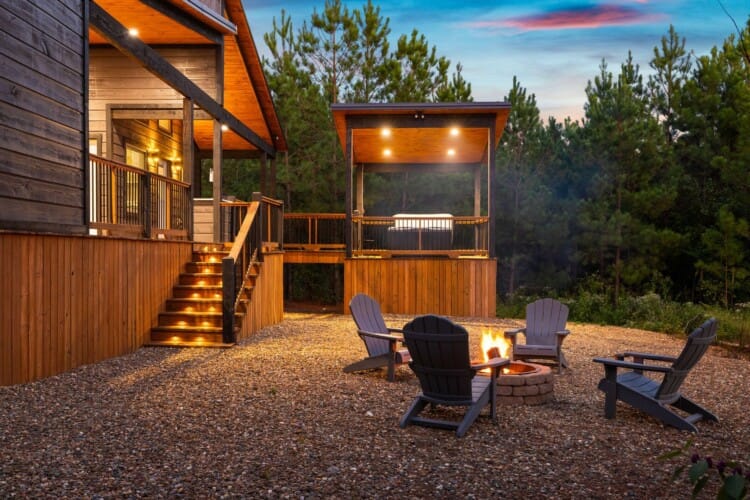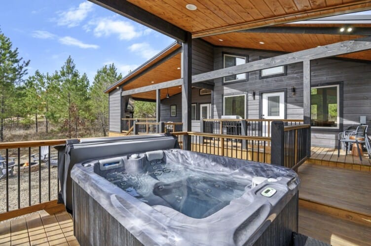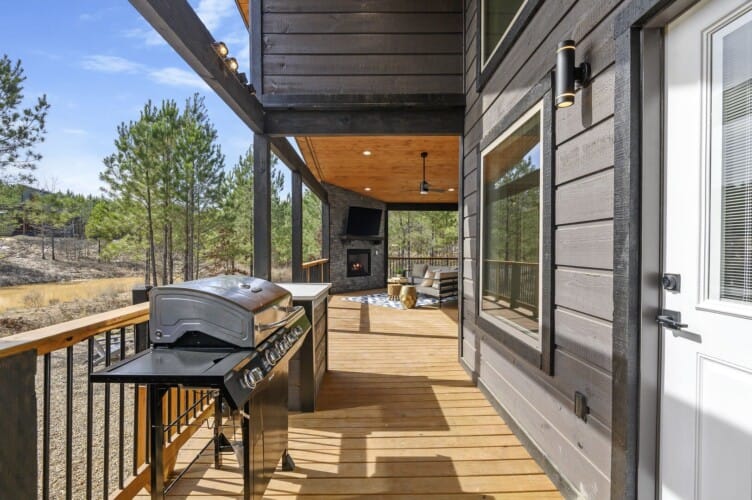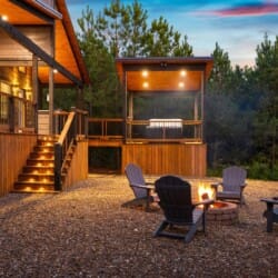 Outside, Reflect truly shines. The deck stretches across the back of the cabin, offering stunning views of the surrounding trees. There is a covered, gazebo-style hot tub that provides privacy while still allowing you to feel close to nature. A fire pit with string lights and four comfortable chairs sits nearby, offering a quiet space for making s’mores or sharing stories. The patio area, complete with a propane grill, is ideal for cooking out and dining under the sky. Reflect was designed with quiet moments in mind, and its outdoor space captures that beautifully.