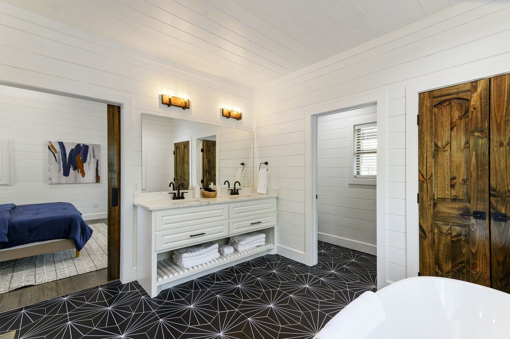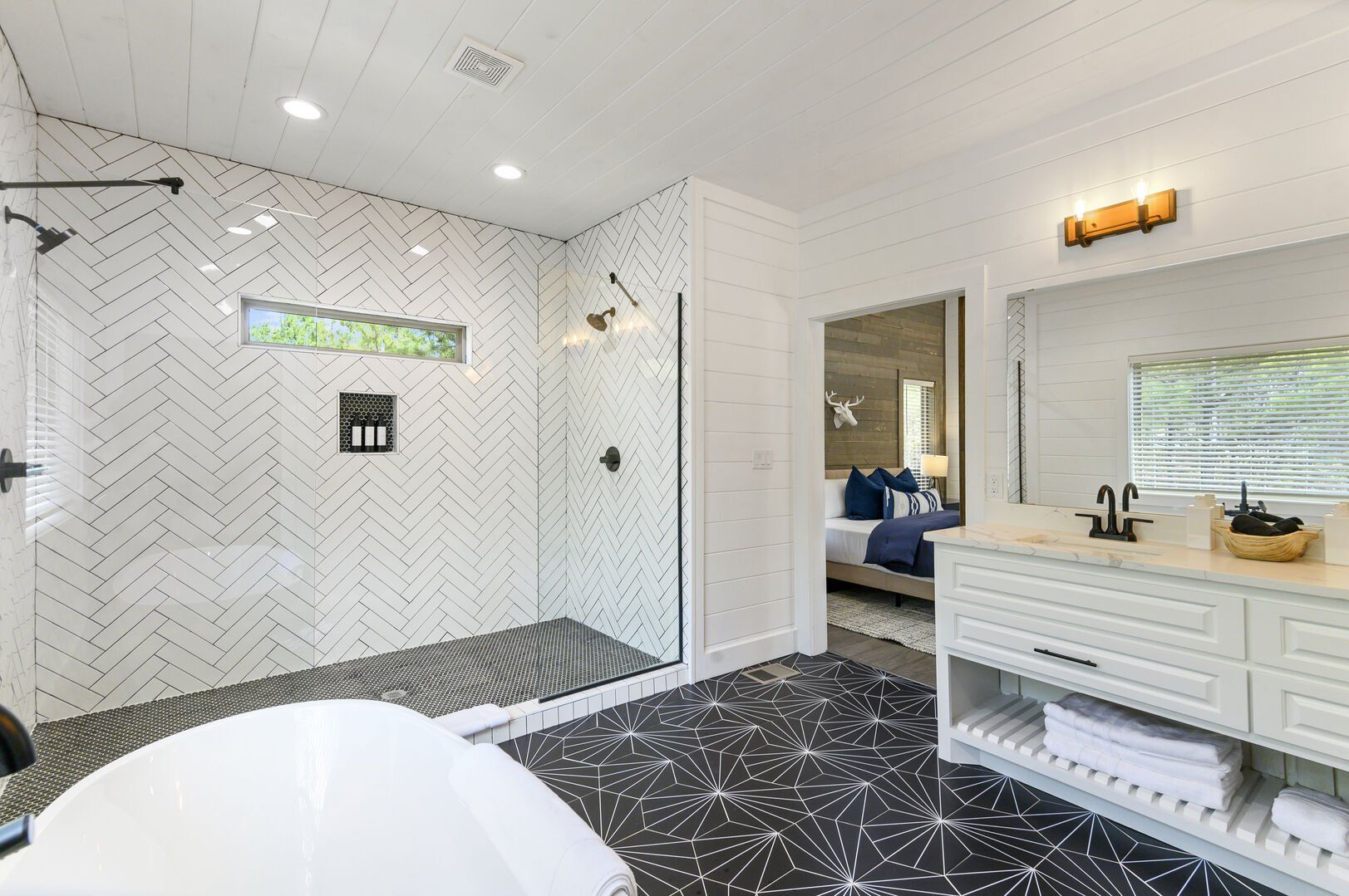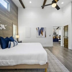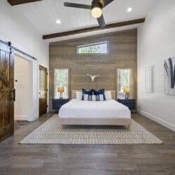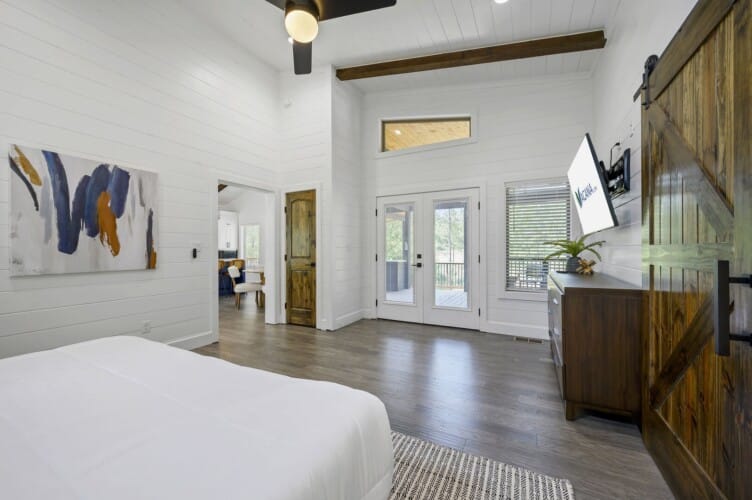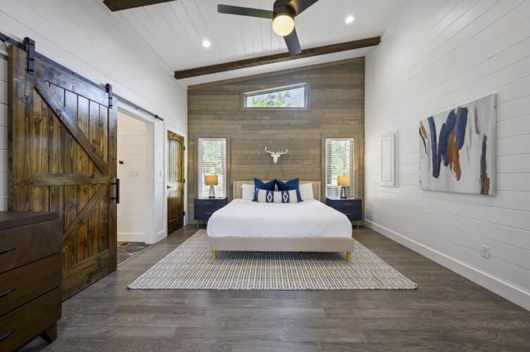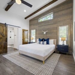 Reflect has one king-size bedroom, perfect for couples seeking peace and privacy. The king bed is fitted with soft linens and is surrounded by wood accents that create a warm and welcoming atmosphere. A sliding glass door leads straight from the bedroom to the patio, so you can step outside to sip coffee in the morning or stargaze at night. Reflect’s ensuite bathroom adds even more comfort with a dual vanity, a large walk-in shower, and a soaking tub. After a long day of exploring the area, this is the perfect spot to unwind.