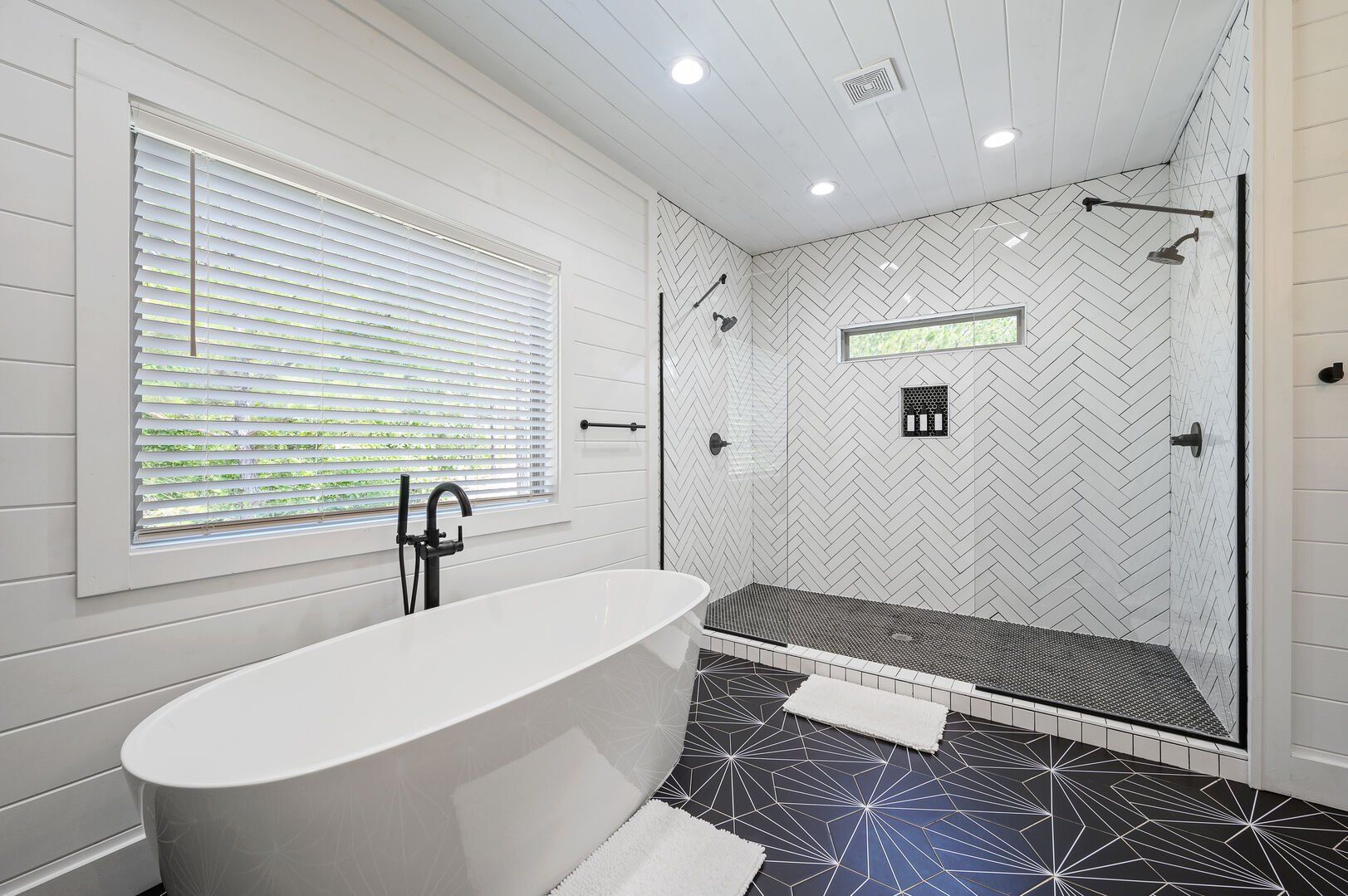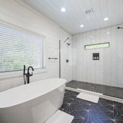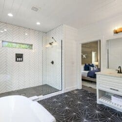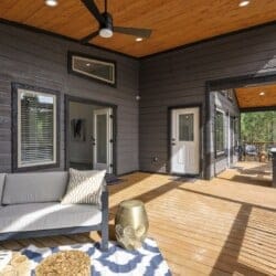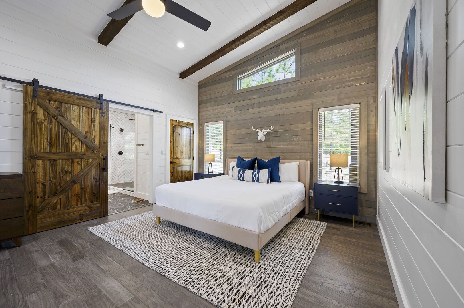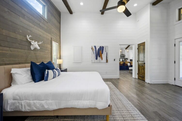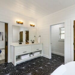 Reflect has one king-size bedroom, perfect for couples seeking peace and privacy. The king bed is fitted with soft linens and is surrounded by wood accents that create a warm and welcoming atmosphere. A sliding glass door leads straight from the bedroom to the patio, so you can step outside to sip coffee in the morning or stargaze at night. Reflect’s ensuite bathroom adds even more comfort with a dual vanity, a large walk-in shower, and a soaking tub. After a long day of exploring the area, this is the perfect spot to unwind.