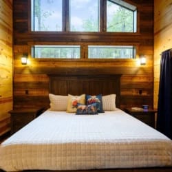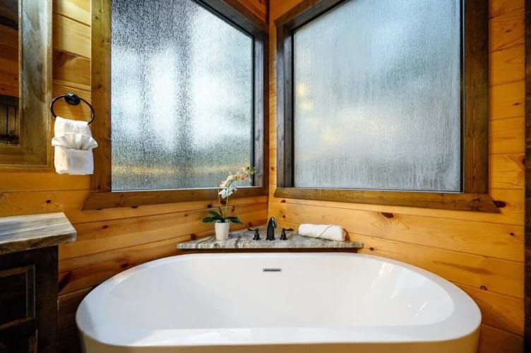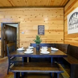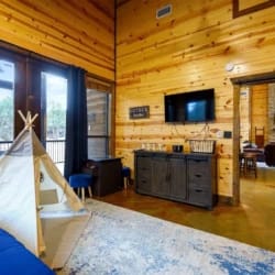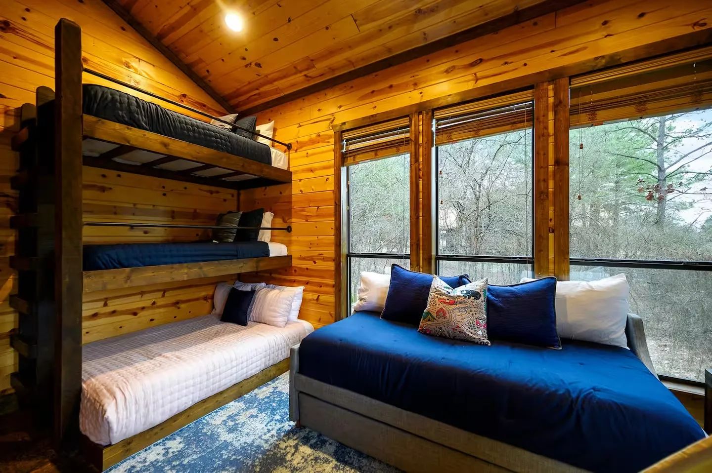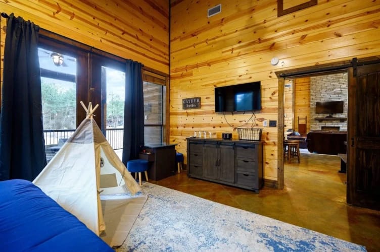 Families traveling with kids will find The Retreat at Water’s Edge especially inviting. The property includes an outdoor playset that keeps little ones entertained for hours, while adults can relax nearby, soaking in the views and fresh air. The cabin is all on one level, making it accessible and convenient for all guests. Every detail has been thoughtfully designed to ensure your comfort—from room-darkening curtains in every bedroom to high-quality linens, plush pillows, and bathroom amenities including soap, shampoo, and conditioner.