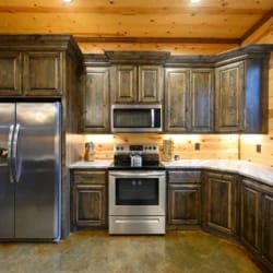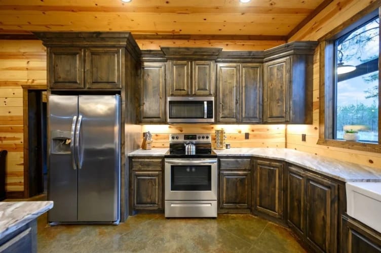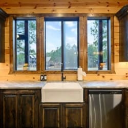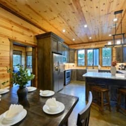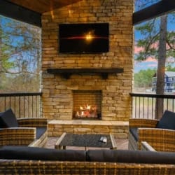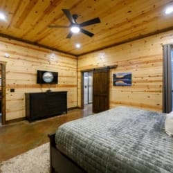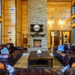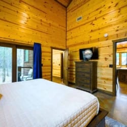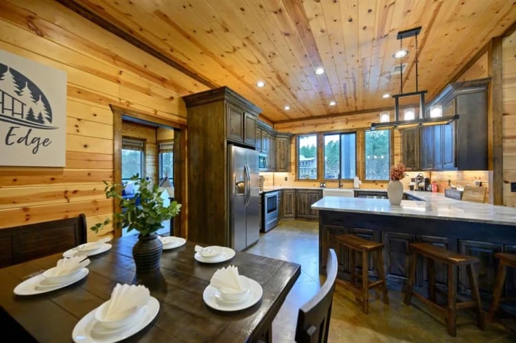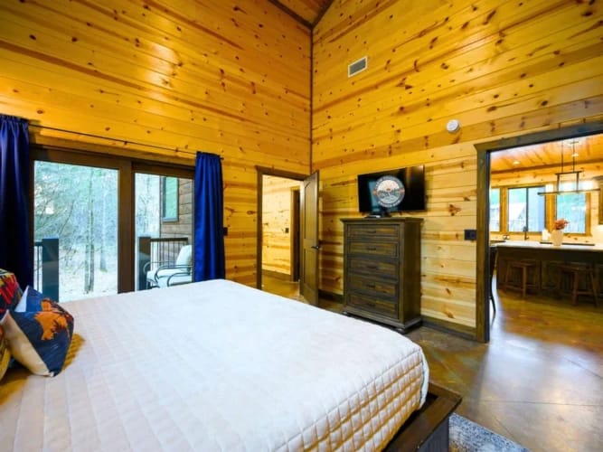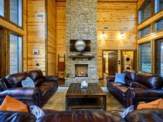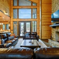From the moment you arrive at The Retreat at Water’s Edge, you’ll feel an immediate sense of calm. The sound of the water, the scent of pine, and the cabin’s warmth create a cozy, welcoming atmosphere. Step inside to find a beautifully appointed living space with 20-foot vaulted ceilings, a stone fireplace, and floor-to-ceiling windows that capture sunrise and sunset views. Whether you’re curling up by the fire with a good book or streaming your favorite show on the SMART TV with DirecTV cable, this living area provides the perfect balance of comfort and style.
