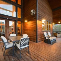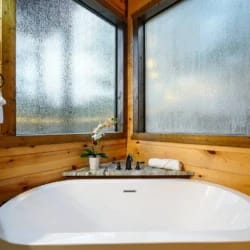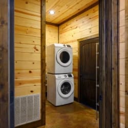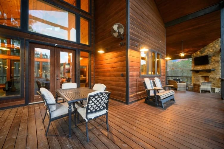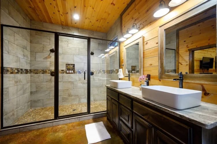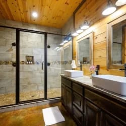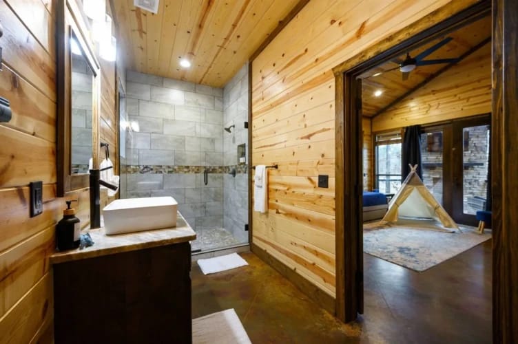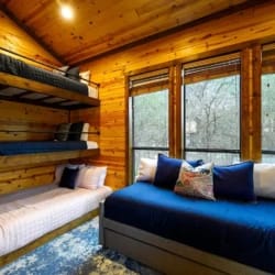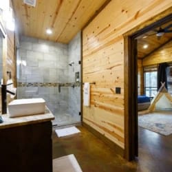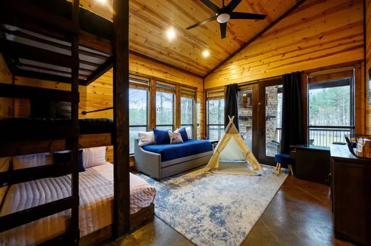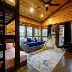 Rest comes easy at The Retreat at Water’s Edge, where comfort meets rustic elegance. Two master king suites offer plush bedding, private decks, and en suite bathrooms designed for relaxation. The second bedroom features a soaking tub and a spacious shower with dual showerheads. Ideal for a spa-like retreat. The third bedroom, affectionately called the bunk room, is a kid’s dream with arcade games, a foosball table, and enough sleeping space for six guests. It’s an ideal setup for families, giving kids their own playful corner while adults enjoy their quiet retreat.