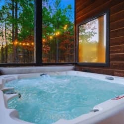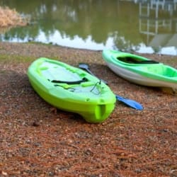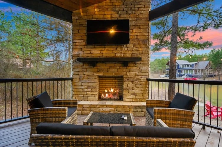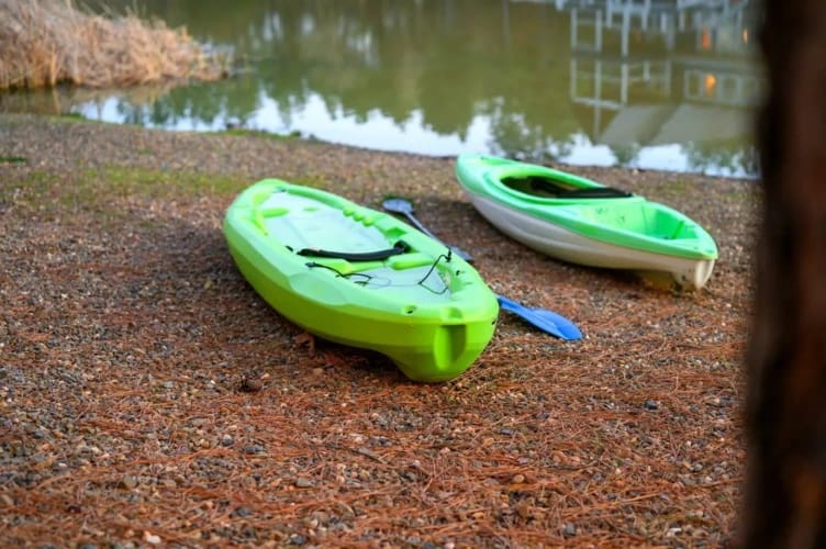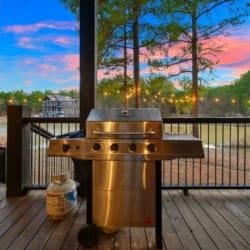Stepping outside The Retreat at Water’s Edge, guests are greeted by an expansive deck overlooking the calm waters of the pond. This outdoor haven is designed for fun, relaxation, and connection. Sip your morning coffee on the outdoor sofa, grill up your favorite meals, or unwind in the bubbling hot tub as the sun sets. As night falls, gather around the firepit under a canopy of string lights for starlit conversations and toasted marshmallows. Guests can also enjoy complimentary use of the two kayaks provided—perfect for exploring the peaceful pond or casting a line to catch dinner.