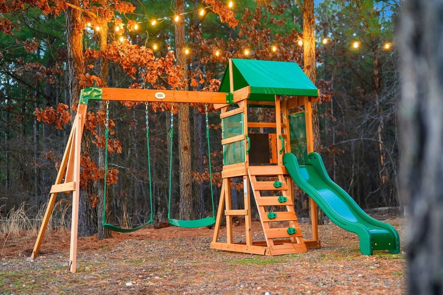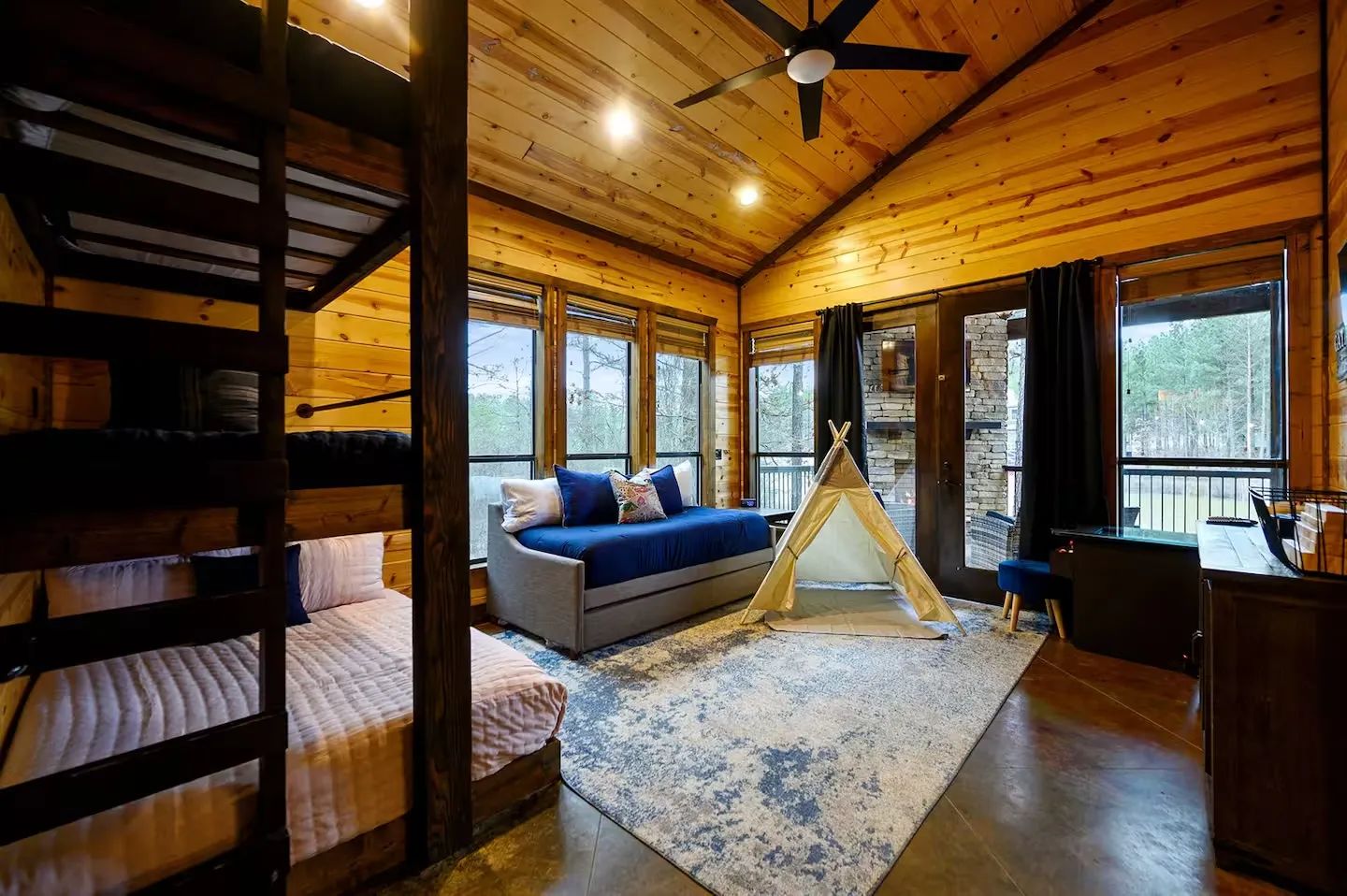 Families traveling with kids will find The Retreat at Water’s Edge especially inviting. The property includes an outdoor playset that keeps little ones entertained for hours, while adults can relax nearby, soaking in the views and fresh air. The cabin is all on one level, making it accessible and convenient for all guests. Every detail has been thoughtfully designed to ensure your comfort—from room-darkening curtains in every bedroom to high-quality linens, plush pillows, and bathroom amenities including soap, shampoo, and conditioner.