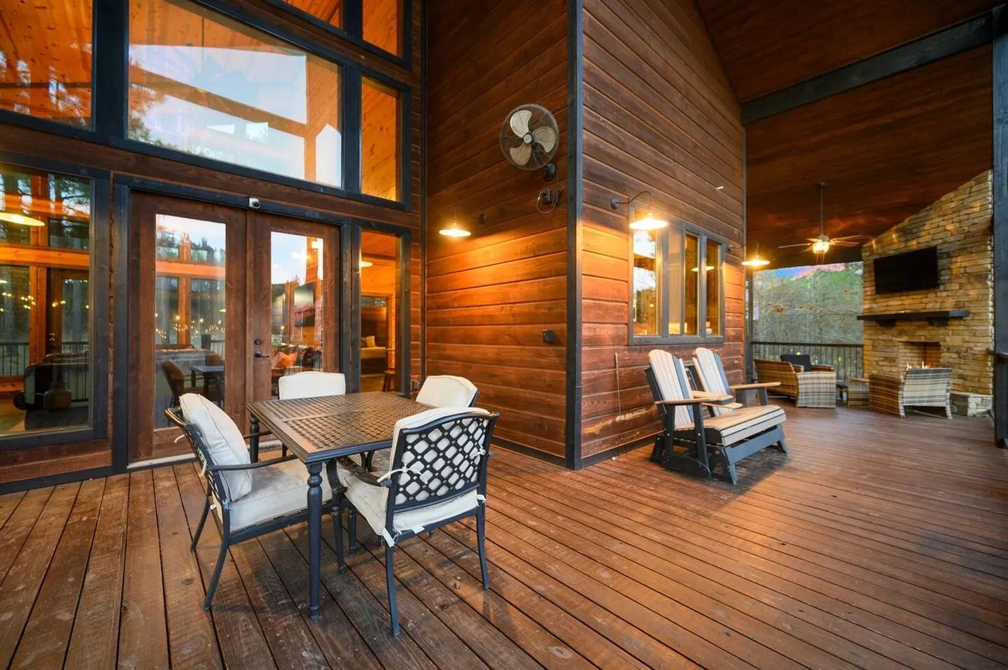 From the moment you arrive at The Retreat at Water’s Edge, you’ll feel an immediate sense of calm. The sound of the water, the scent of pine, and the cabin’s warmth create a cozy, welcoming atmosphere. Step inside to find a beautifully appointed living space with 20-foot vaulted ceilings, a stone fireplace, and floor-to-ceiling windows that capture sunrise and sunset views. Whether you’re curling up by the fire with a good book or streaming your favorite show on the SMART TV with DirecTV cable, this living area provides the perfect balance of comfort and style.