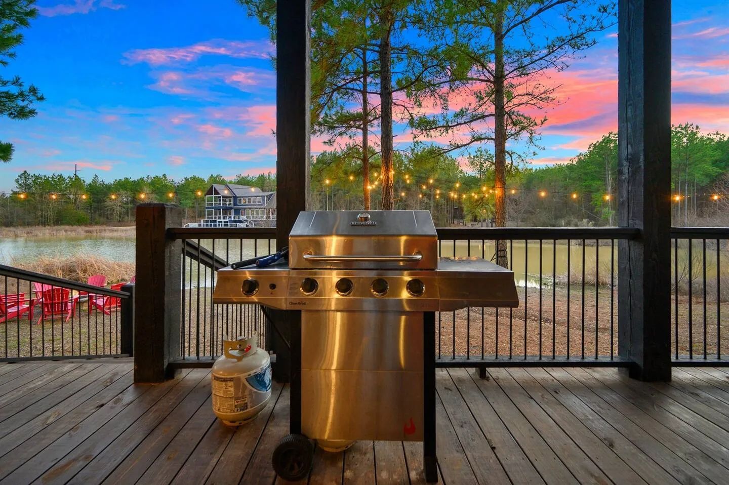 Stepping outside The Retreat at Water’s Edge, guests are greeted by an expansive deck overlooking the calm waters of the pond. This outdoor haven is designed for fun, relaxation, and connection. Sip your morning coffee on the outdoor sofa, grill up your favorite meals, or unwind in the bubbling hot tub as the sun sets. As night falls, gather around the firepit under a canopy of string lights for starlit conversations and toasted marshmallows. Guests can also enjoy complimentary use of the two kayaks provided—perfect for exploring the peaceful pond or casting a line to catch dinner.