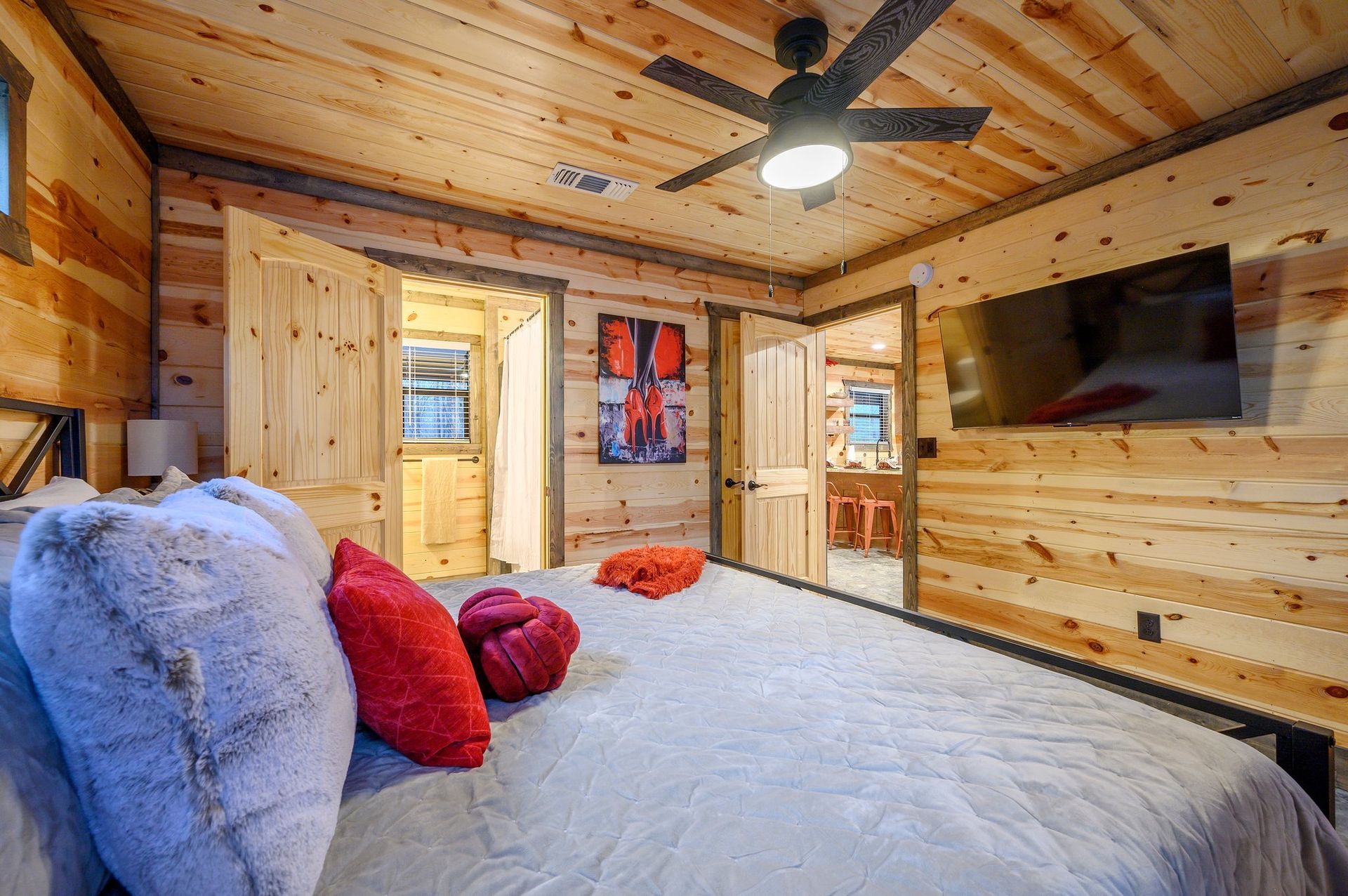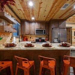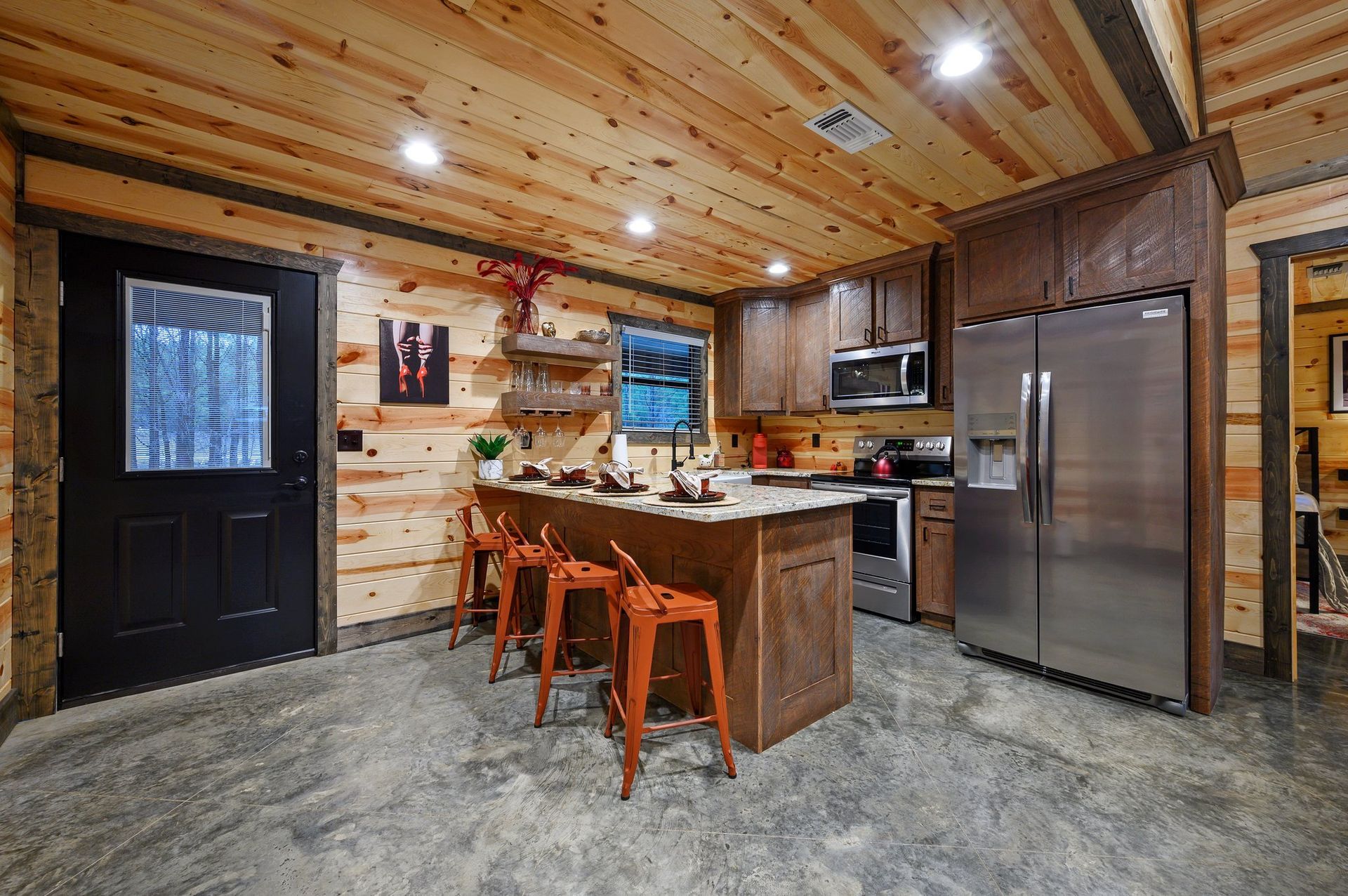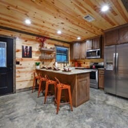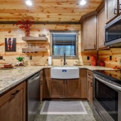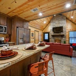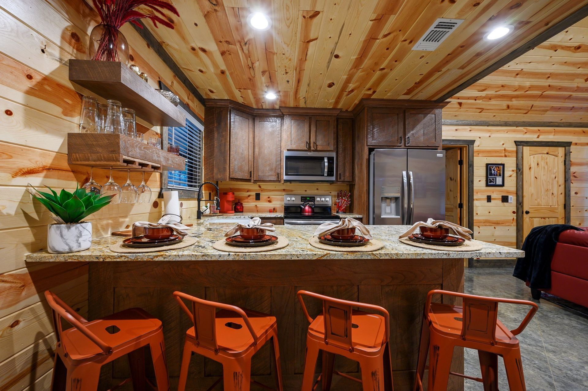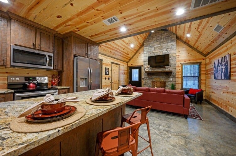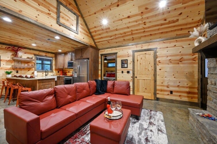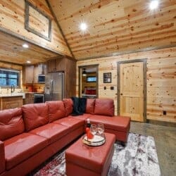 The Ruby Red cabin’s living room is designed for your comfort, with a leather sectional, cozy throw blankets, and a gas fireplace. A big-screen HDTV is provided for your entertainment. The kitchen and dining area are well furnished with a spacious island that can accommodate up to four people. The kitchen has various essential appliances, including a Keurig K-Cup, a hot water kettle, a toaster, a blender, and a waffle maker. Additionally, it has all the necessary dinnerware, pots, and pans to cater to your needs.
