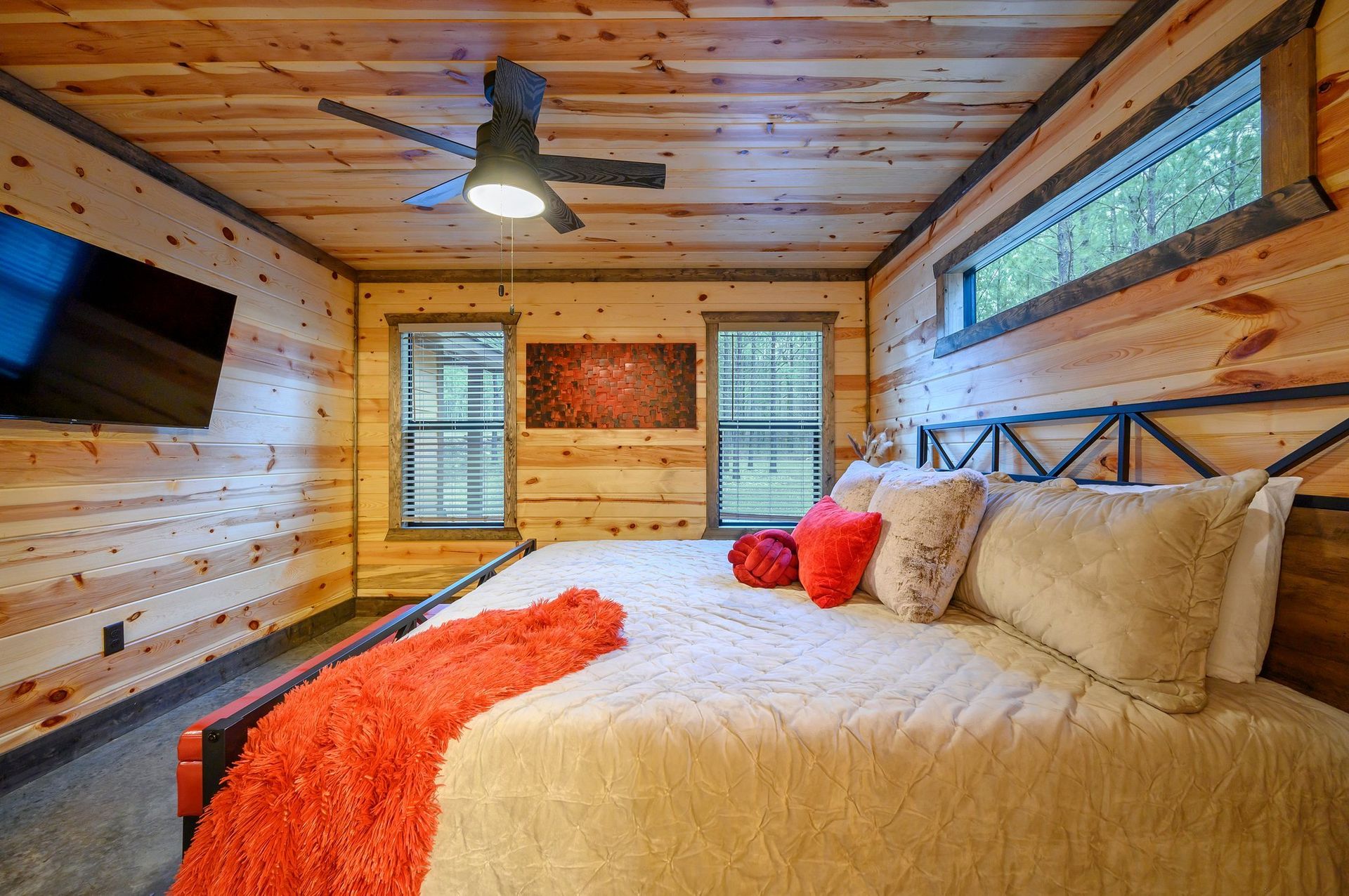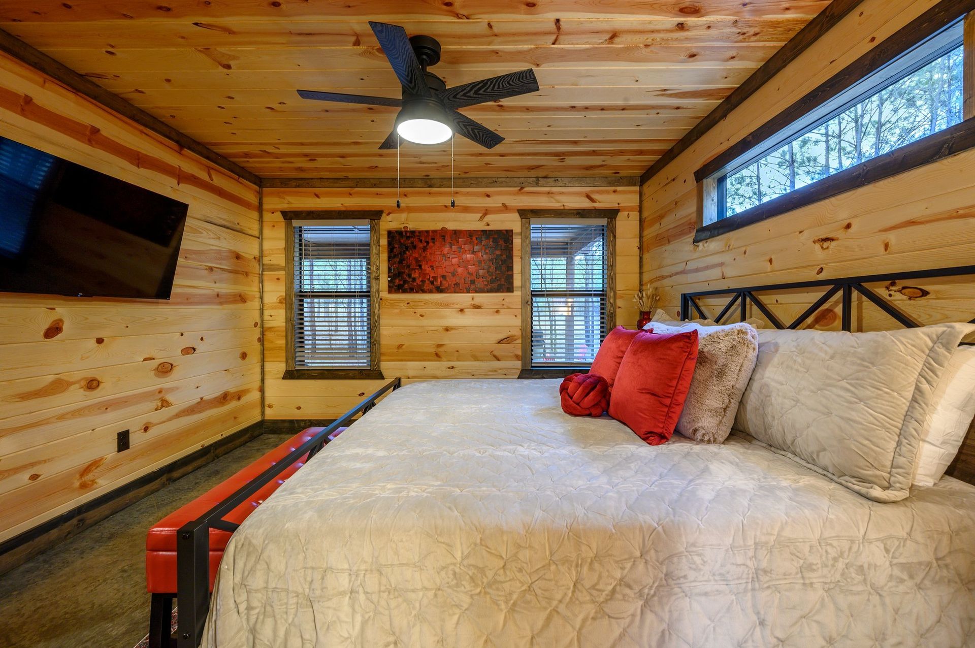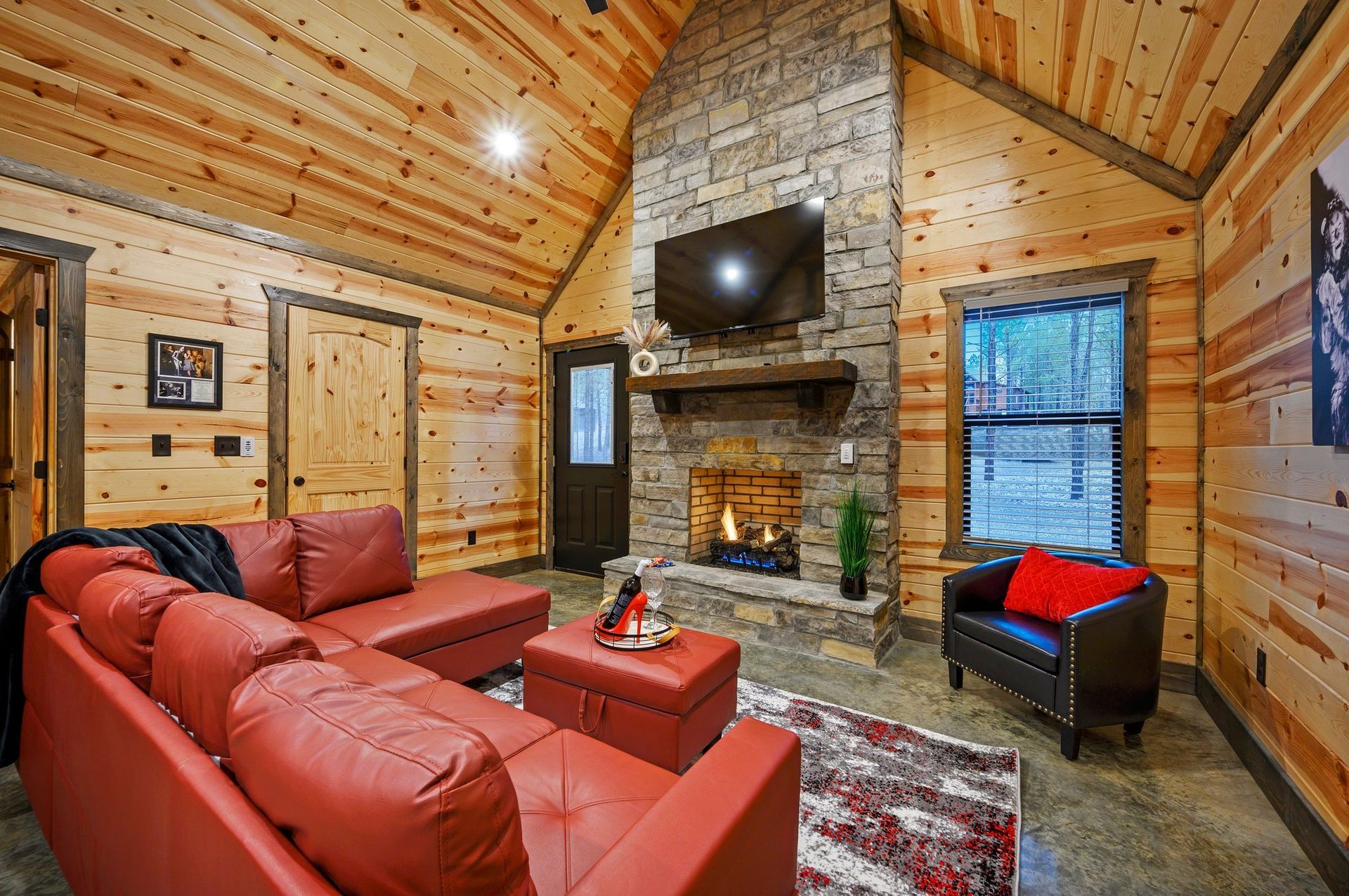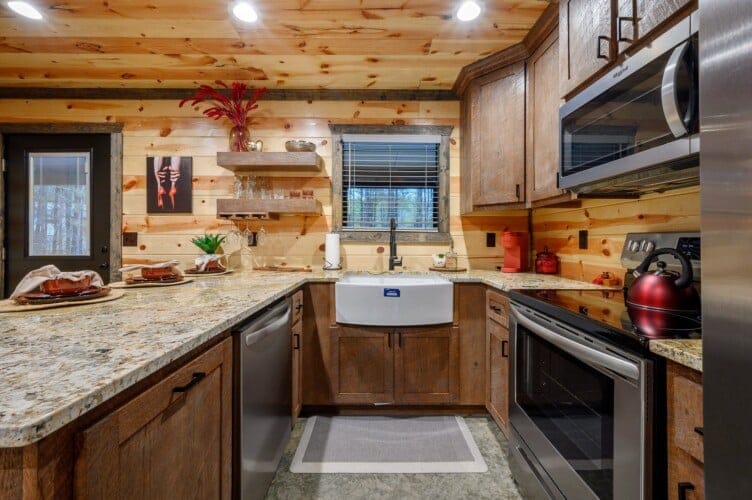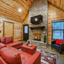 The Ruby Red cabin’s living room is designed for your comfort, with a leather sectional, cozy throw blankets, and a gas fireplace. A big-screen HDTV is provided for your entertainment. The kitchen and dining area are well furnished with a spacious island that can accommodate up to four people. The kitchen has various essential appliances, including a Keurig K-Cup, a hot water kettle, a toaster, a blender, and a waffle maker. Additionally, it has all the necessary dinnerware, pots, and pans to cater to your needs.