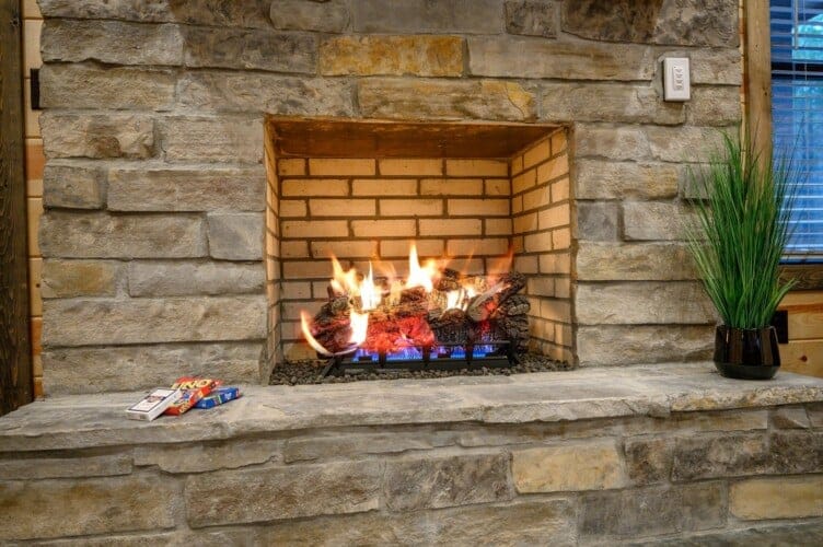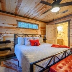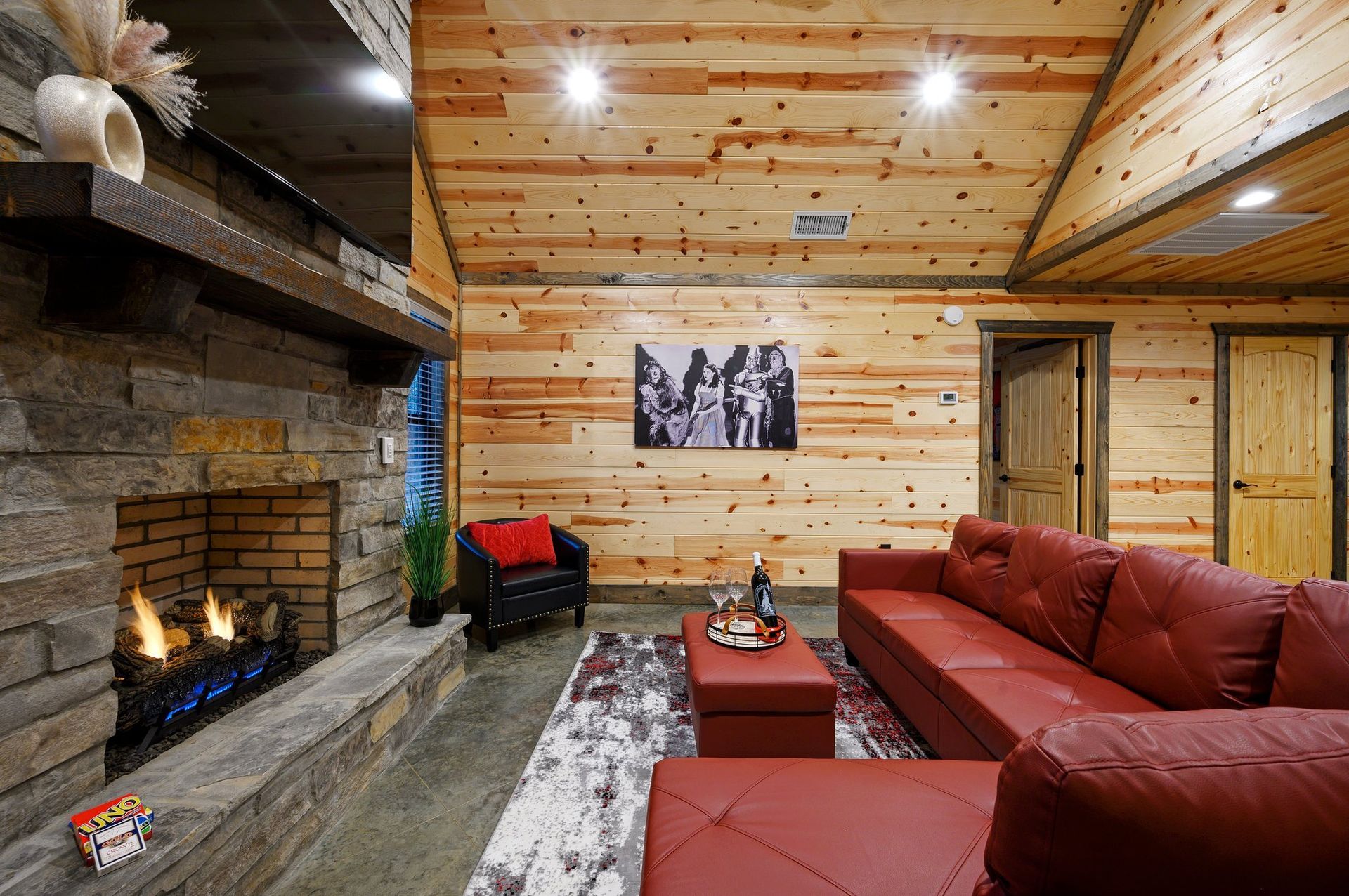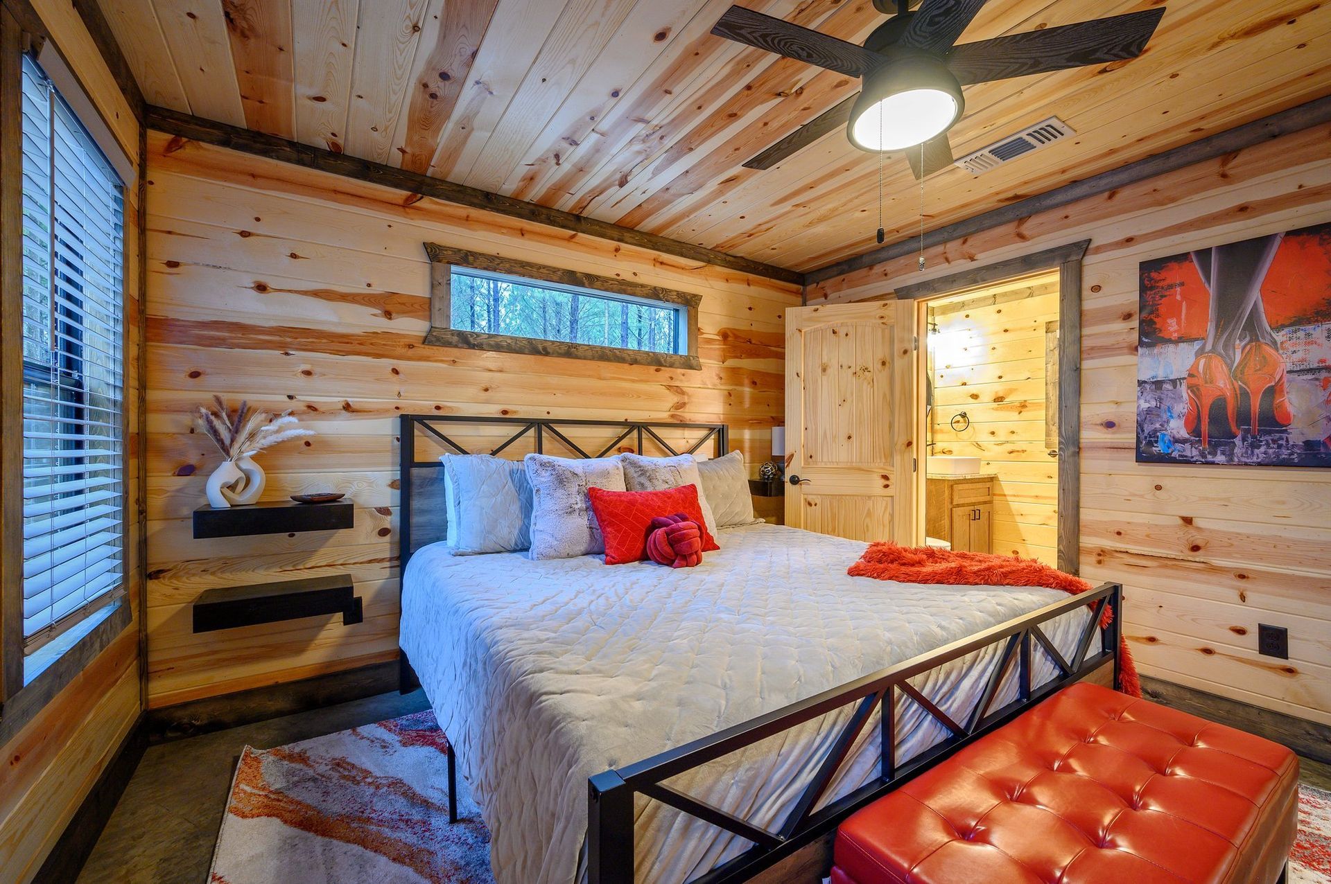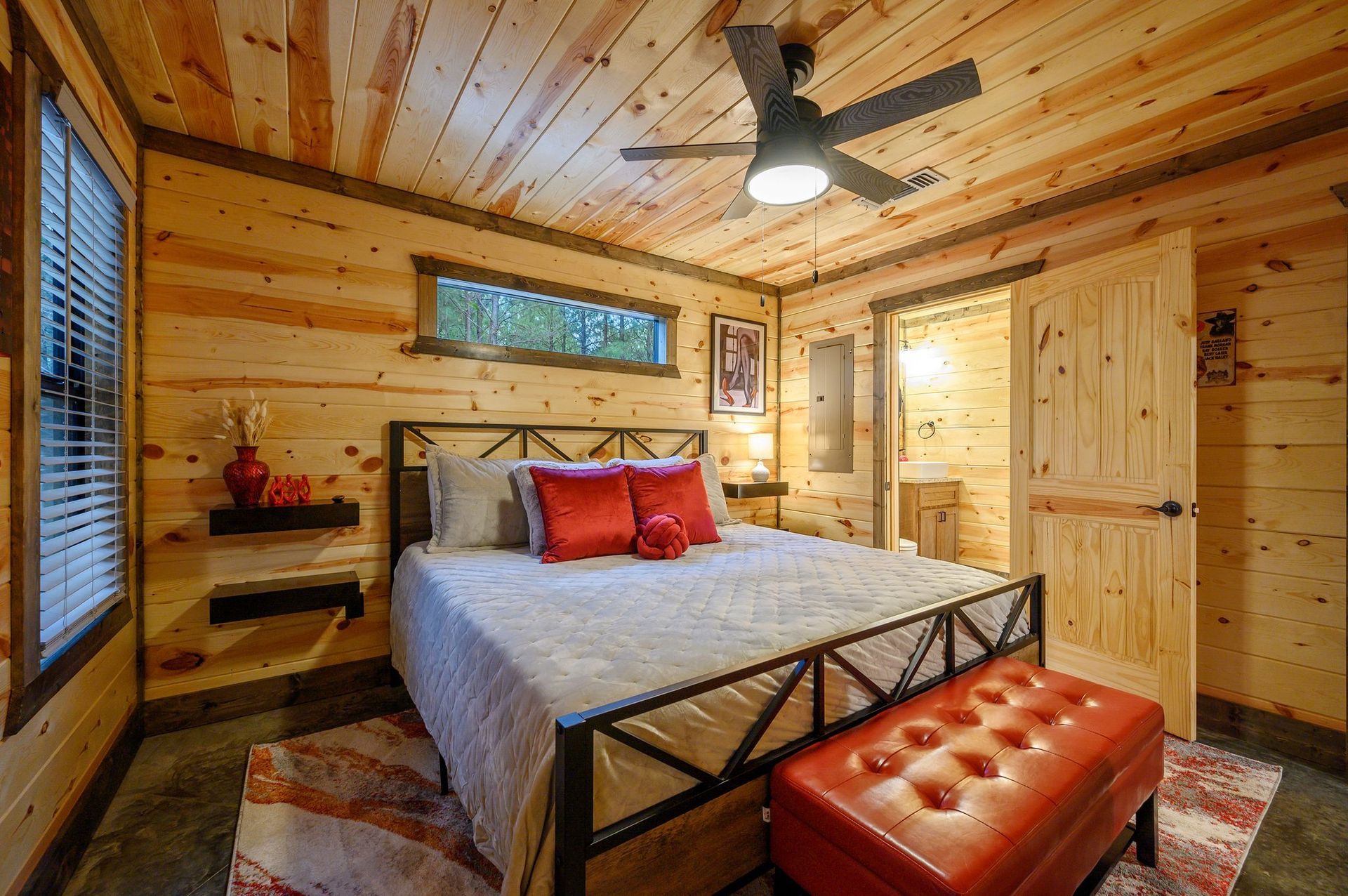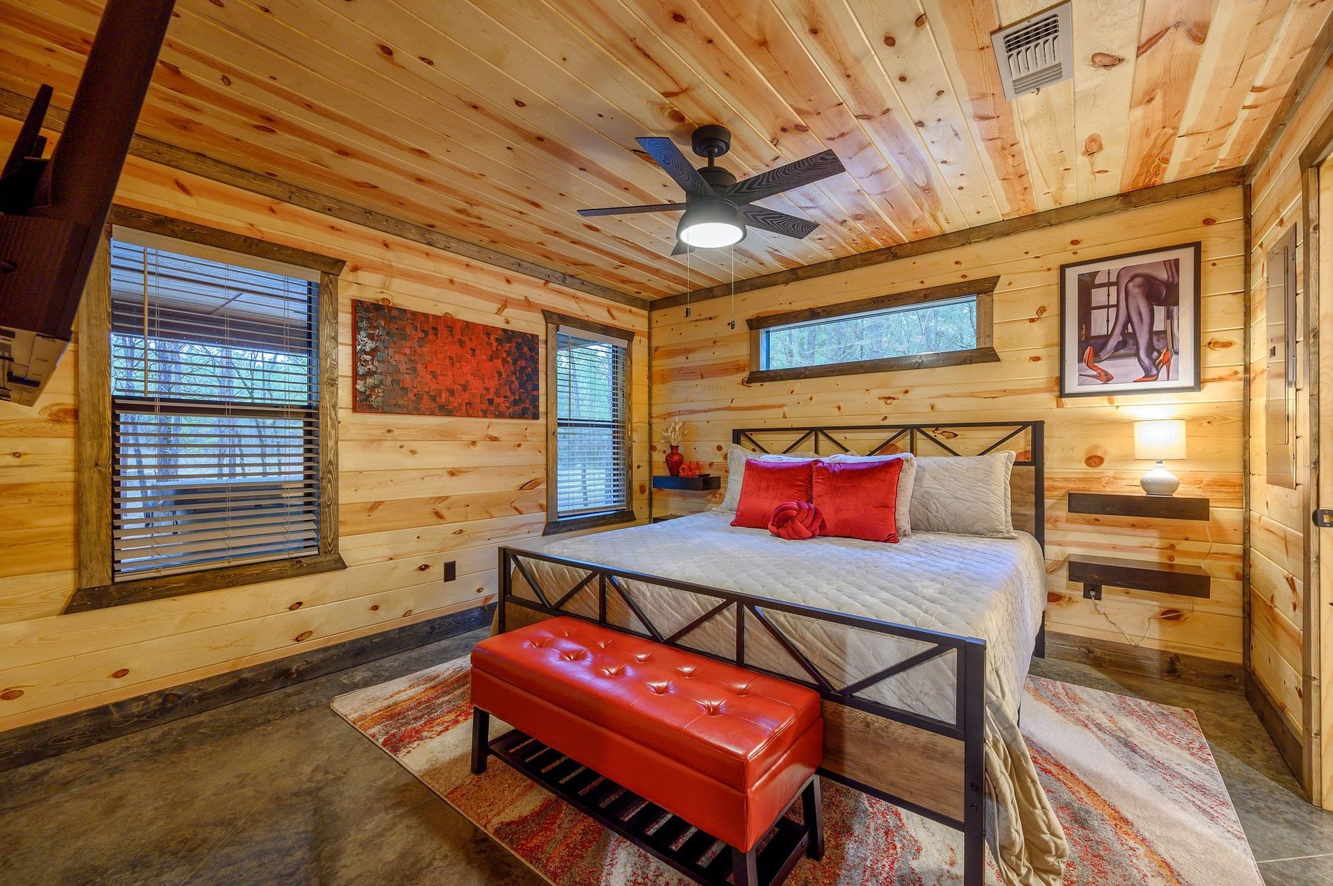 The Ruby Red cabin’s living room is designed for your comfort, with a leather sectional, cozy throw blankets, and a gas fireplace. A big-screen HDTV is provided for your entertainment. The kitchen and dining area are well furnished with a spacious island that can accommodate up to four people. The kitchen has various essential appliances, including a Keurig K-Cup, a hot water kettle, a toaster, a blender, and a waffle maker. Additionally, it has all the necessary dinnerware, pots, and pans to cater to your needs.