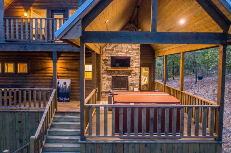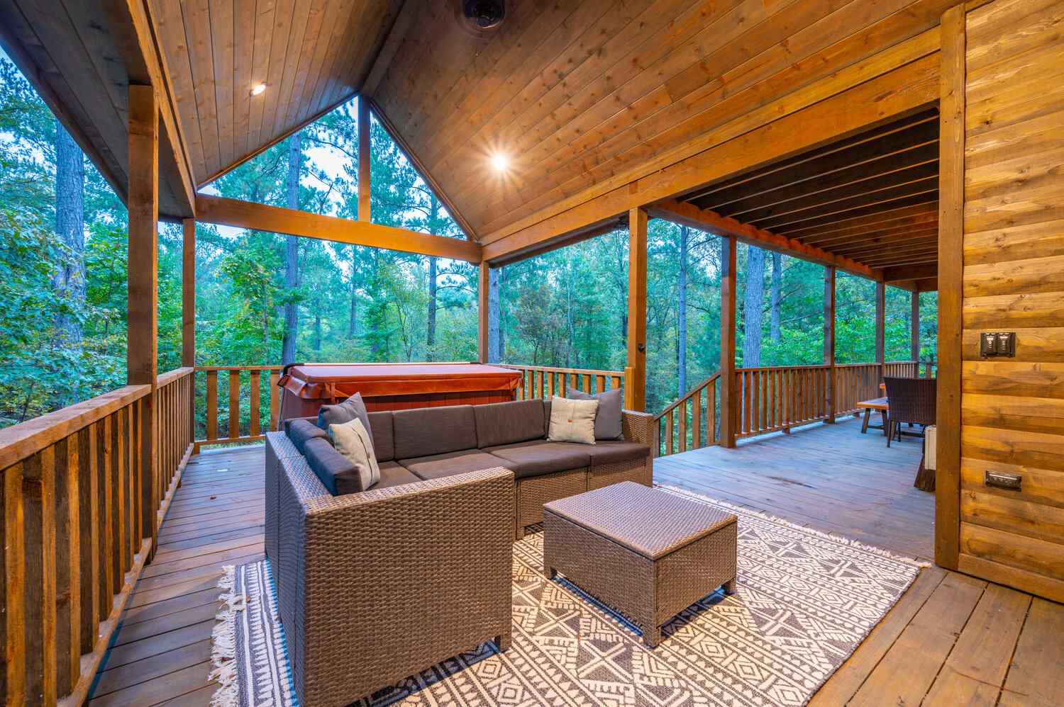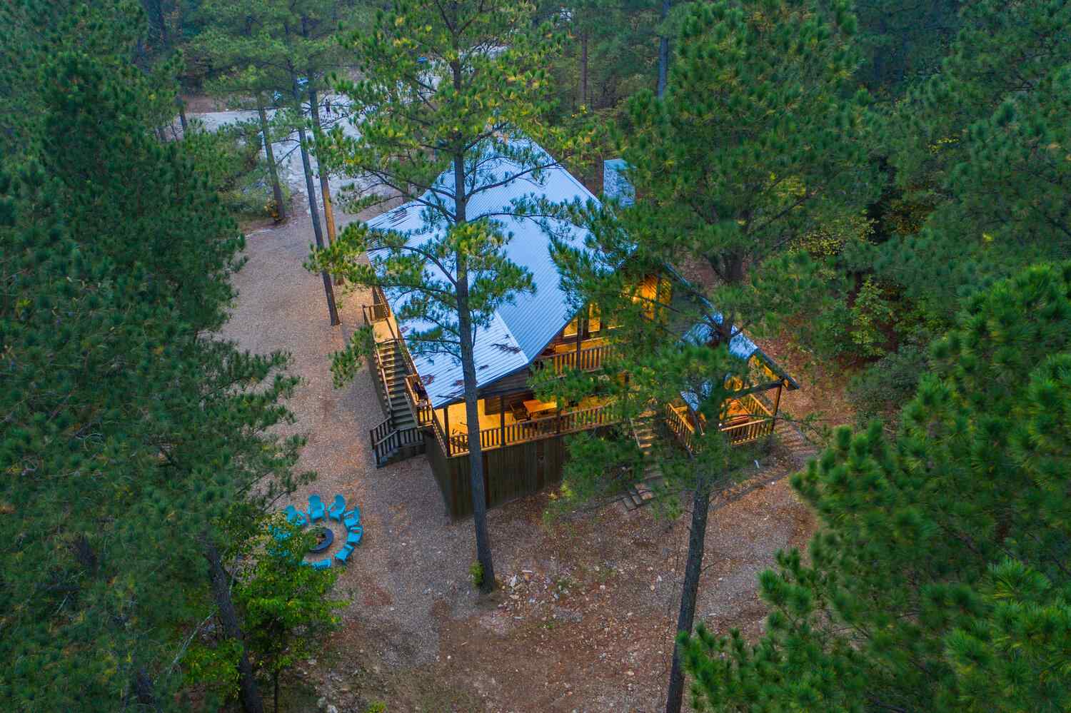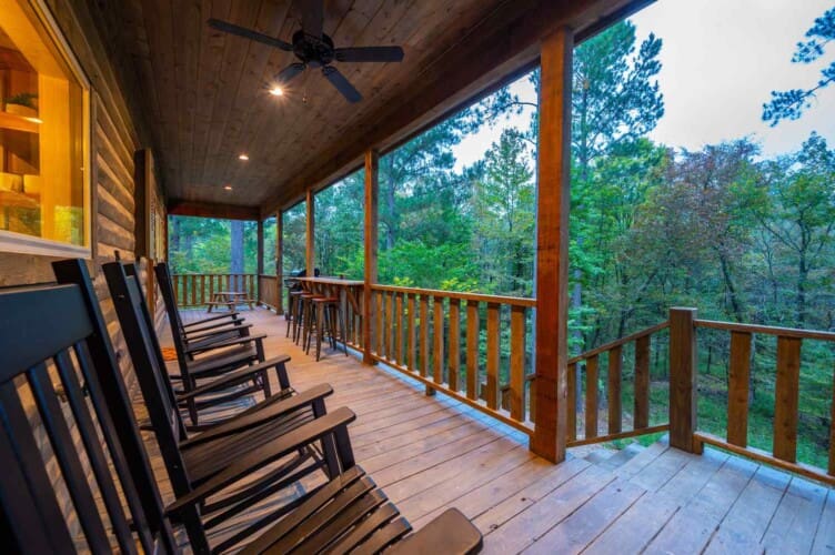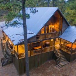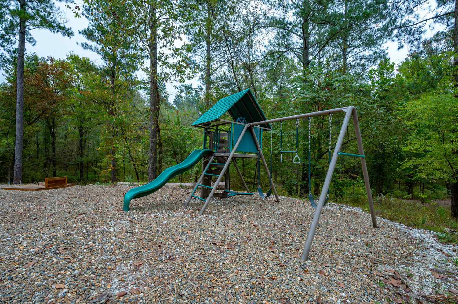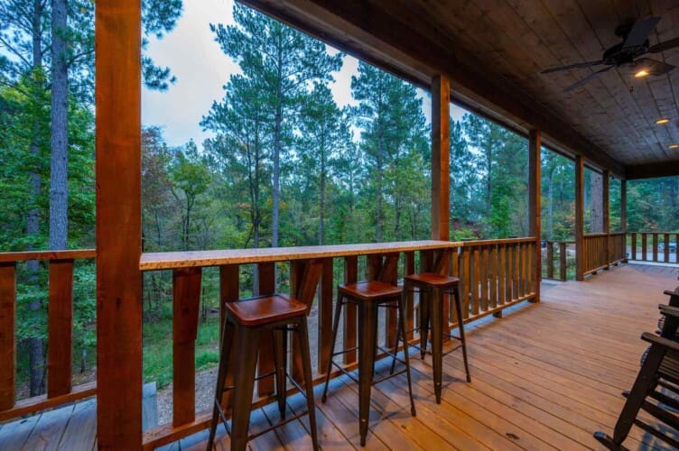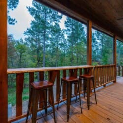 Downstairs, the cabin boasts a fantastic porch that wraps around 3/4 of the dwelling, framing a cozy place to sit in front of an outdoor fireplace. There’s a bar top for entertaining guests, an outdoor dining table, and a covered hot tub for lazy afternoons. Near the creek’s edge are a stone fire pit and a play structure for the children to explore and enjoy. Nature has truly blessed this stunning corner of Broken Bow.