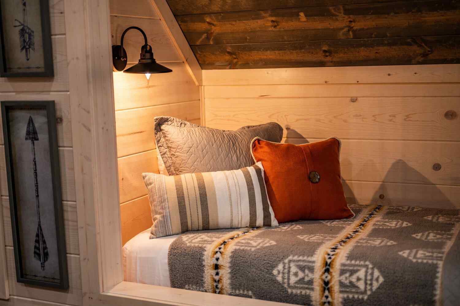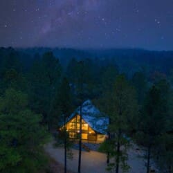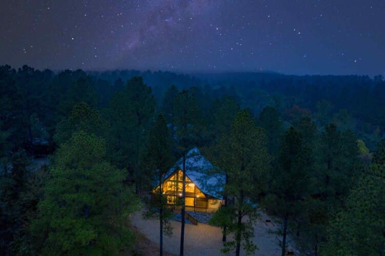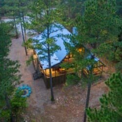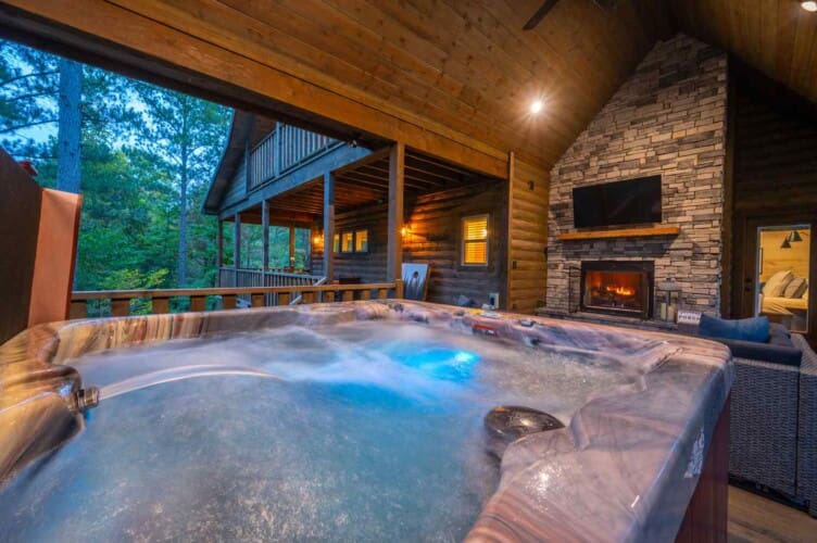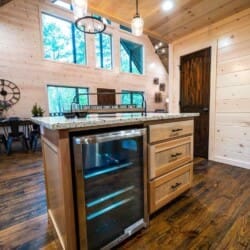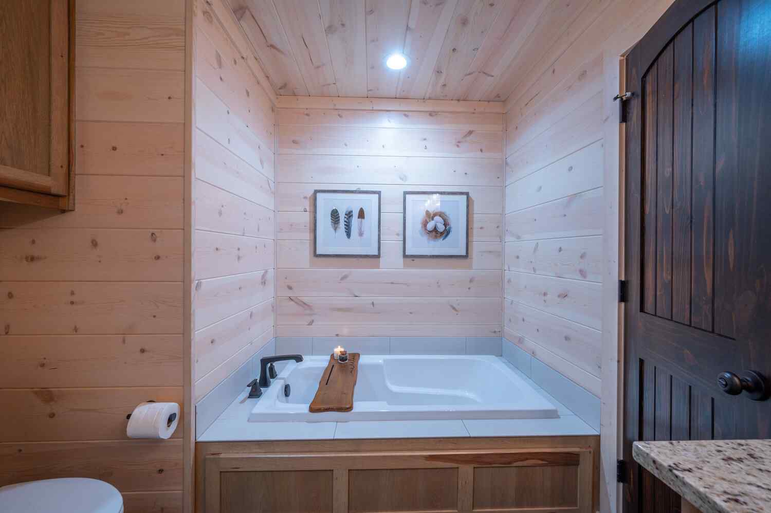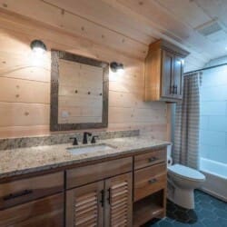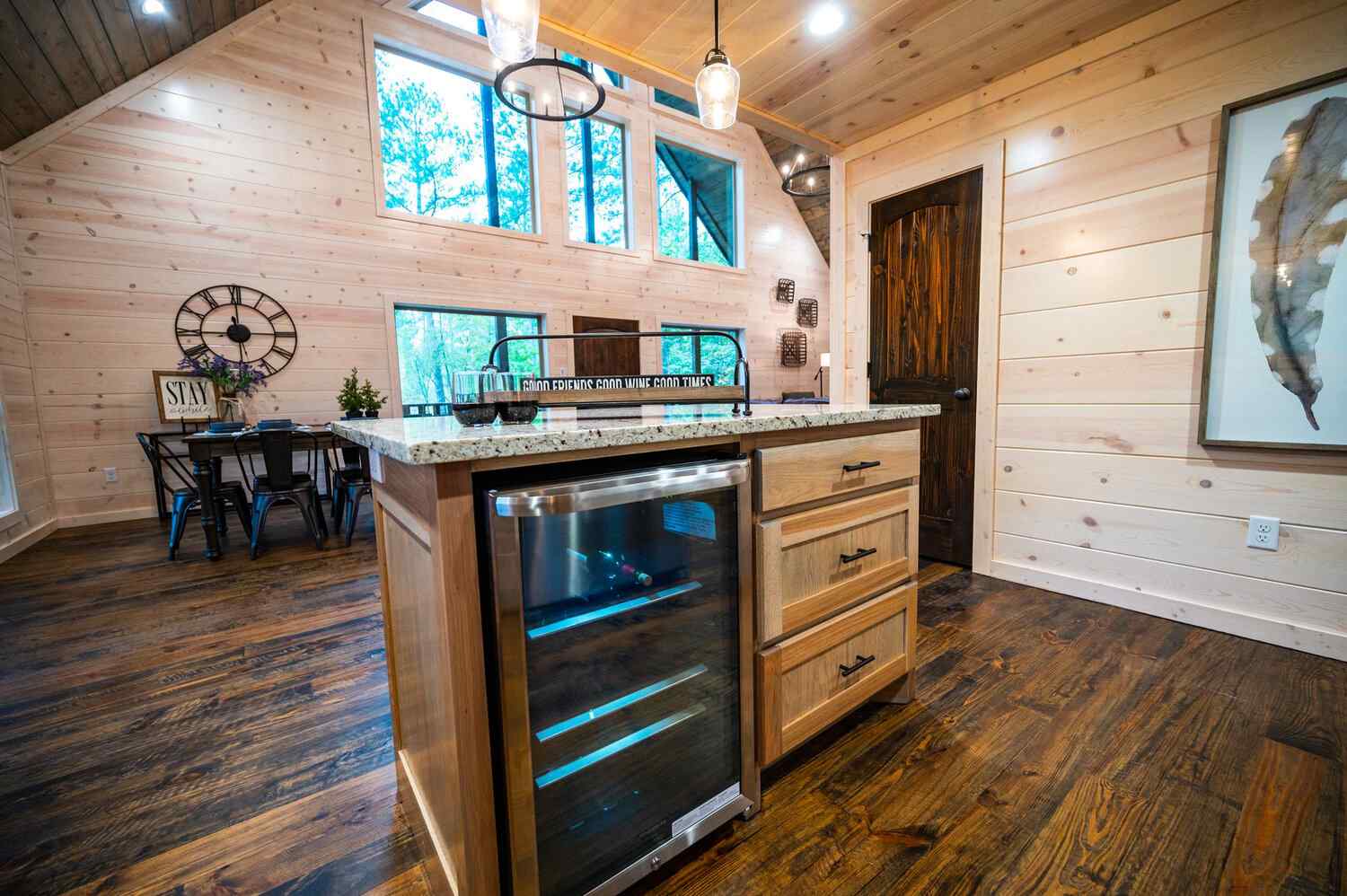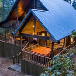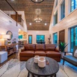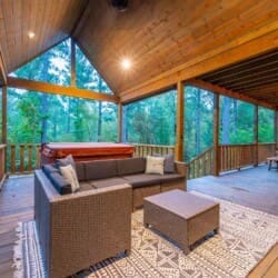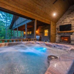 Downstairs, the cabin boasts a fantastic porch that wraps around 3/4 of the dwelling, framing a cozy place to sit in front of an outdoor fireplace. There’s a bar top for entertaining guests, an outdoor dining table, and a covered hot tub for lazy afternoons. Near the creek’s edge are a stone fire pit and a play structure for the children to explore and enjoy. Nature has truly blessed this stunning corner of Broken Bow.