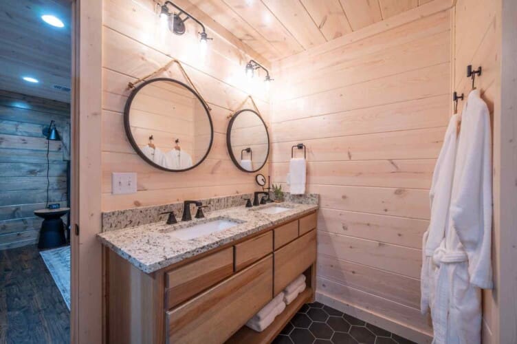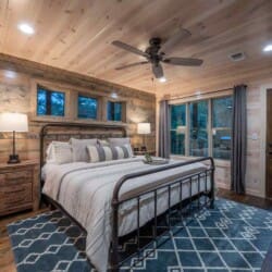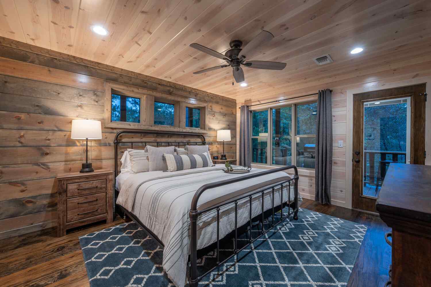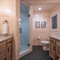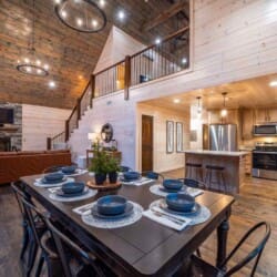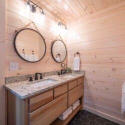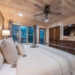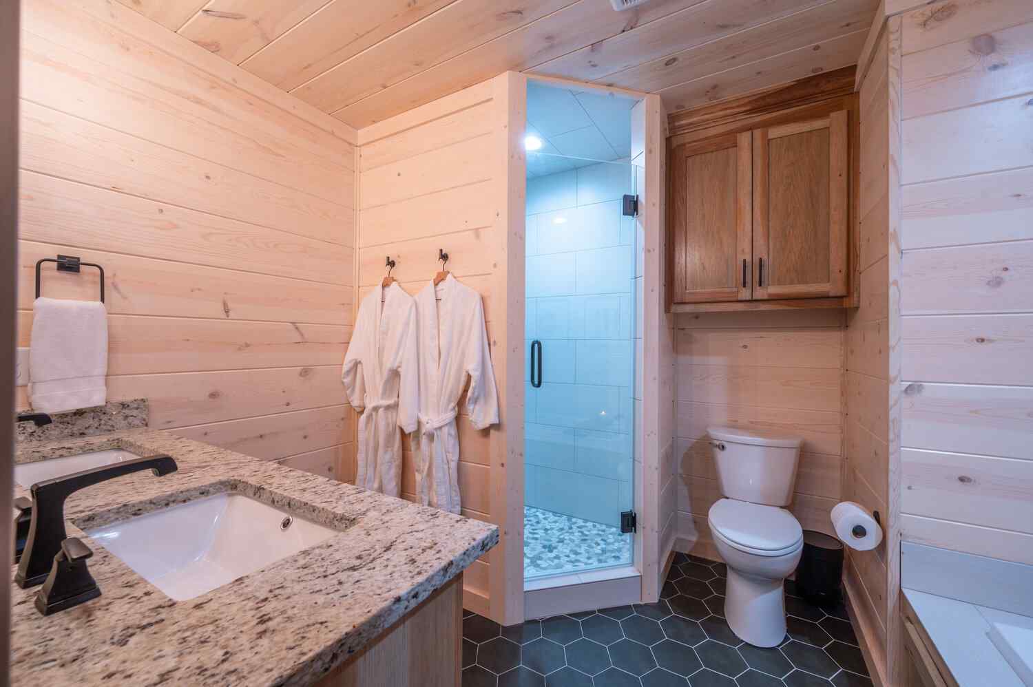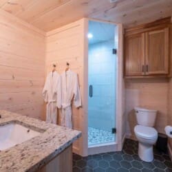As you step through the door, your gaze is drawn to the walls of windows flooding the interior with natural light, giving glimpses into the stunning scenery outside. The open-plan living area, with its stone fireplace and comfortable seating, brings everyone together to share stories and laughter. Also, the kitchen is perfect for cooking up culinary delights and a wine fridge to keep all your favorite wines chilled. The ground floor offers you two king suites with private doors that lead out to the porch. Each bedroom features a luxurious double vanity bathroom and a spacious walk-in shower – perfect for unwinding after a long day of adventure. For those wanting to relax further, each bedroom also has 55-inch smart TVs – ideal for catching up on your favorite shows and movies after dark.