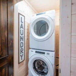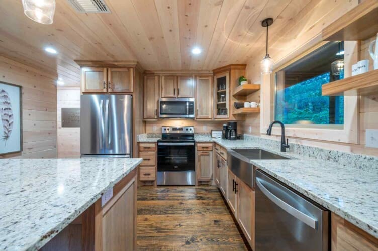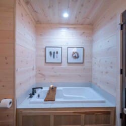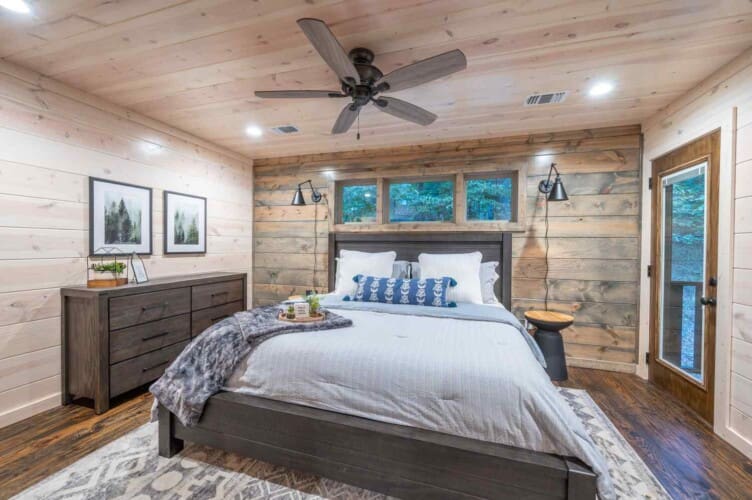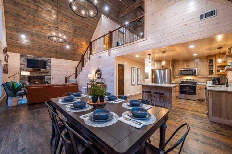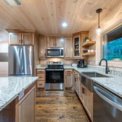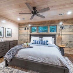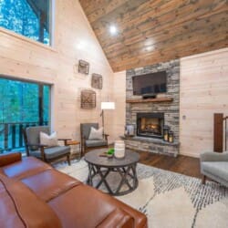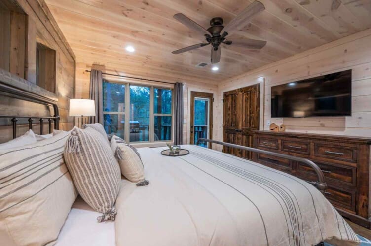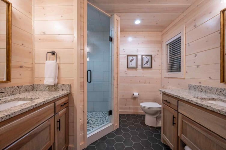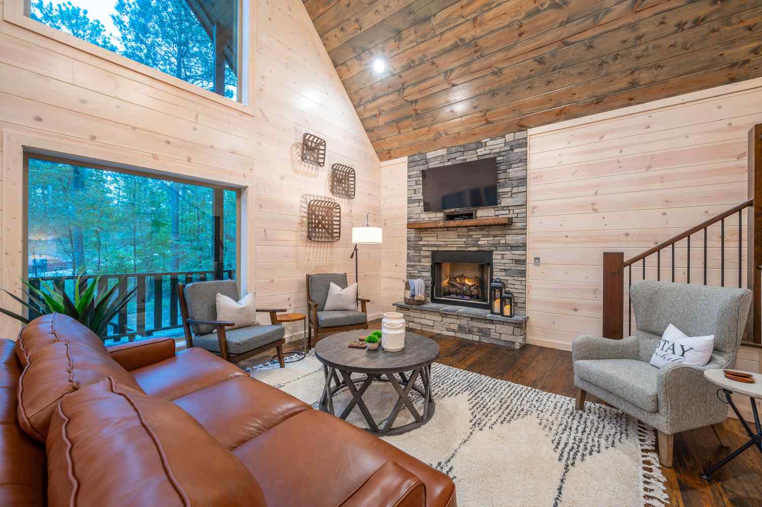 As you step through the door, your gaze is drawn to the walls of windows flooding the interior with natural light, giving glimpses into the stunning scenery outside. The open-plan living area, with its stone fireplace and comfortable seating, brings everyone together to share stories and laughter. Also, the kitchen is perfect for cooking up culinary delights and a wine fridge to keep all your favorite wines chilled. The ground floor offers you two king suites with private doors that lead out to the porch. Each bedroom features a luxurious double vanity bathroom and a spacious walk-in shower – perfect for unwinding after a long day of adventure. For those wanting to relax further, each bedroom also has 55-inch smart TVs – ideal for catching up on your favorite shows and movies after dark.
