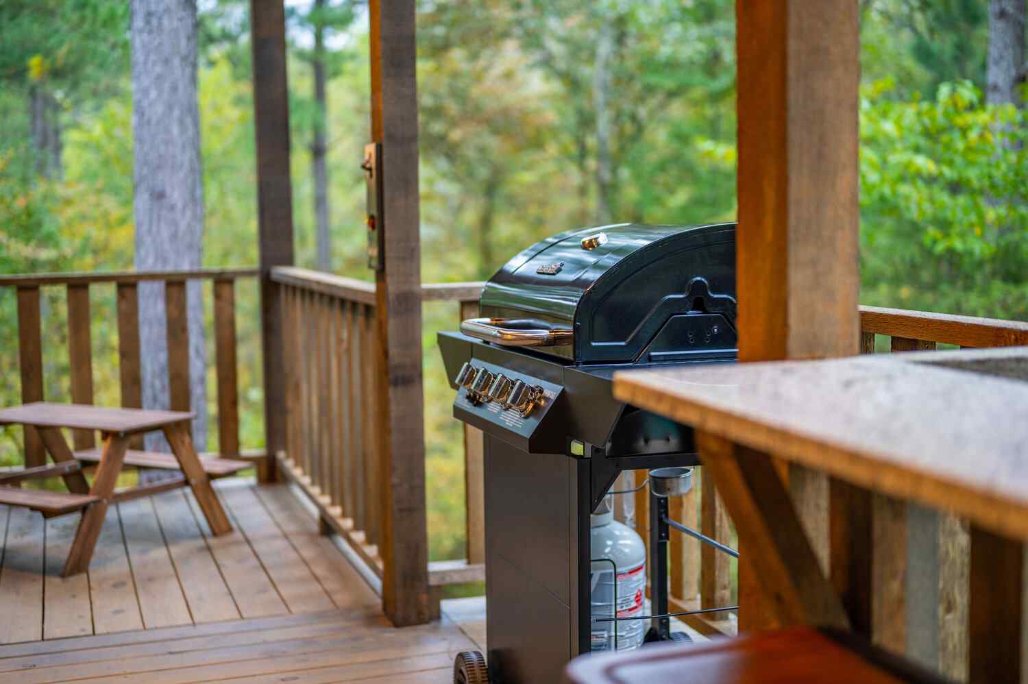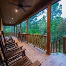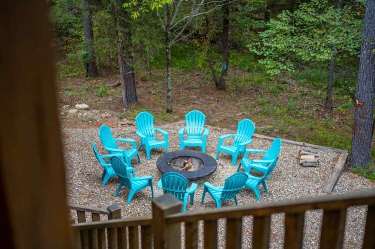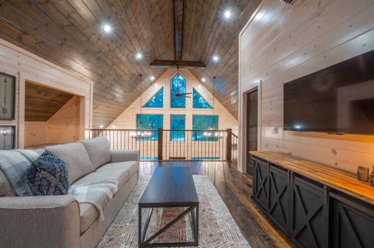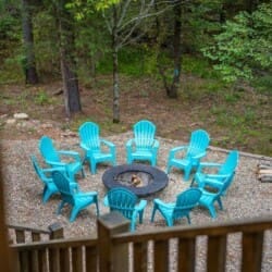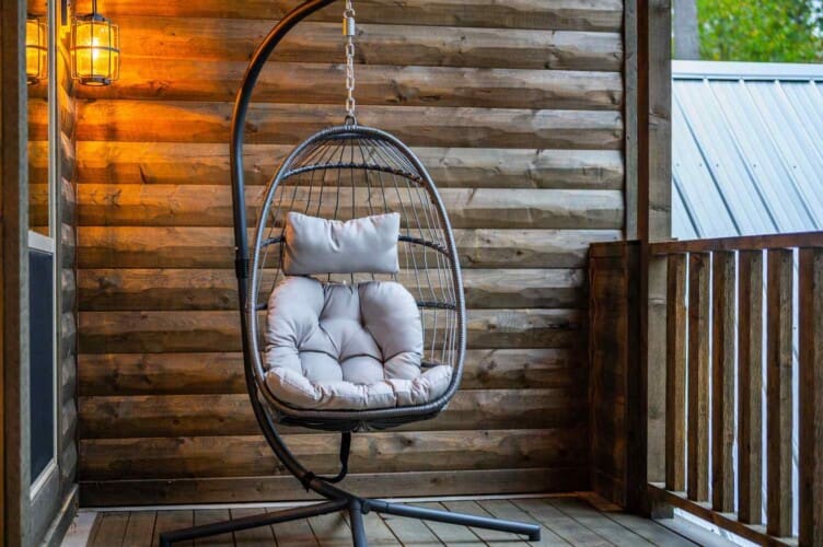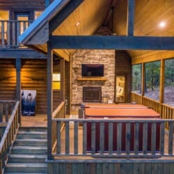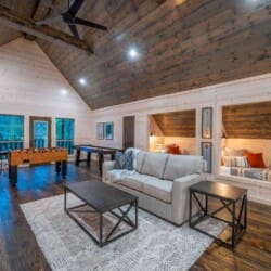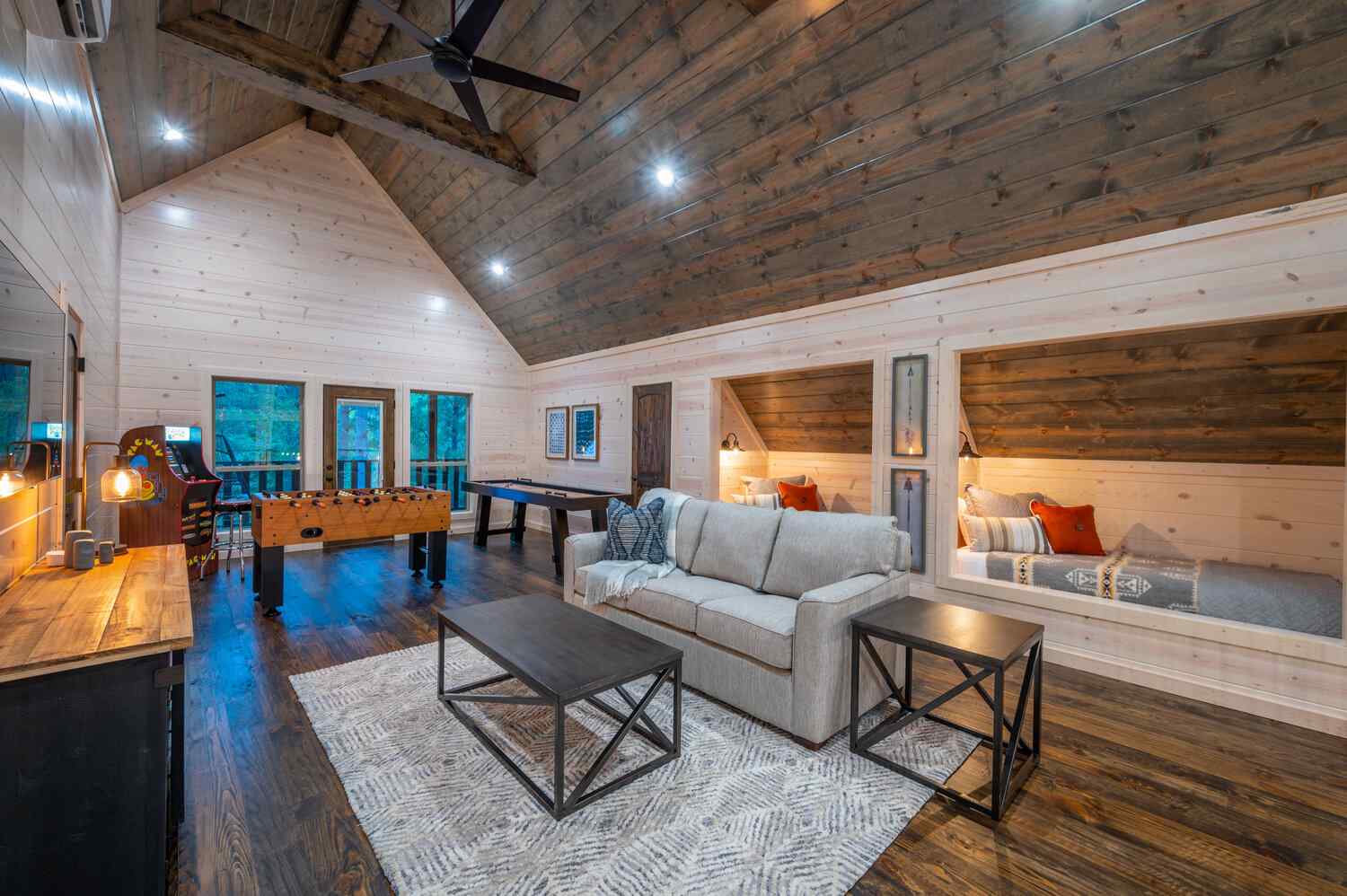 Upstairs, a sleeping loft/game room awaits – equipped with its full bathroom, bathtub/shower combo, and a PacMan game console, shuffleboard, and foosball. The property also provides outdoor games such as yard Yahtzee, corn-hole, and horseshoes for entertainment. Step into the game room and find your way to the upstairs deck, where you can bask in the tranquility of nature and let your worries drift away. Enjoy your favorite beverage in an egg chair as you take in the stunning panorama under the bright blue sky. It’s the perfect spot to sit back with a good book and relax.