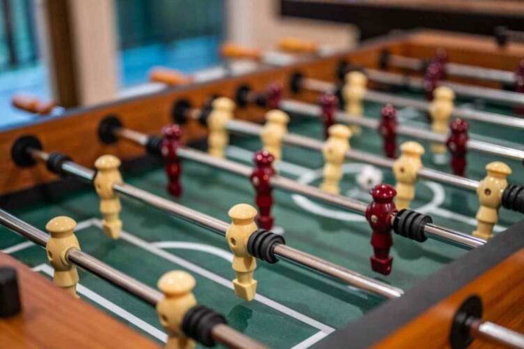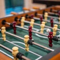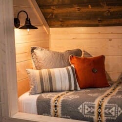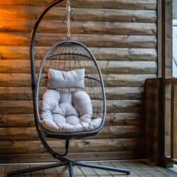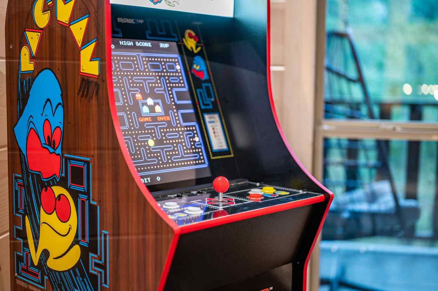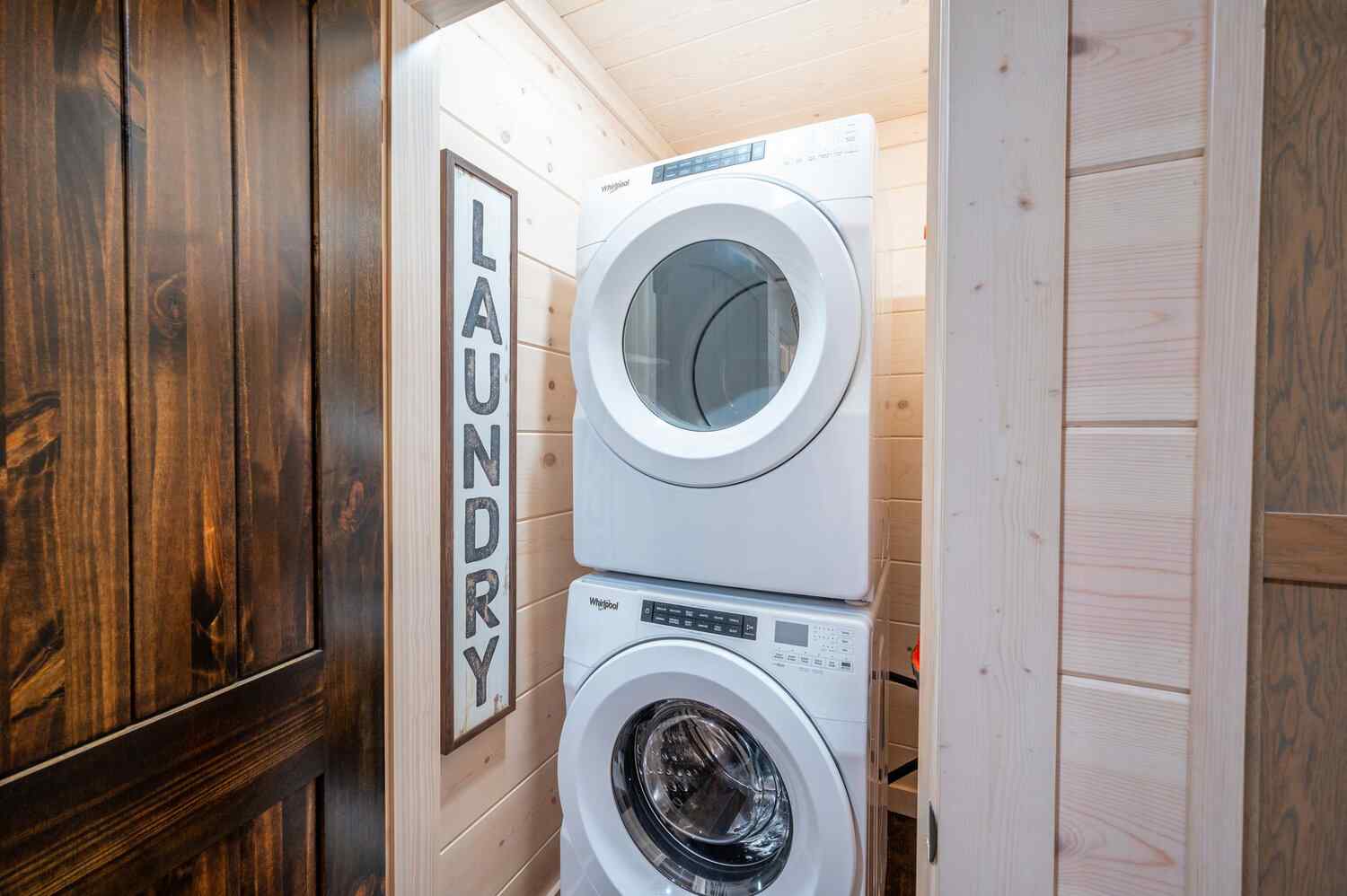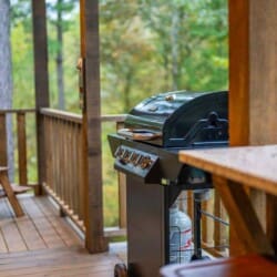 Upstairs, a sleeping loft/game room awaits – equipped with its full bathroom, bathtub/shower combo, and a PacMan game console, shuffleboard, and foosball. The property also provides outdoor games such as yard Yahtzee, corn-hole, and horseshoes for entertainment. Step into the game room and find your way to the upstairs deck, where you can bask in the tranquility of nature and let your worries drift away. Enjoy your favorite beverage in an egg chair as you take in the stunning panorama under the bright blue sky. It’s the perfect spot to sit back with a good book and relax.