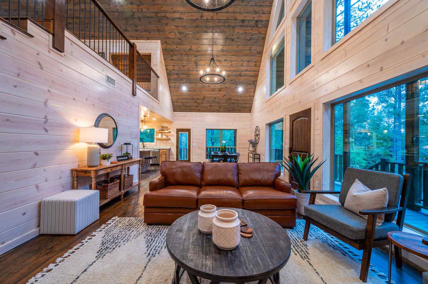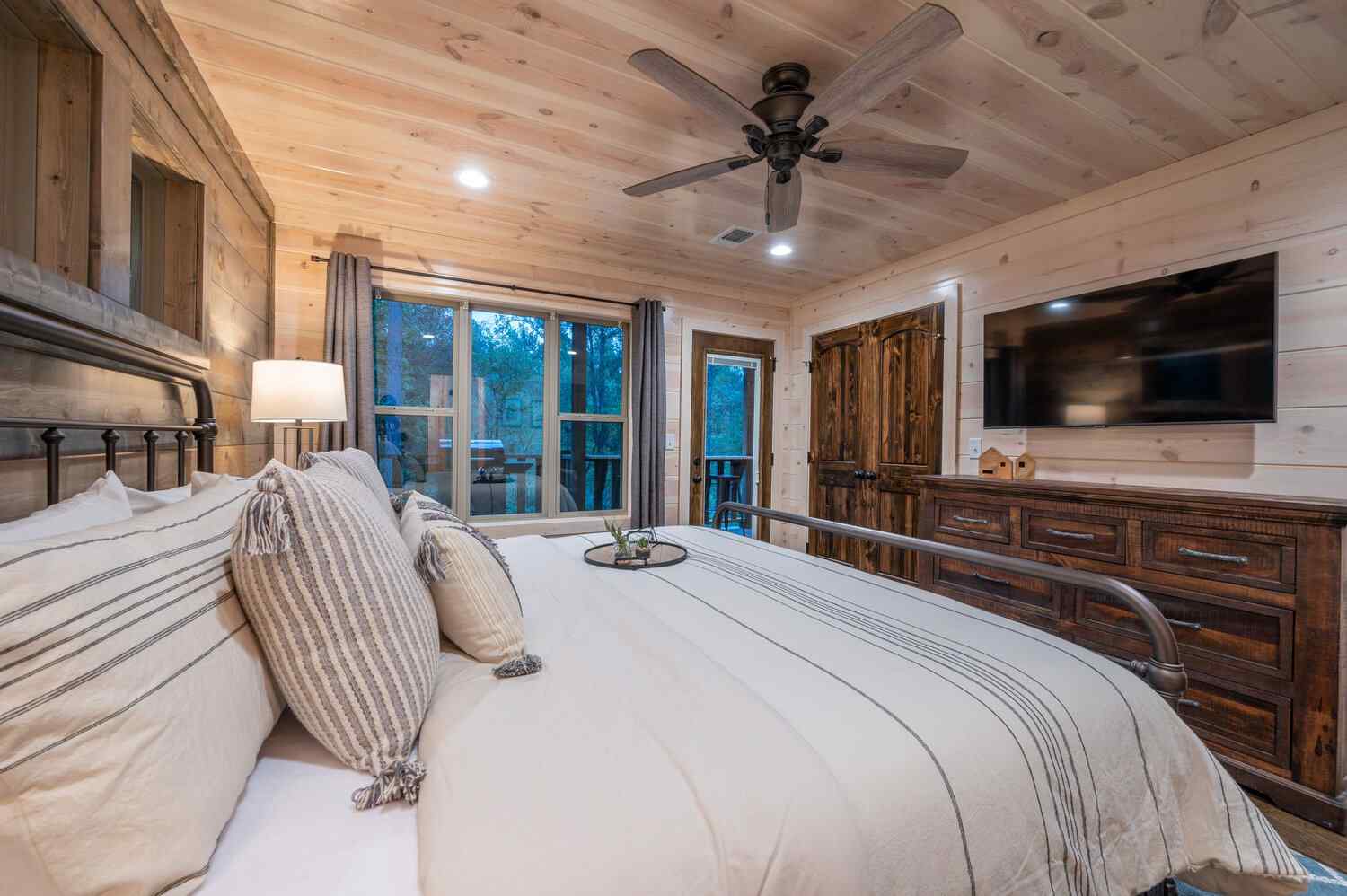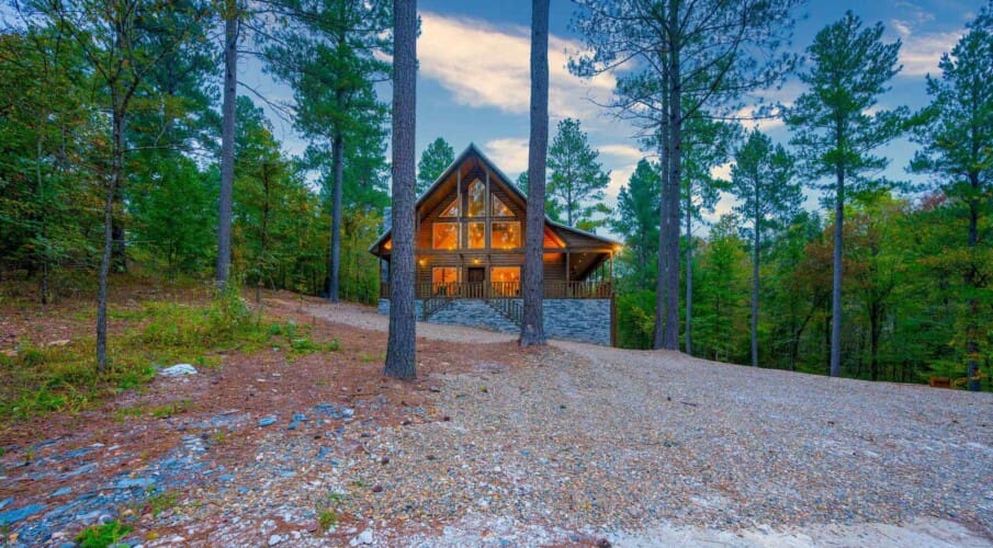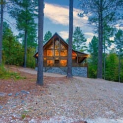 Escape to the serenity of nature as you stay in this brand-new three-bedroom luxury cabin located within Eagle Mountain West in Hochatown, Oklahoma. This stunning hideaway is situated in a beautiful cul-de-sac, with a seasonal creek running right across the front and a tree-lined hill providing an enchanting backdrop.