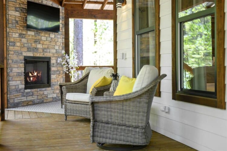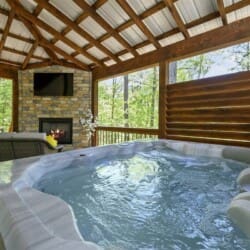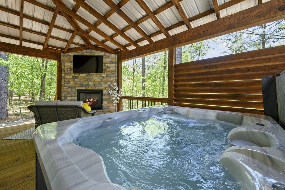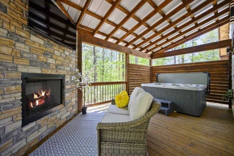 For added convenience, the living room includes an air mattress that can accommodate up to two additional guests, making Shady Pines suitable for a small family or close friends. The cabin’s thoughtful amenities extend to the outdoor space, where a private hot tub awaits, surrounded by a privacy wall to ensure complete seclusion. Cozy up to the outdoor fireplace on cool evenings or gather around the fire pit for a classic s’mores night under the stars.
