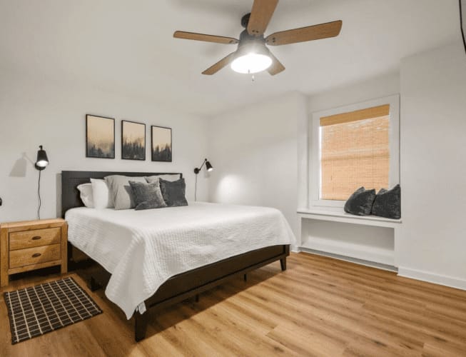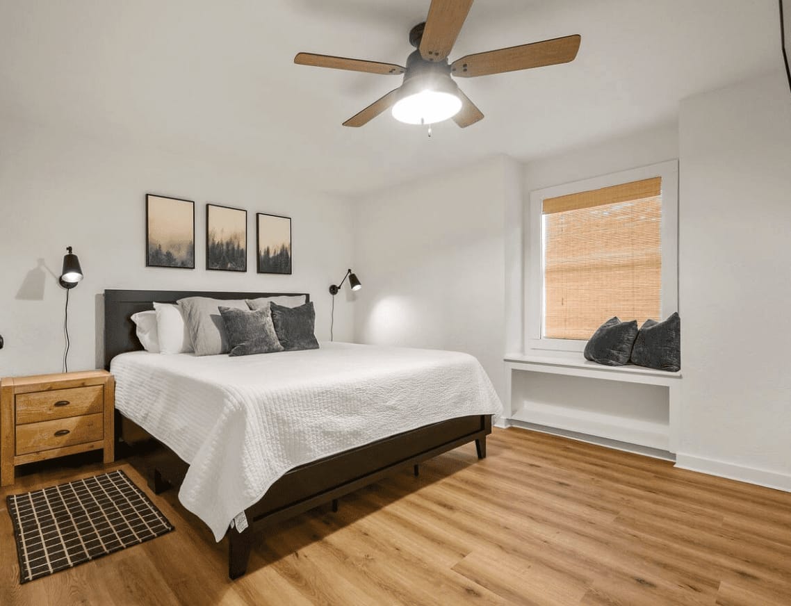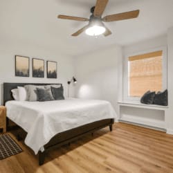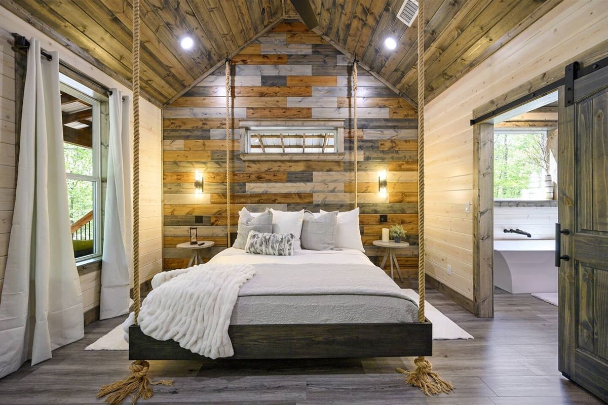The master bedroom is a true haven of comfort, featuring a luxurious king bed with unique rope accents and plenty of natural light that fills the room. The en-suite bathroom is designed to provide a spa-like experience with its soaker tub, double vanity, and a spectacular shower that boasts a wall shower, rain head, and body sprayer. This bathroom is the perfect place to relax or end your day.