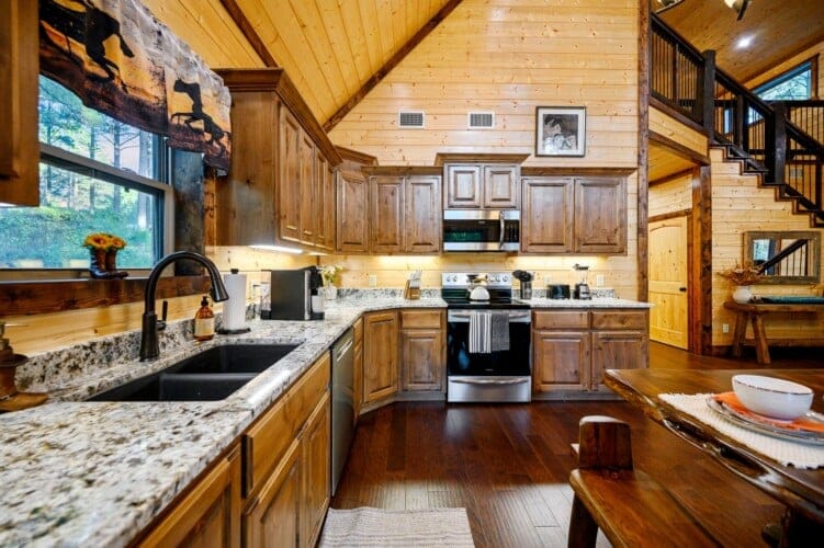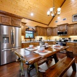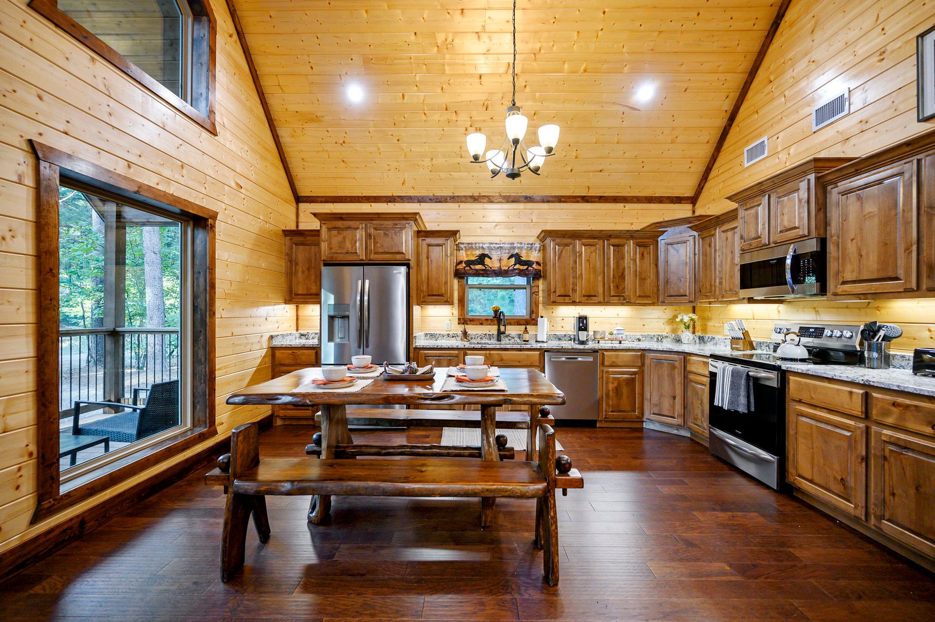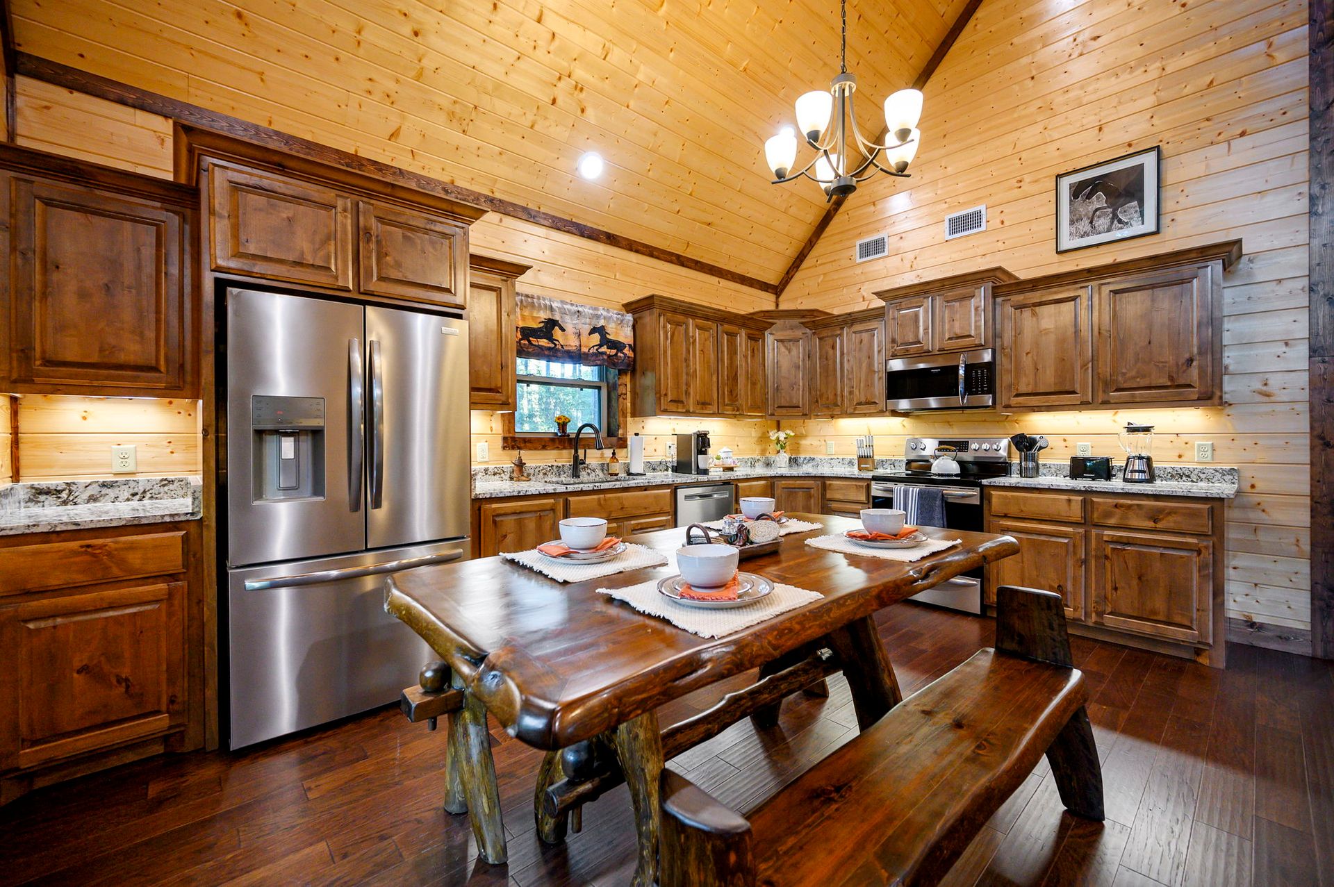 The kitchen at Silverado is fully equipped for everything from morning coffee to hearty cowboy breakfasts. Guests will find modern stainless-steel appliances, granite countertops, and all the cookware, bakeware, and utensils needed for home-style meals. The adjacent dining table, with seating for six, serves as a warm and intimate space to share laughter and stories over dinner. The charm of the Western theme extends even here, with rustic touches that make every meal feel special. Whether you’re cooking up a family feast or ordering takeout from one of Hochatown’s nearby eateries, the kitchen is designed for ease, comfort, and conversation.