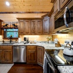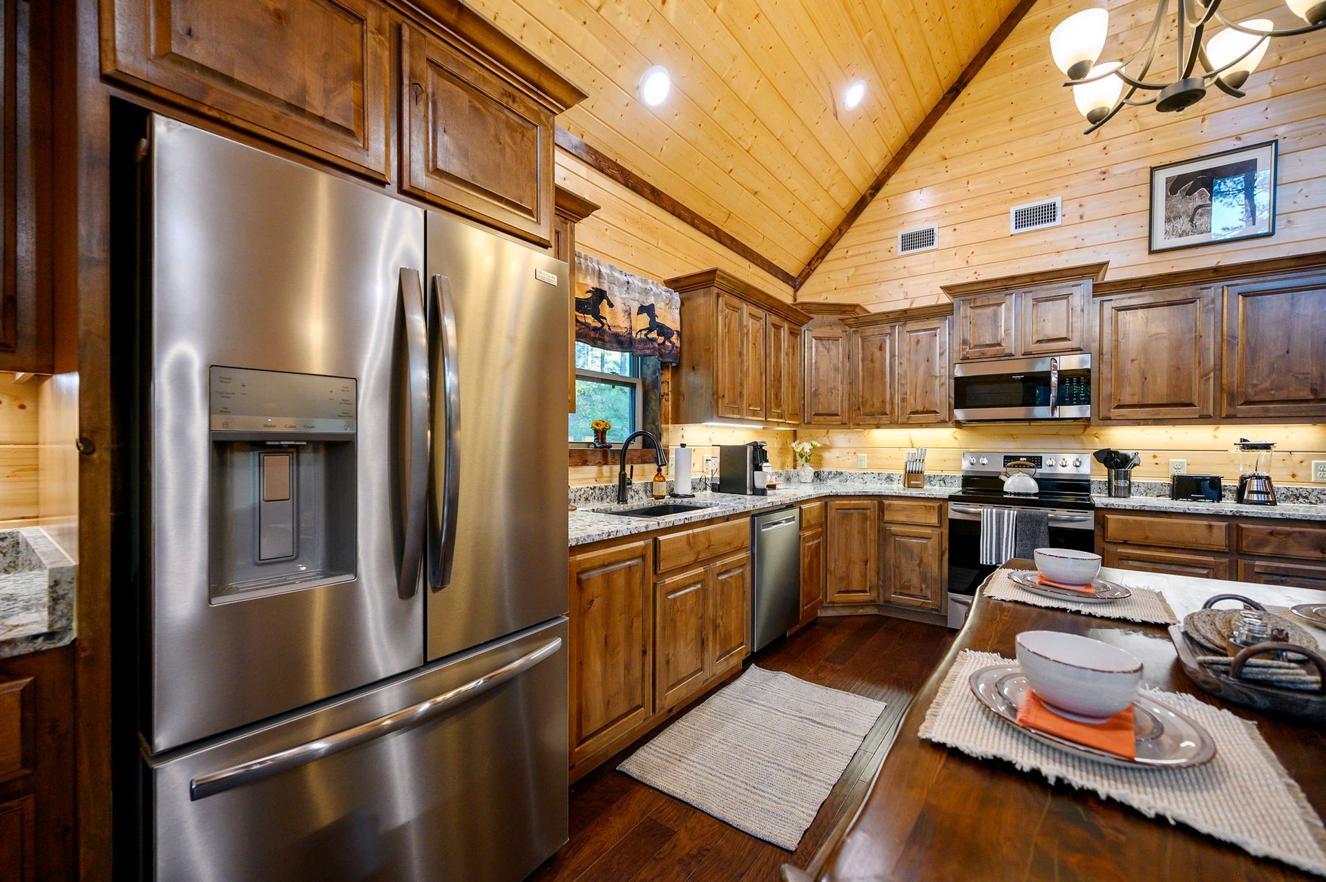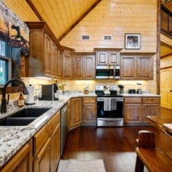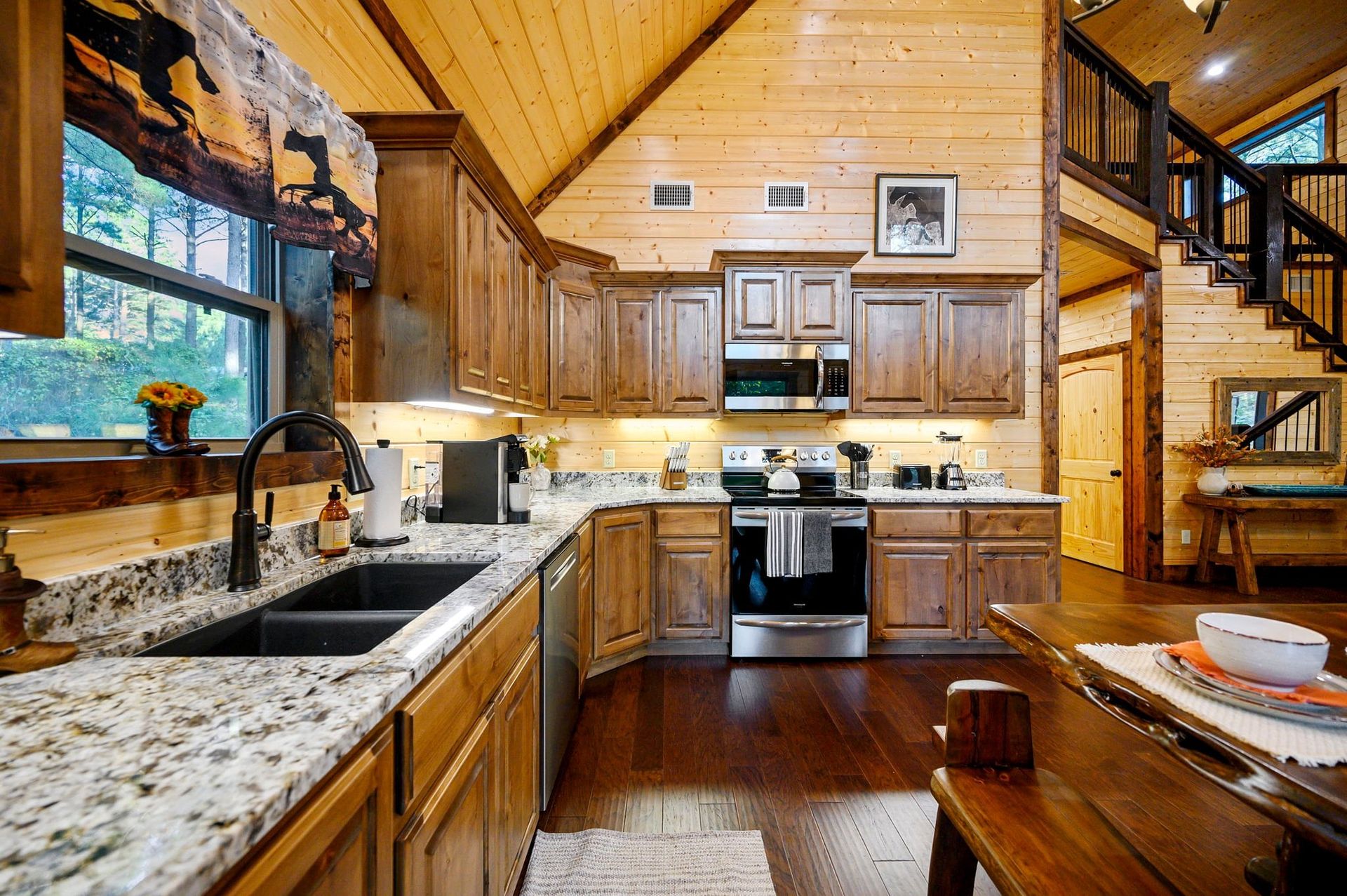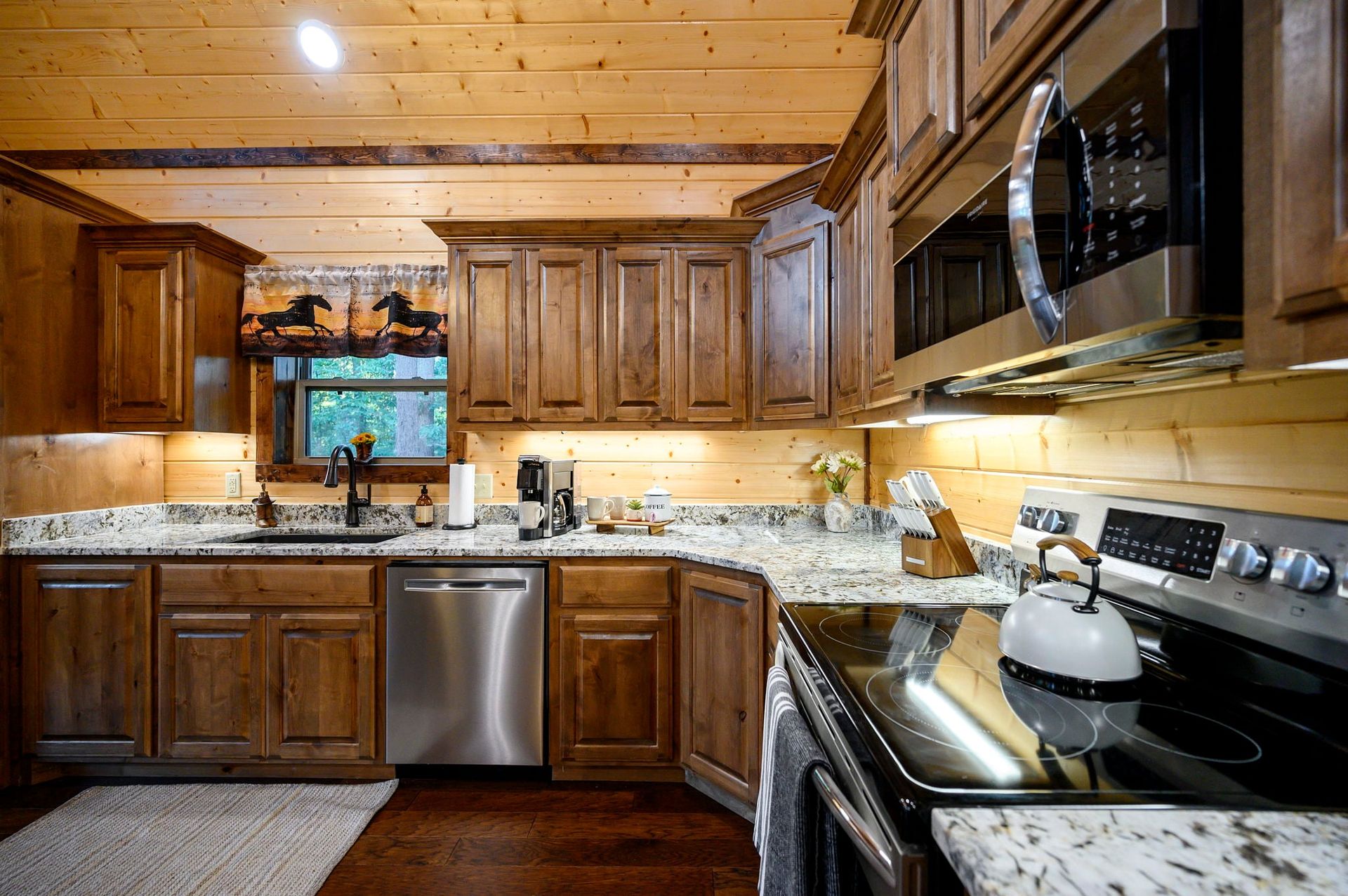 The kitchen at Silverado is fully equipped for everything from morning coffee to hearty cowboy breakfasts. Guests will find modern stainless-steel appliances, granite countertops, and all the cookware, bakeware, and utensils needed for home-style meals. The adjacent dining table, with seating for six, serves as a warm and intimate space to share laughter and stories over dinner. The charm of the Western theme extends even here, with rustic touches that make every meal feel special. Whether you’re cooking up a family feast or ordering takeout from one of Hochatown’s nearby eateries, the kitchen is designed for ease, comfort, and conversation.
