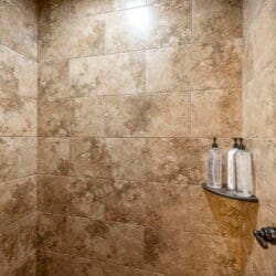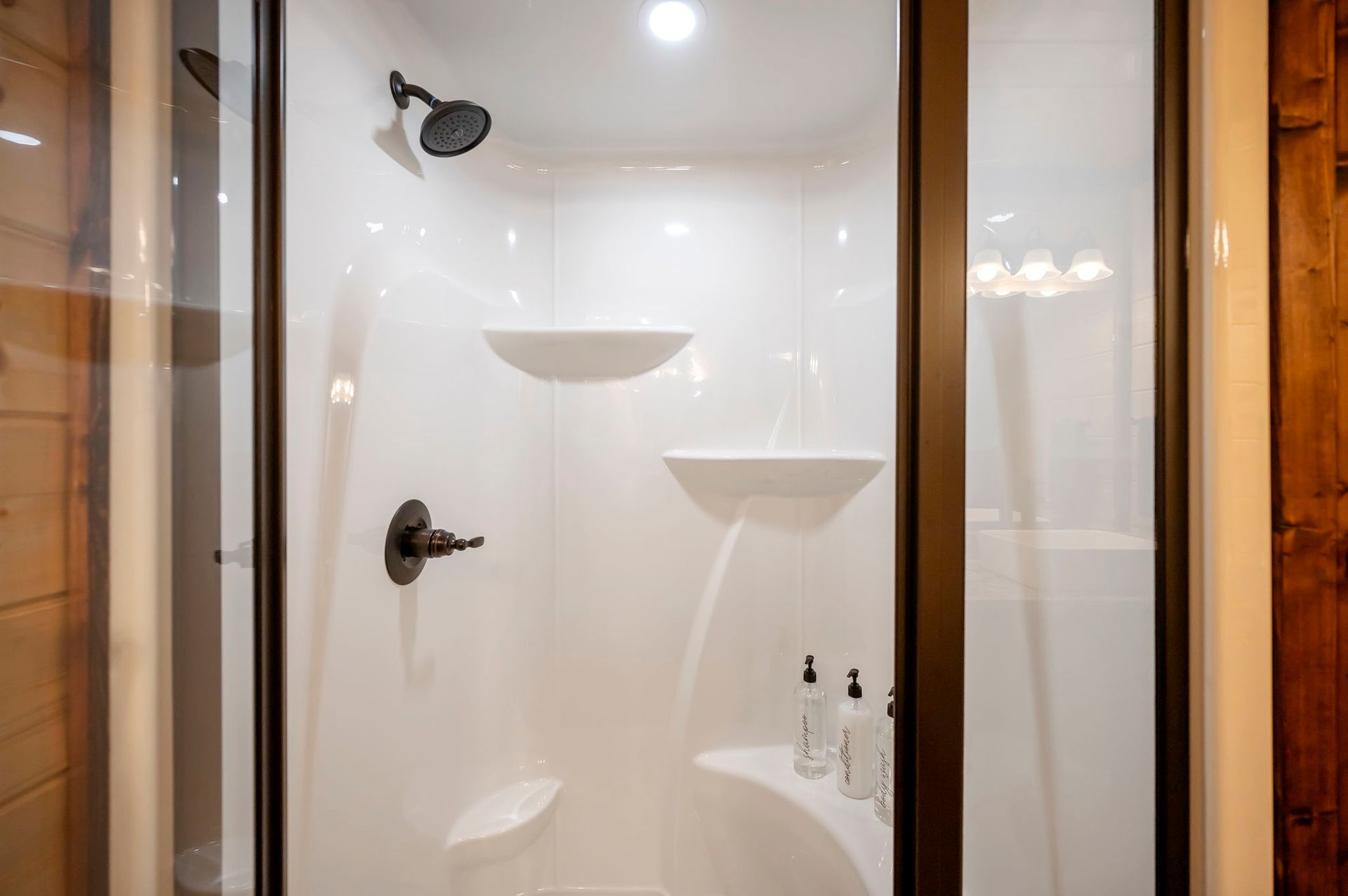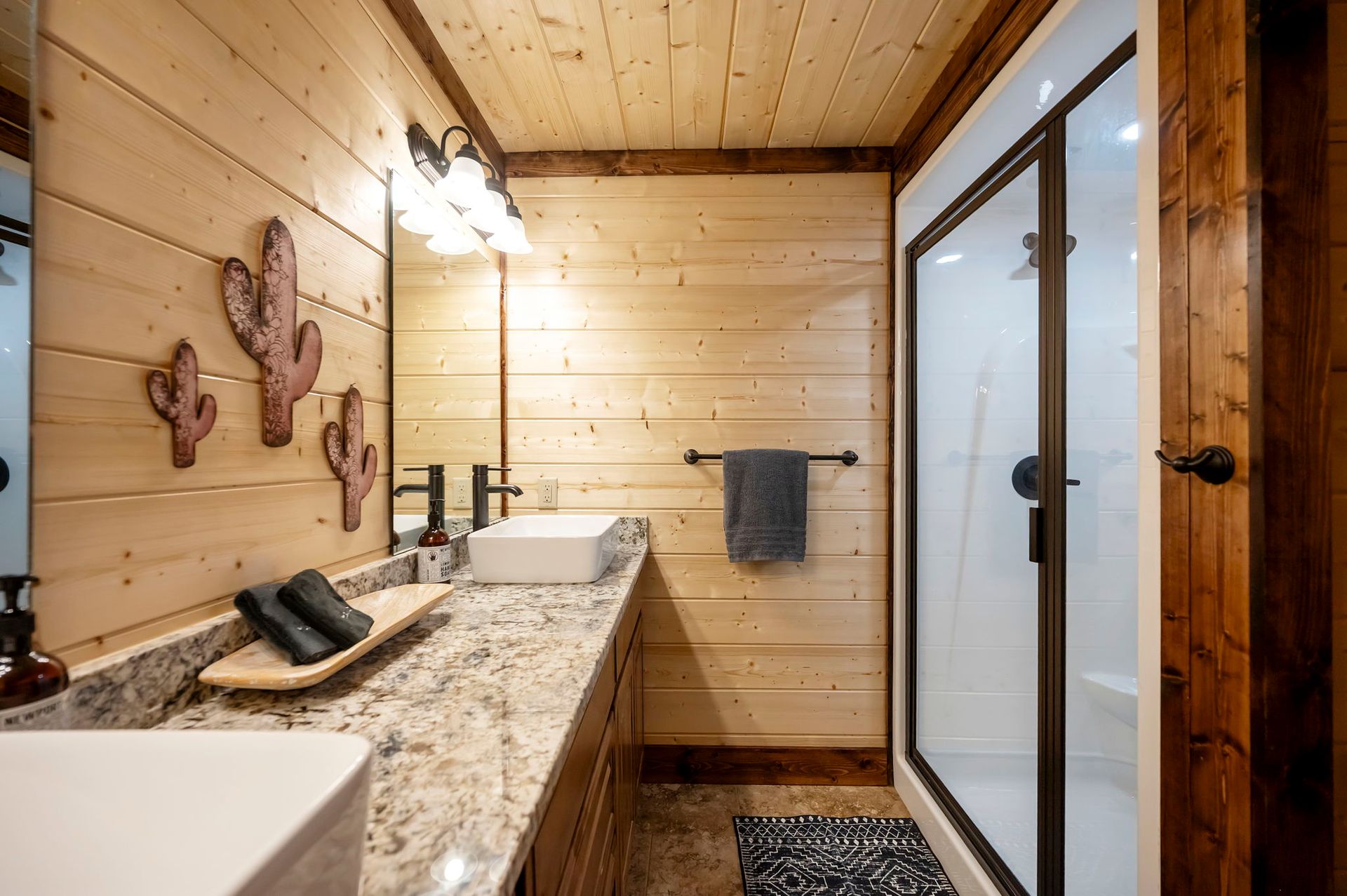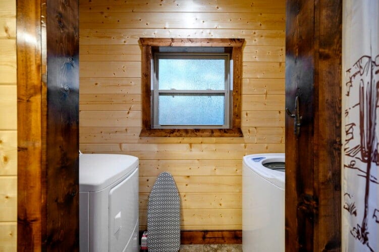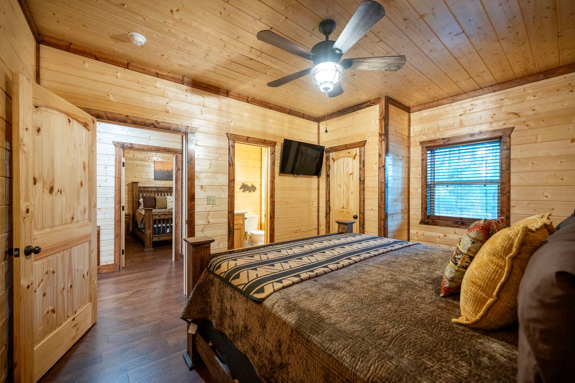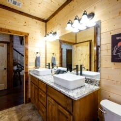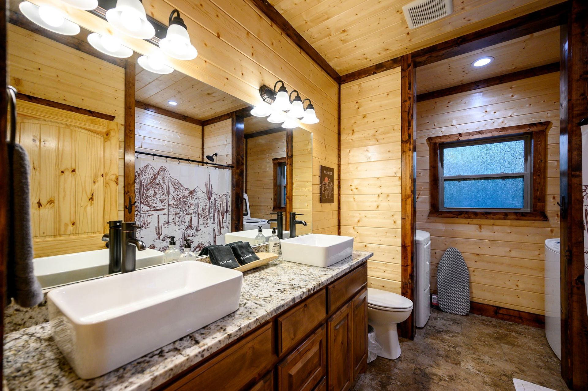 Each of the three king master suites in Silverado promises a private sanctuary of relaxation. With soft bedding, warm lighting, and custom furnishings, these rooms provide a peaceful escape from the day’s adventures. Downstairs, one king suite features convenient access to a shared bathroom with a shower-tub combo and a washer-dryer, perfect for longer stays. The second downstairs master boasts an ensuite bath with a spacious walk-in shower, while the upstairs master suite feels like a luxury hideaway, complete with a double vanity and large shower. Each room is curated for serenity, ensuring that every guest enjoys restful nights and refreshing mornings.