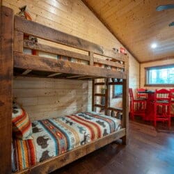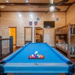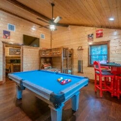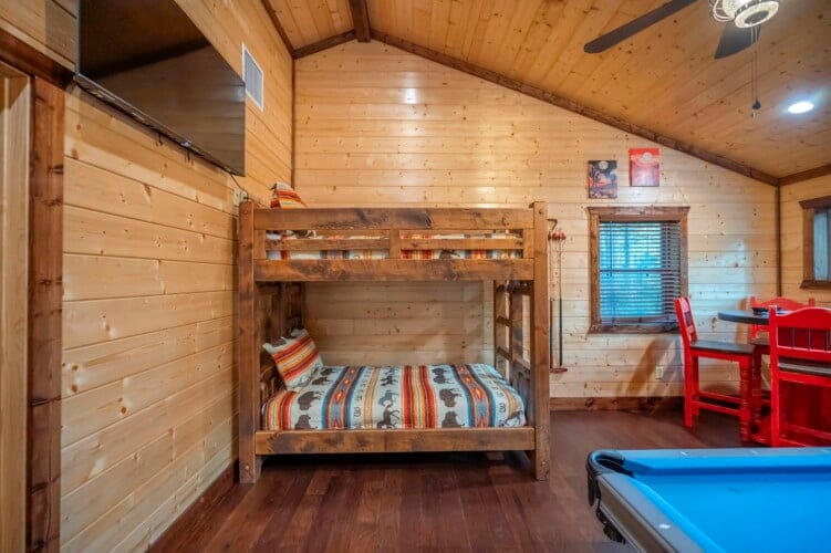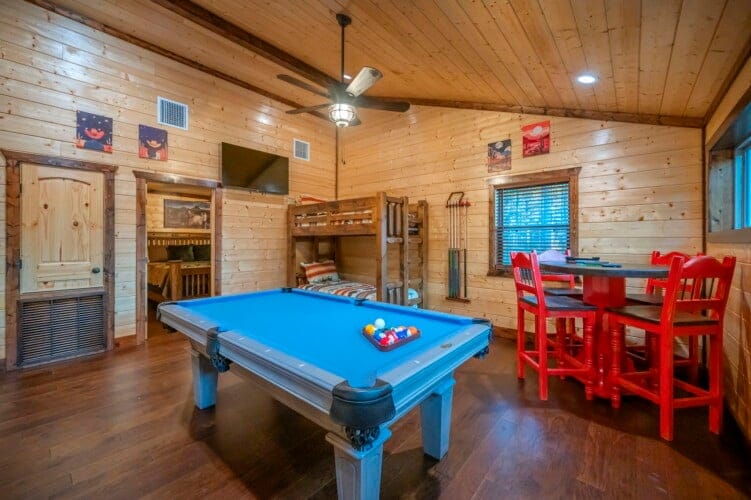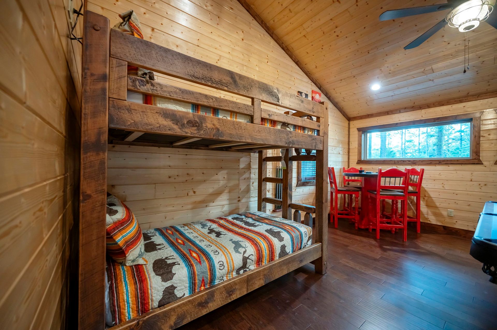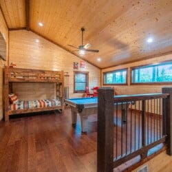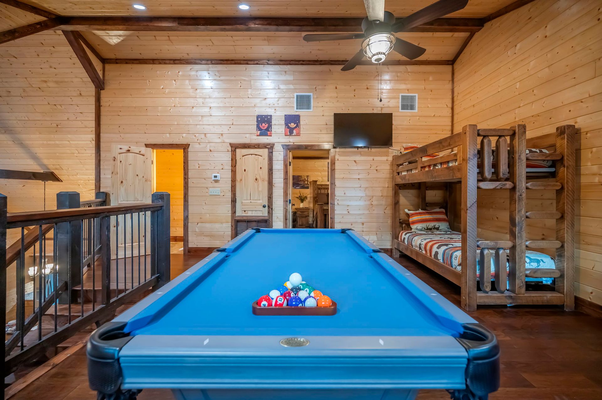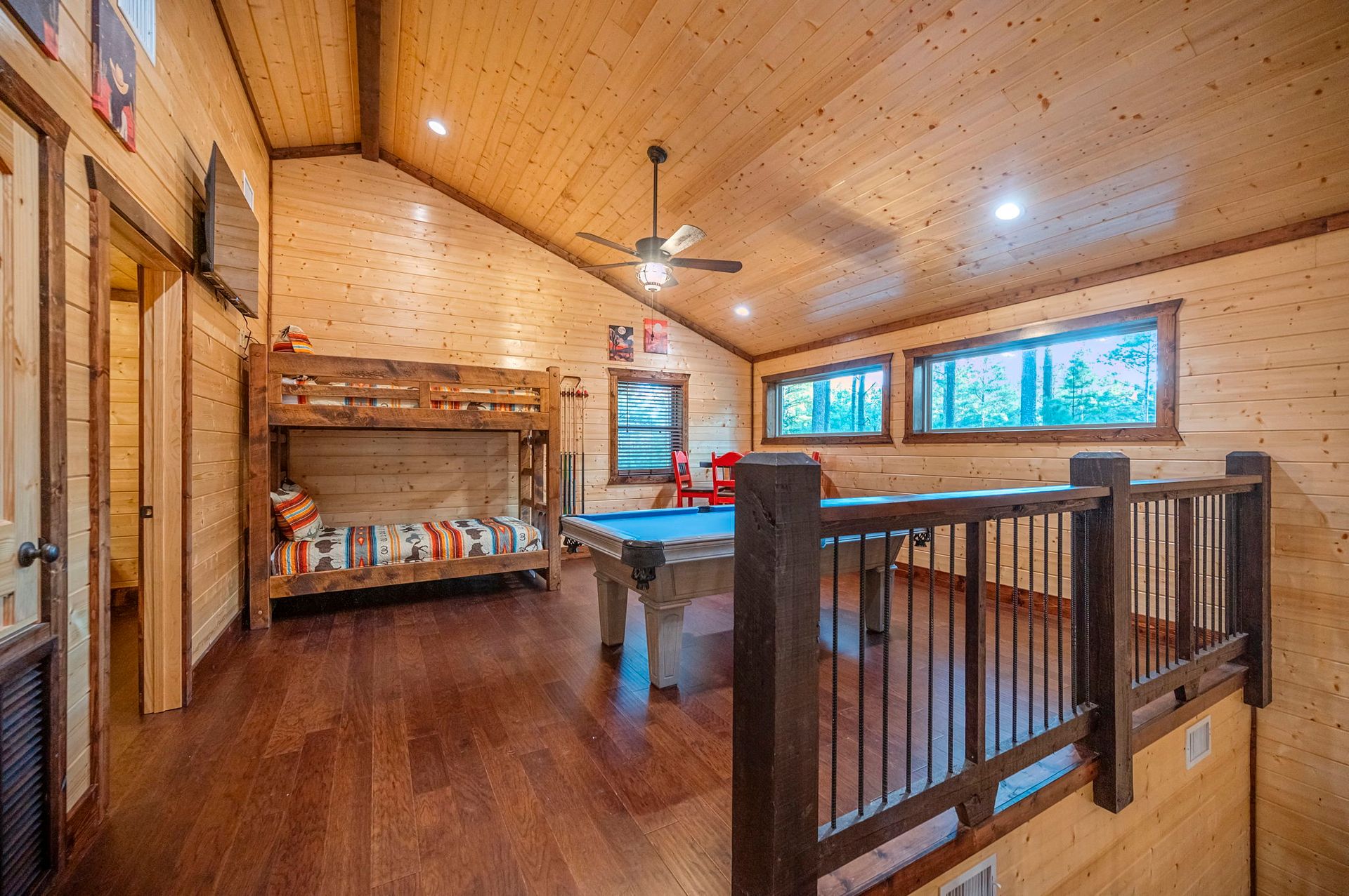 The loft area at Silverado adds a touch of fun and energy to the cabin’s laid-back atmosphere. With a pool table, bar-height seating, and a twin-over-twin bunk, it’s the perfect spot for friendly games or simply lounging with a drink in hand. The loft overlooks the main living area, keeping everyone connected while still offering space to spread out. Whether kids are competing over a game of pool or adults are relaxing with laughter echoing through the cabin, the loft turns downtime into delight.