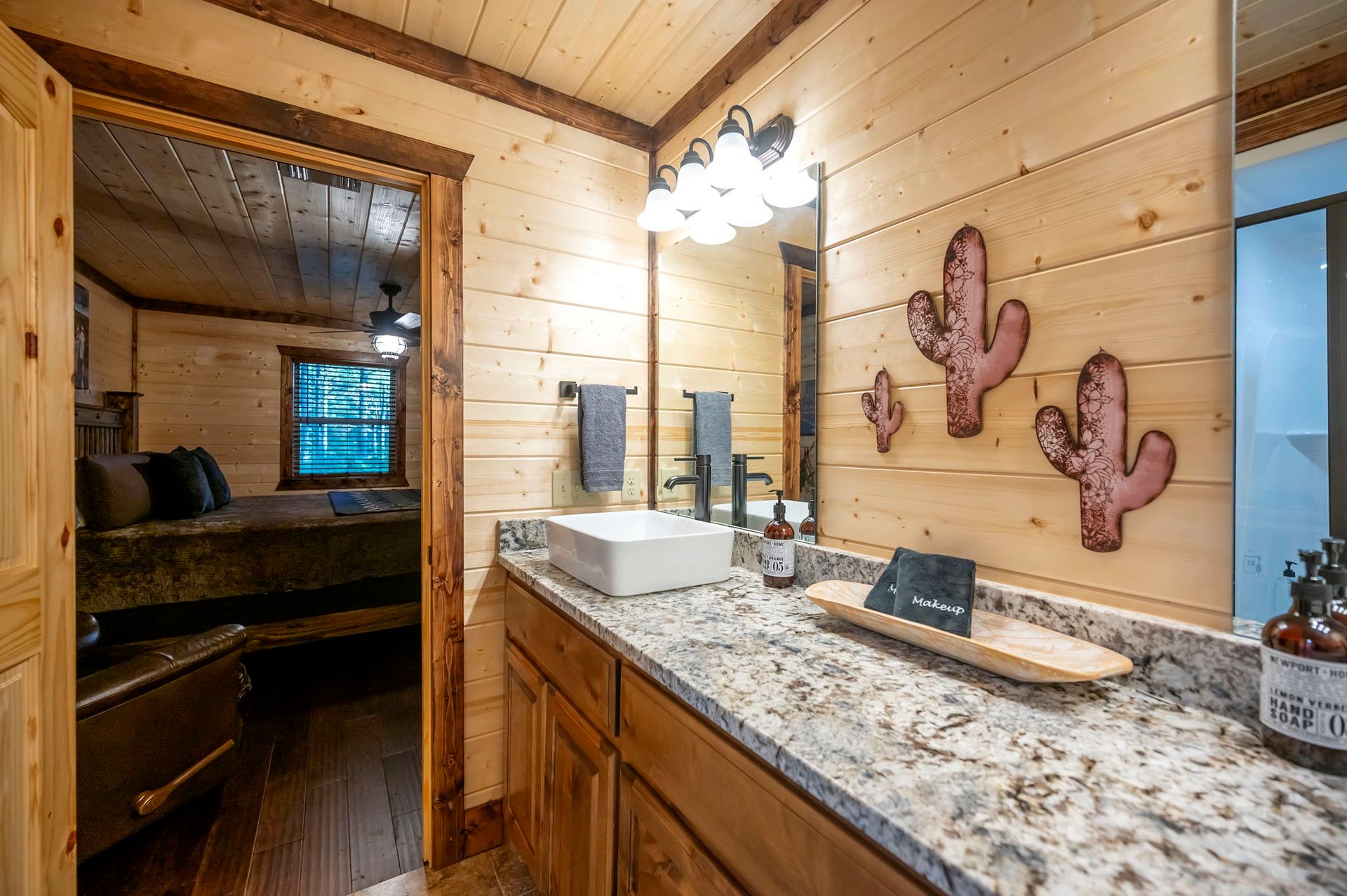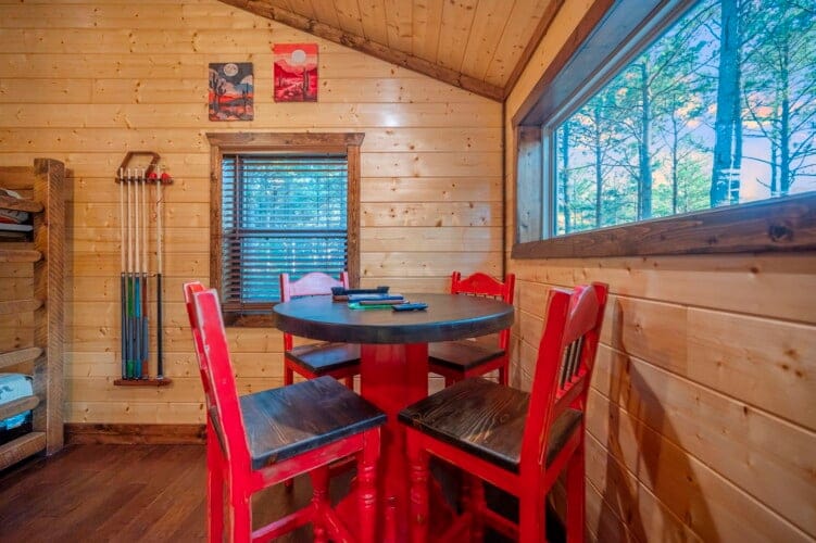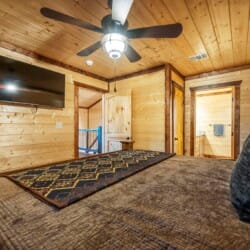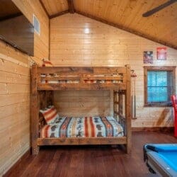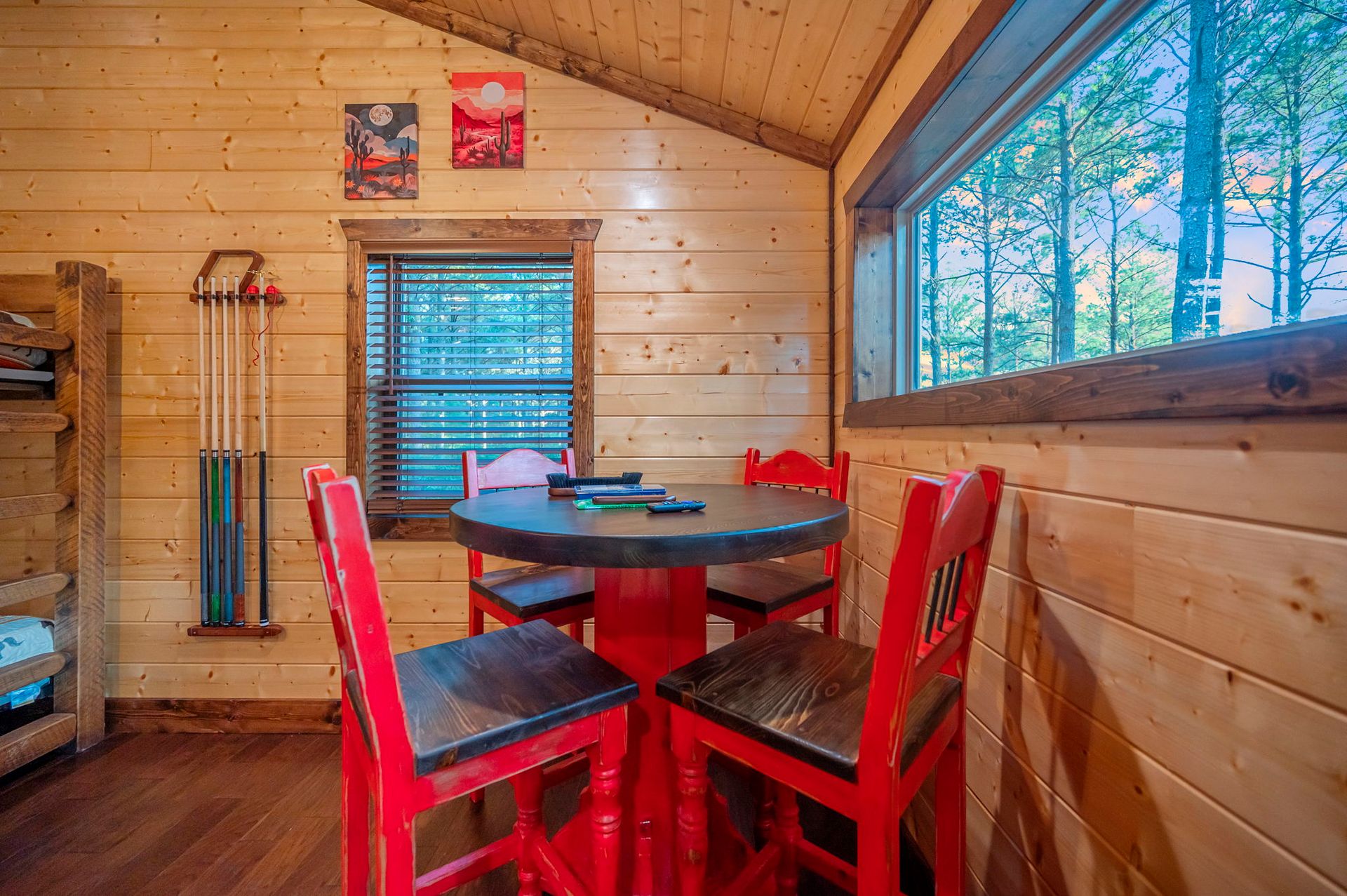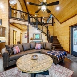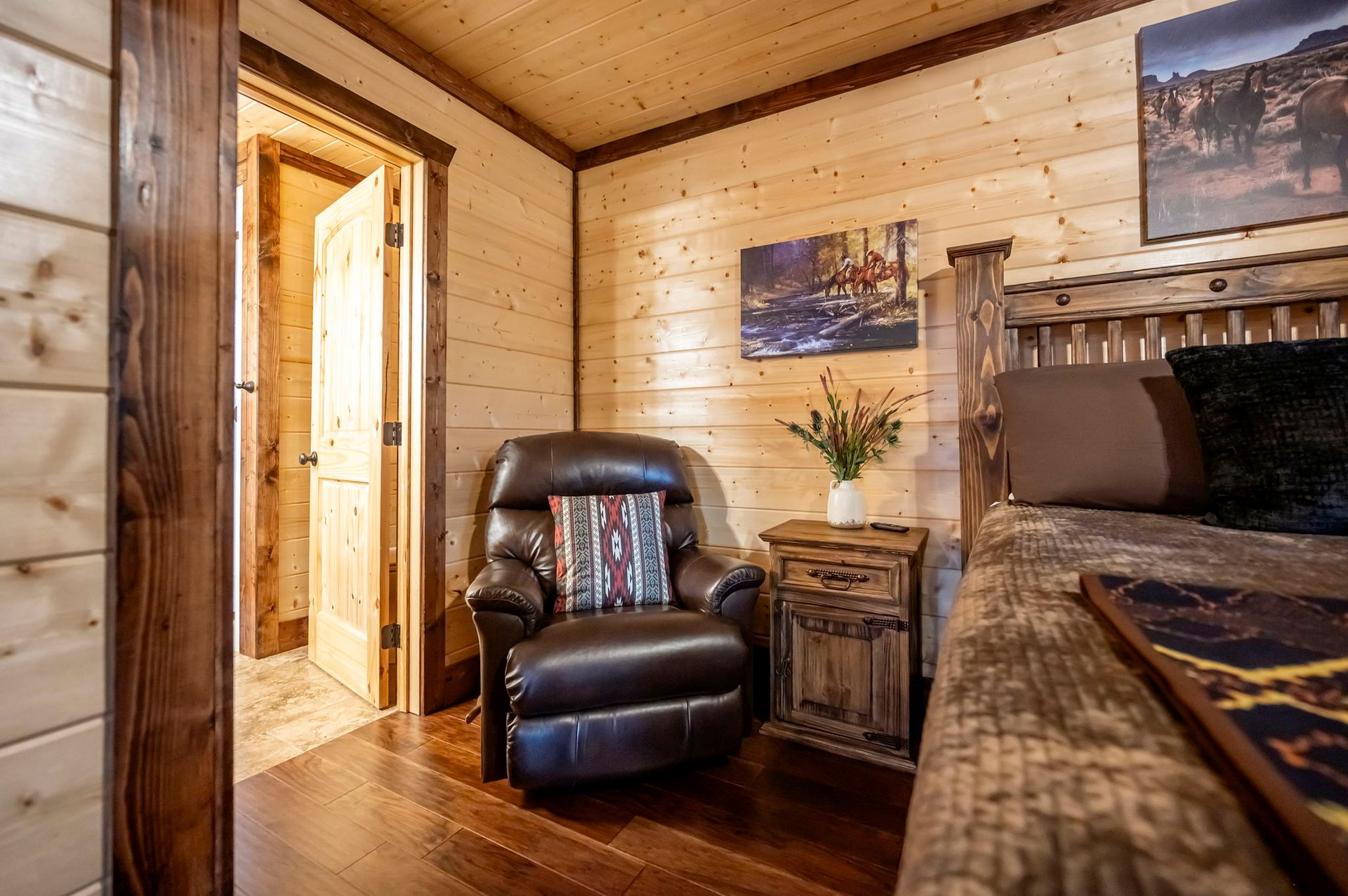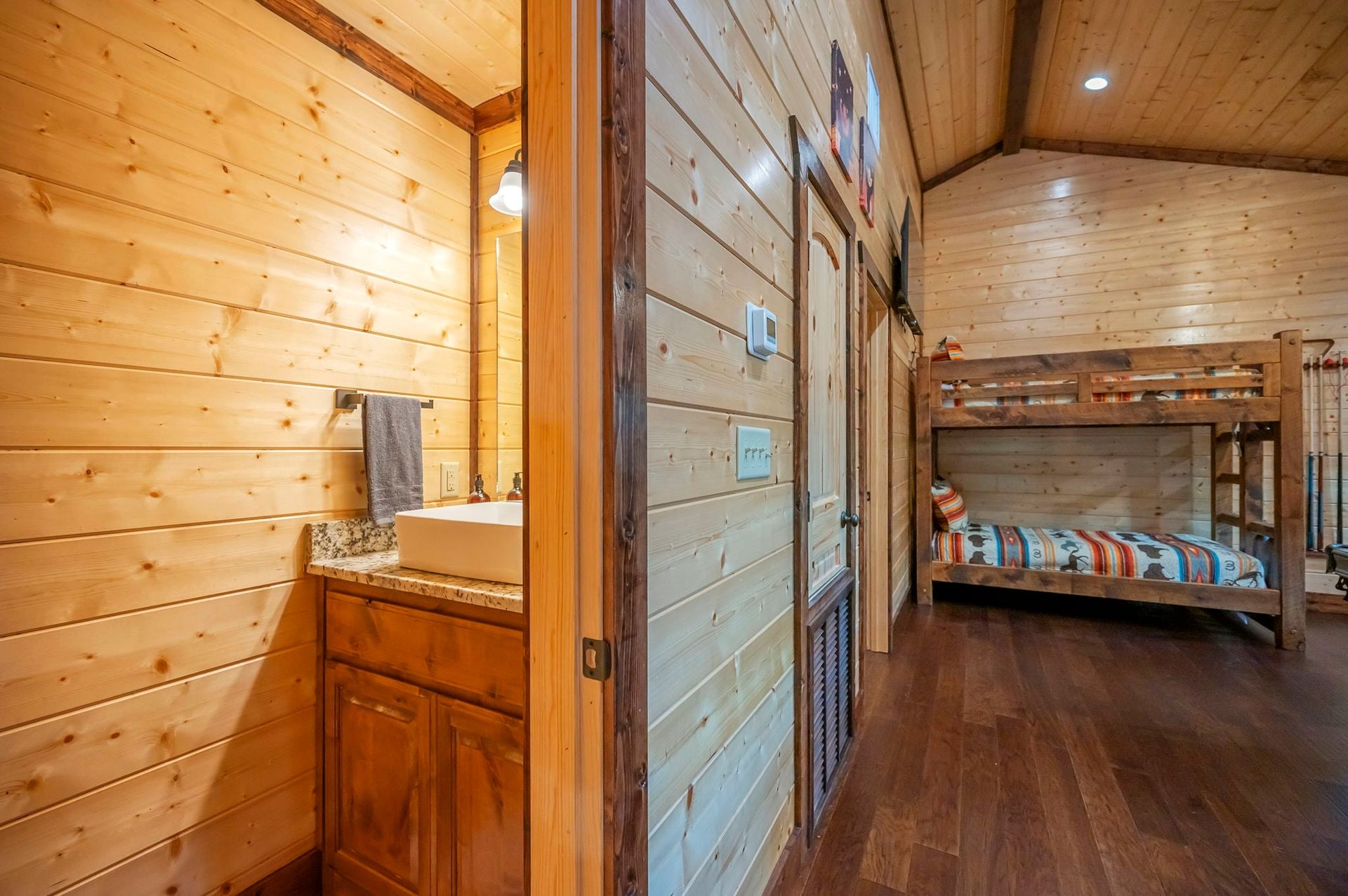 The loft area at Silverado adds a touch of fun and energy to the cabin’s laid-back atmosphere. With a pool table, bar-height seating, and a twin-over-twin bunk, it’s the perfect spot for friendly games or simply lounging with a drink in hand. The loft overlooks the main living area, keeping everyone connected while still offering space to spread out. Whether kids are competing over a game of pool or adults are relaxing with laughter echoing through the cabin, the loft turns downtime into delight.